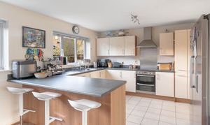 Accommodation comprises an entrance hall with understairs storage. Off the hallway is a large Study with two front facing windows, a Living Room with two further front windows and glazed double doors opening to the kitchen/diner. The kitchen comprises a range of base and wall units, a breakfast bar, 1 ½ stainless steel sink with mixer tap, integrated dishwasher, stainless steel oven with induction hob and extractor hood with splash back. Space for freestanding fridge and freezer, and tiled flooring. The dining area has ample space for a 6-8 seater dining table, a sofa, and has French doors to the garden. Finally, there is a utility with further base and wall units, stainless steel sink, space for two white goods, and door to garden.