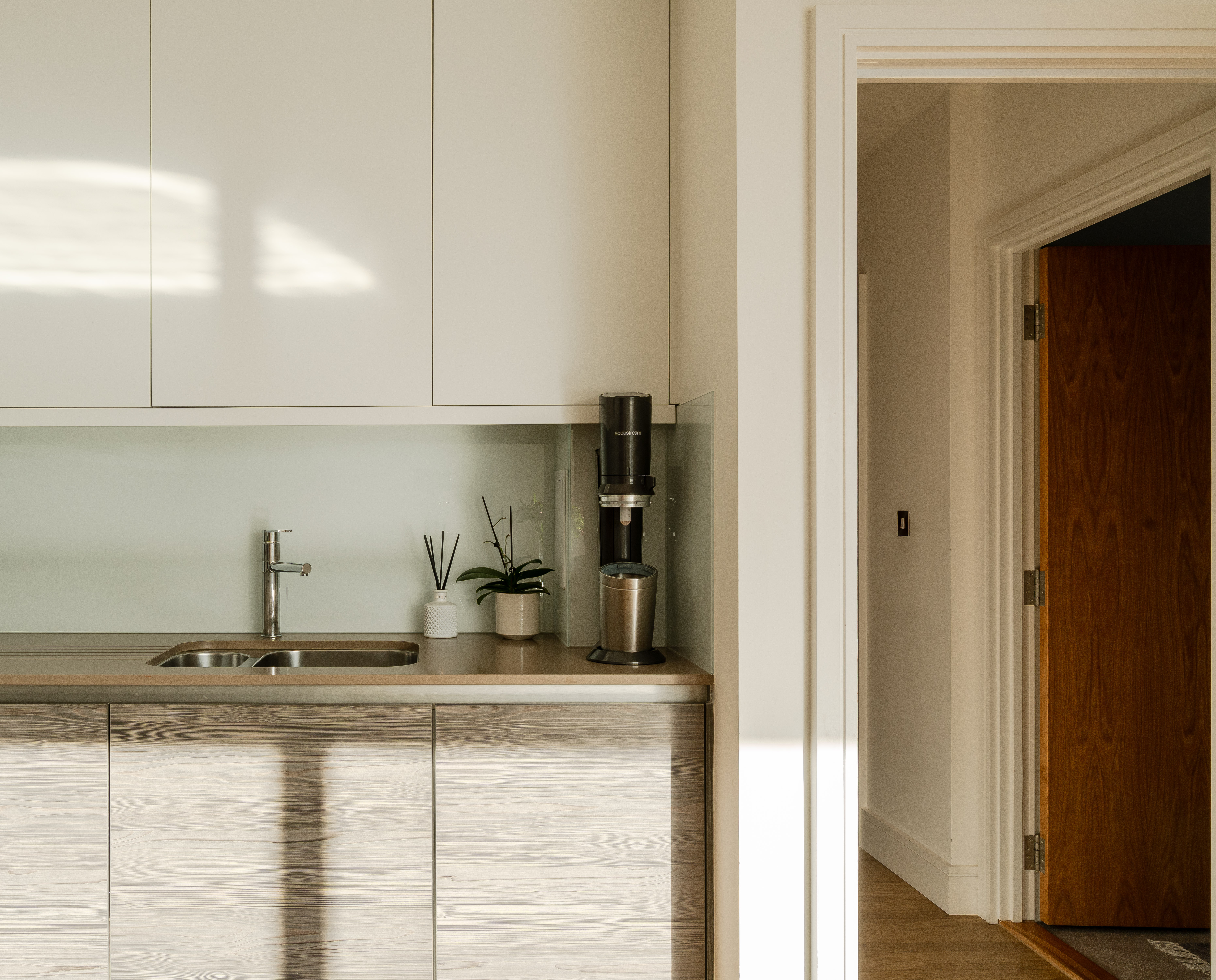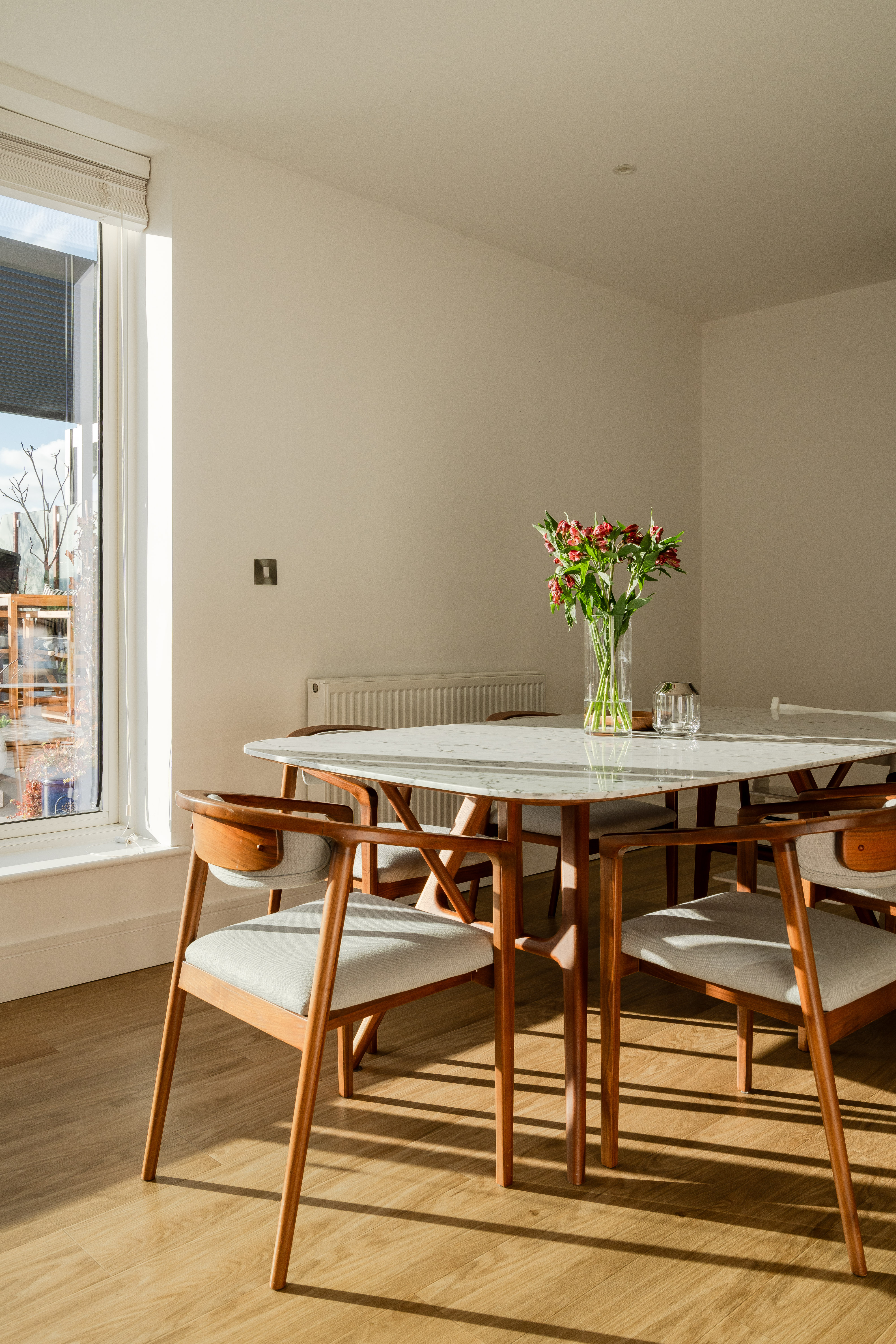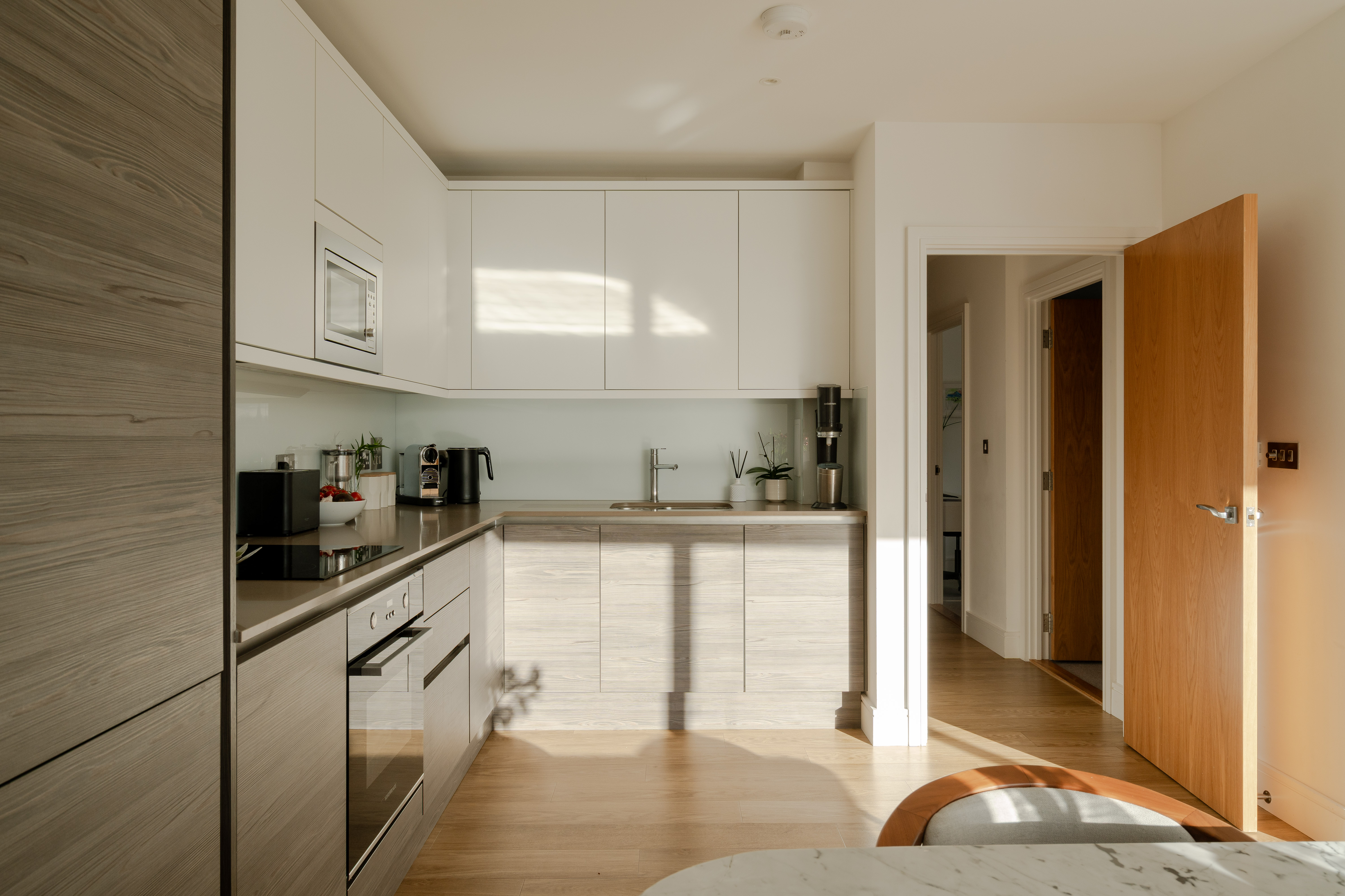 Brightened by a combination of ceiling spots and abundant natural light filtered through Venetian blinds, the well-planned layout creates plenty of room for separate dining and seating areas. Meanwhile, the Magnet kitchen combines stylish classic white and wood-effect cabinetry with integrated Nordmende appliances, including a fridge and freezer, oven, electric hob and microwave. Complementing stone worktops, a glass splashback, and a stainless steel 1.5-bowl sink complete the look.
