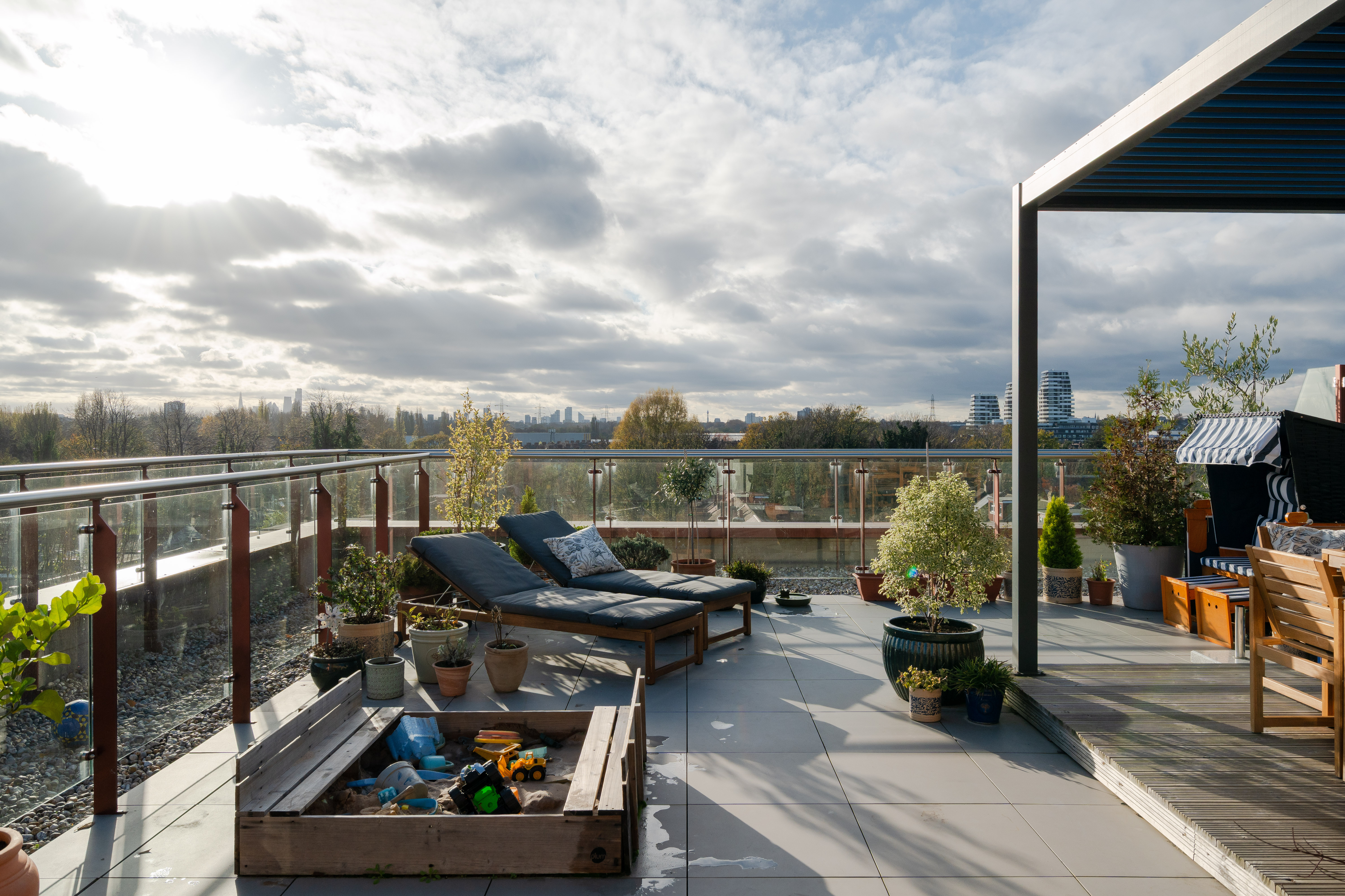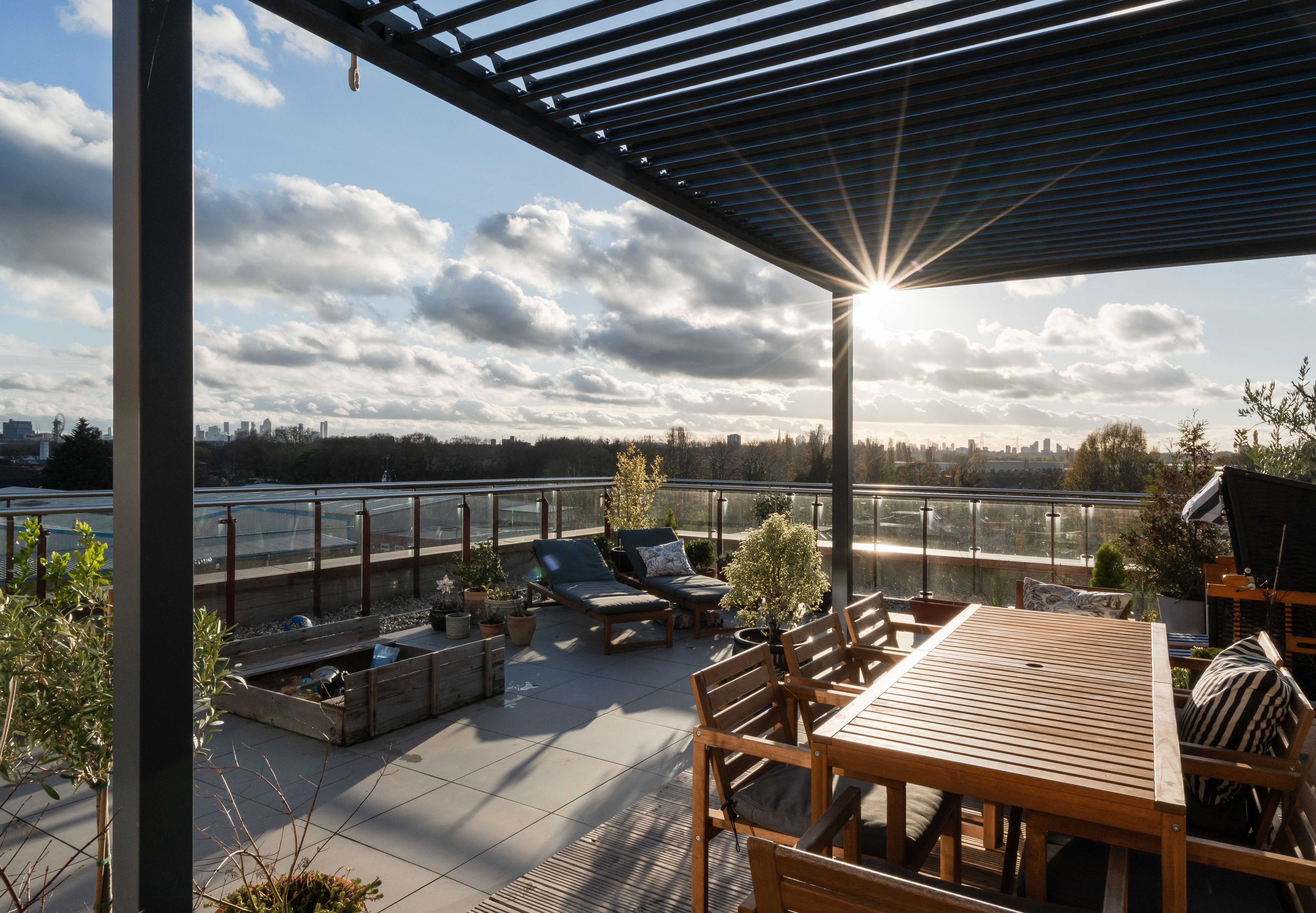 With an aspect stretching from the south-east round to the west, the terrace enjoys sunlight for most of the day, making it a wonderfully versatile outdoor space backdropped by London landmarks. It has been a safe, year-round play area for the children, and in the warmer months, it becomes an inviting spot for relaxed meals and entertaining late into the evening. The development also benefits from well-kept, fully enclosed communal gardens and bike storage.