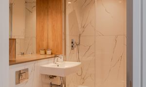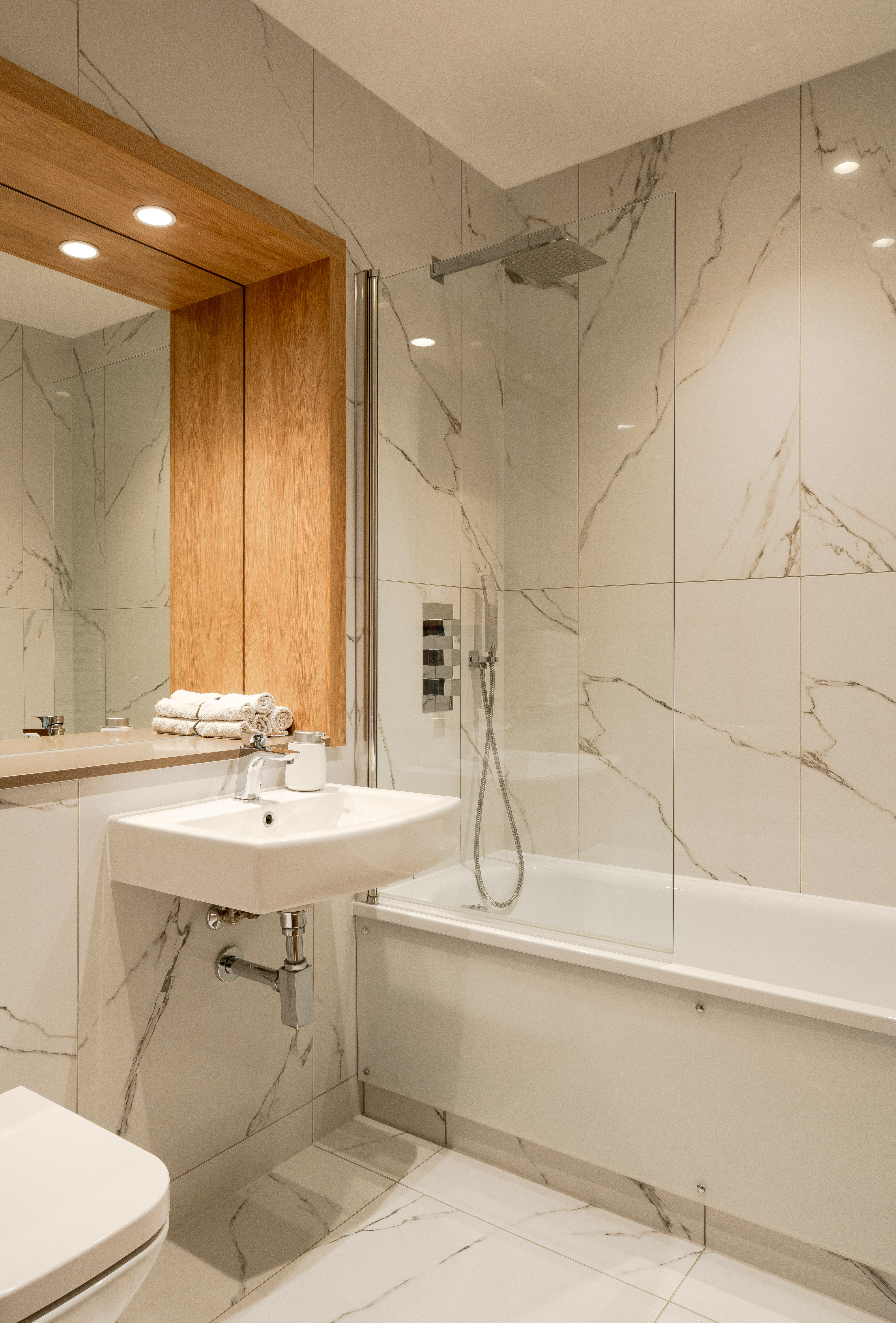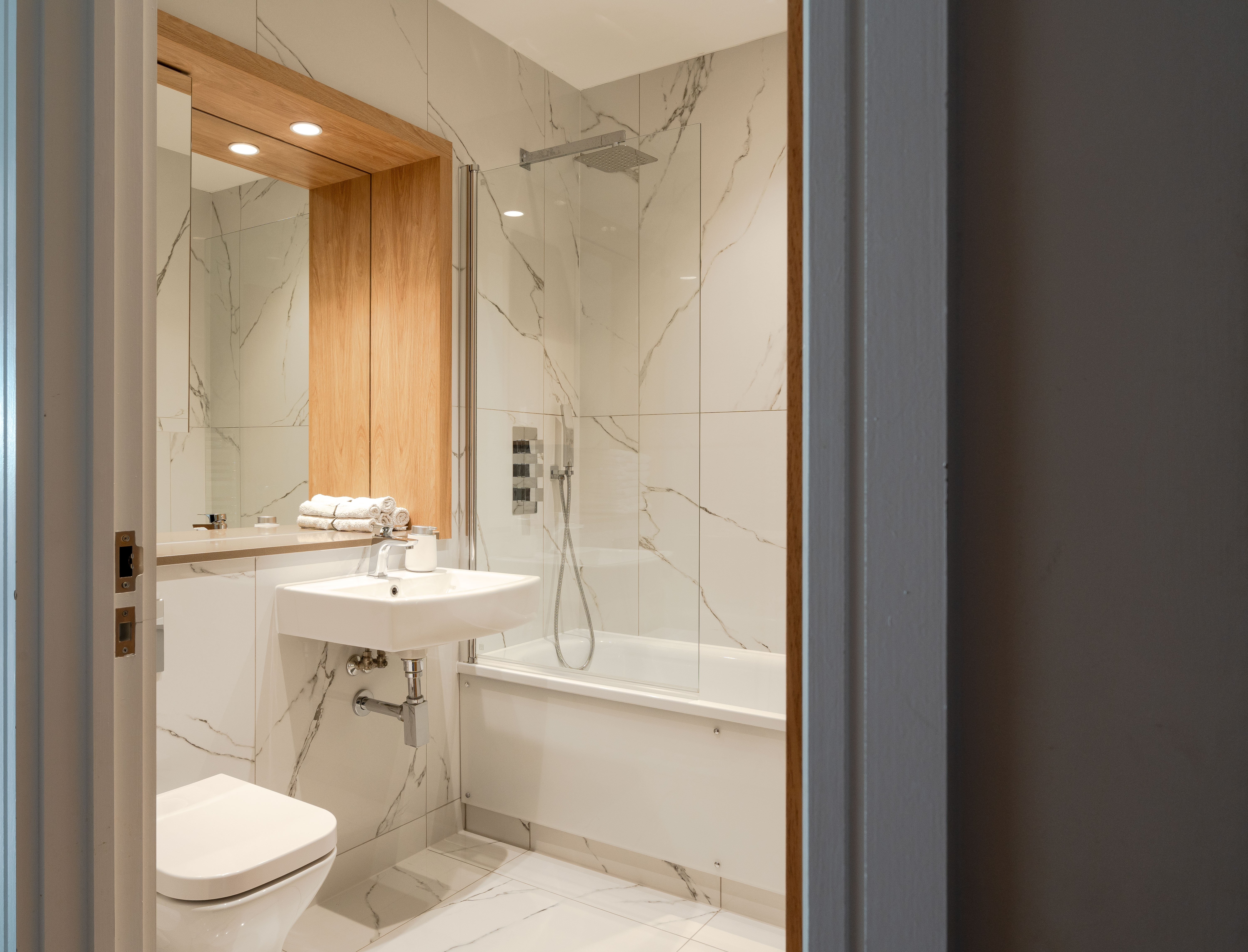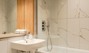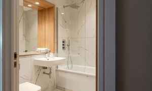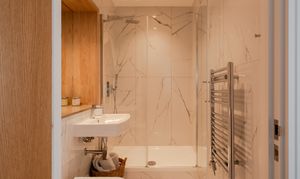 The primary en suite and the family bathroom feature luxe porcelain marble-effect tiling throughout, stone vanity countertops to match the kitchen, and chrome heated towel rails. Fitted with Bagnodesign brassware, the en suite has a double rainfall shower with a separate handheld attachment, with the same set-up above the glass-screened bath in the family suite. Both have a wall-mounted basin, a back-to-wall loo with a chrome flush plate, and a mirrored cabinet.