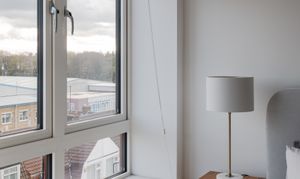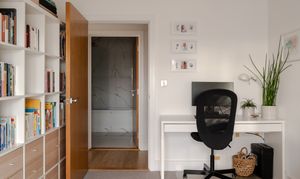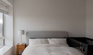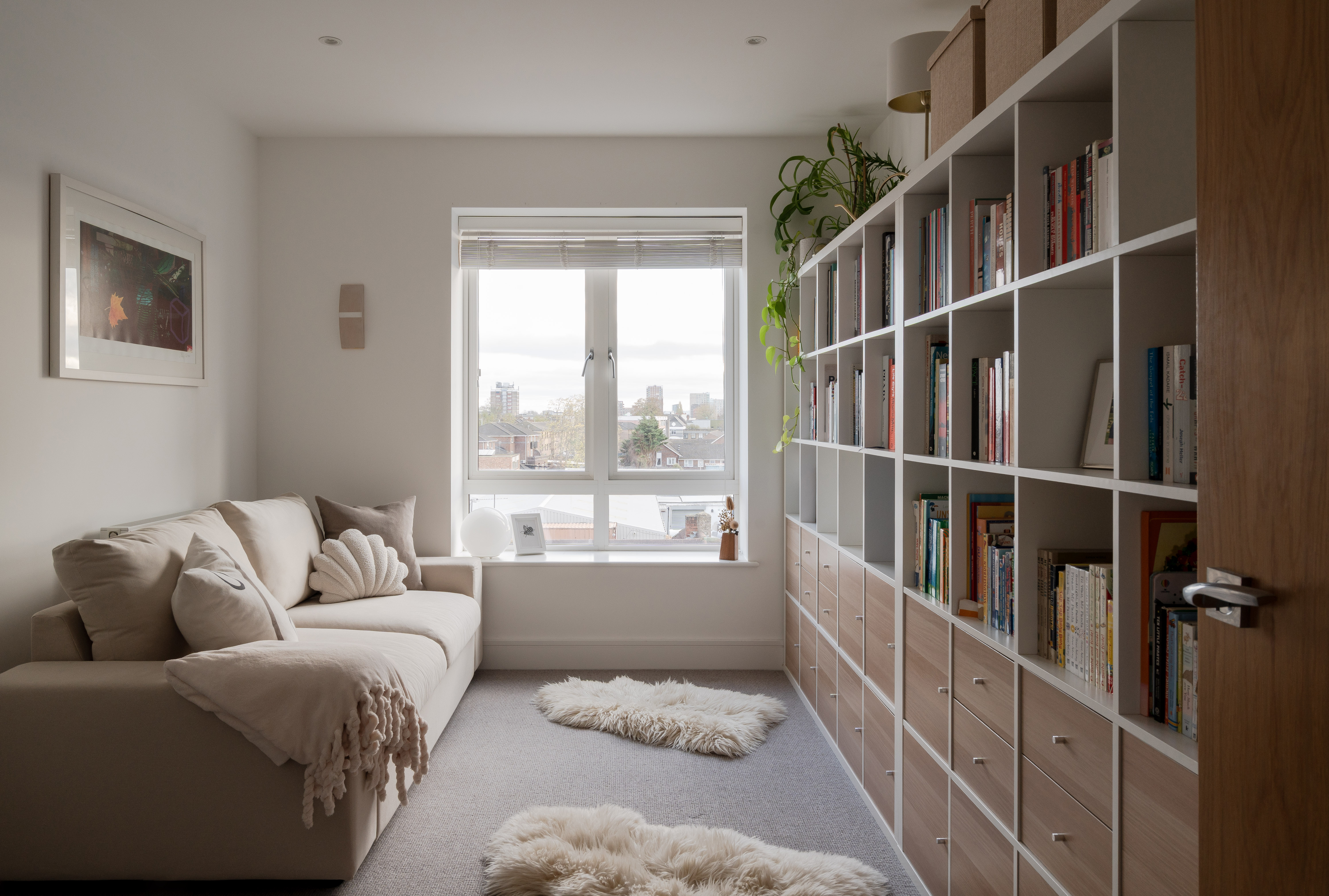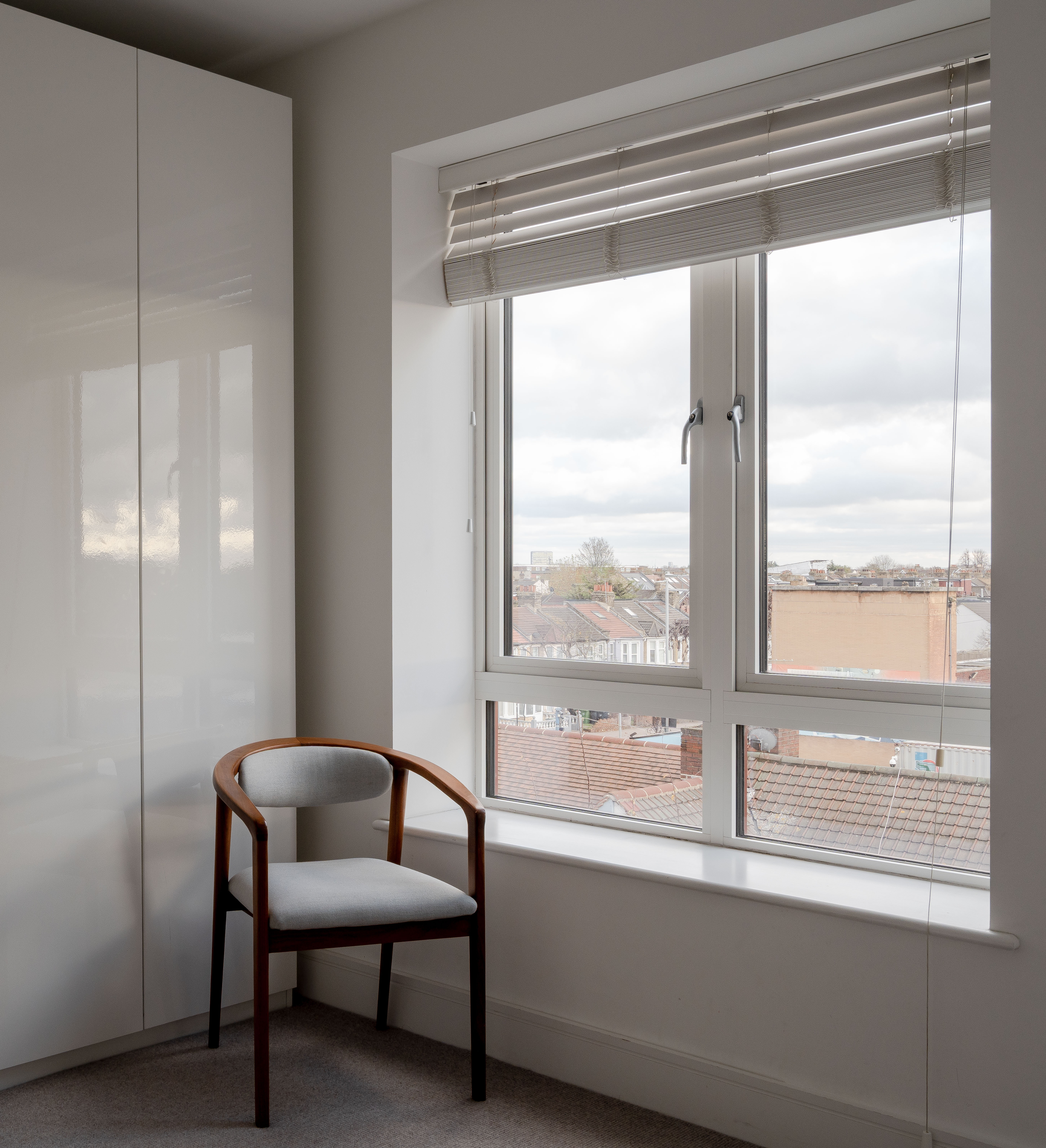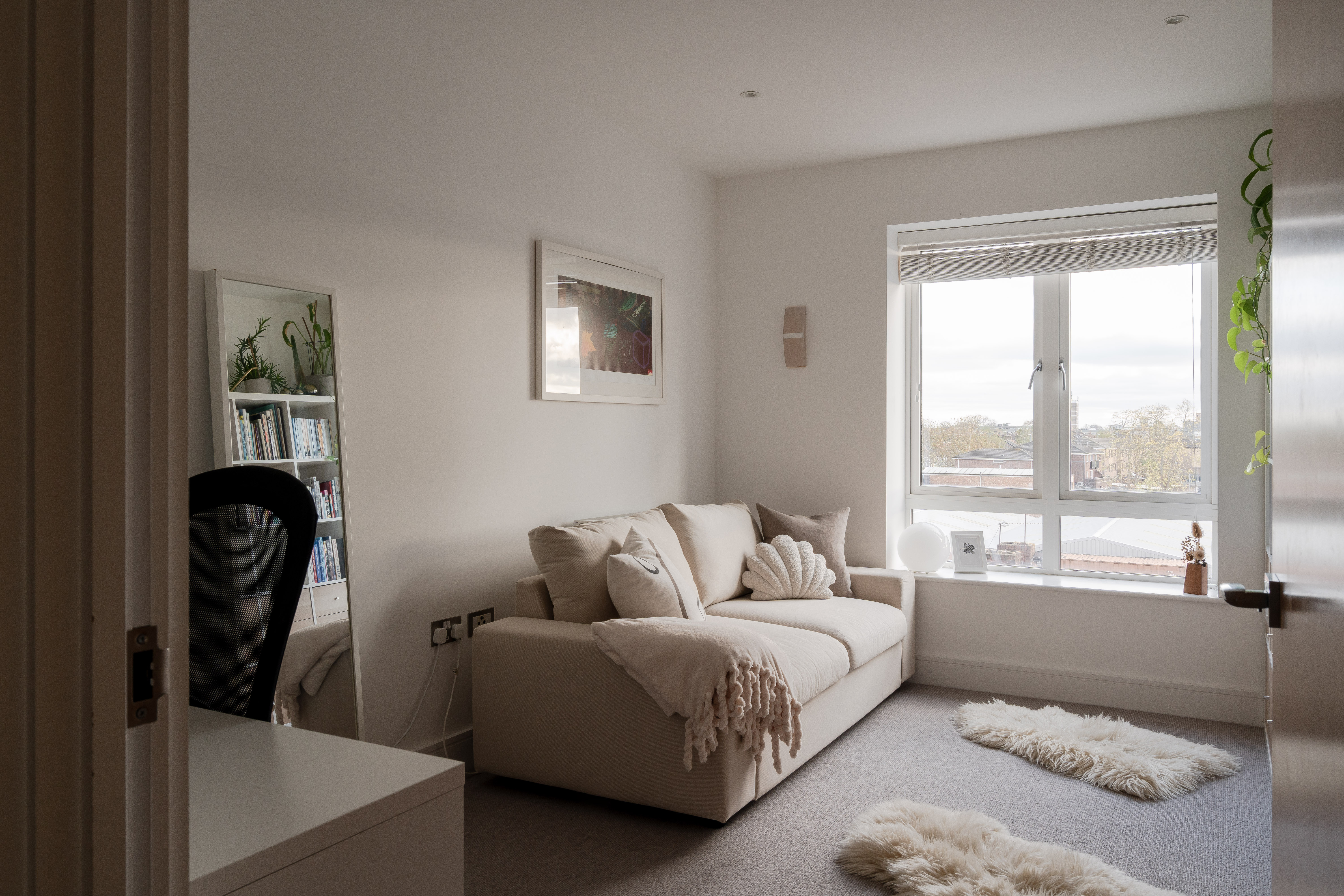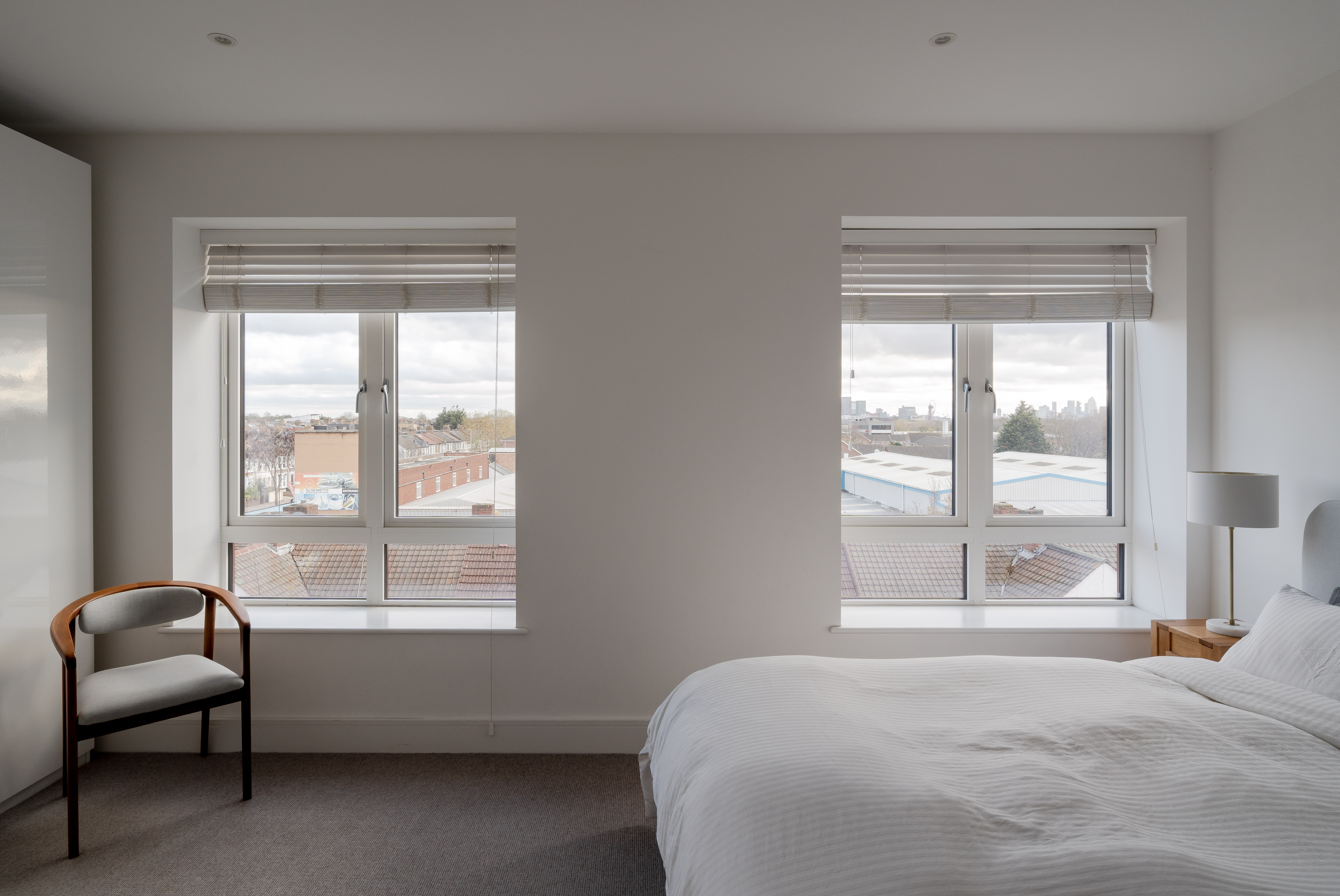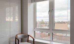 The three spot-lit double bedrooms – all fitted with neutral carpets – lie just off the hallway. The primary suite has two expansive casement windows facing the city skyline, with Venetian blinds ensuring total privacy. The remaining two doubles also enjoy fabulous iconic city views from large windows with fitted blinds, plus space for wardrobes and furniture. White walls switch to a lovely warm grey in the third bedroom. It’s currently used as a child’s room, but you could repurpose it as a cosy home office if desired.