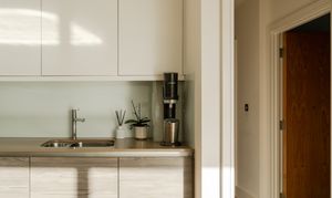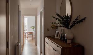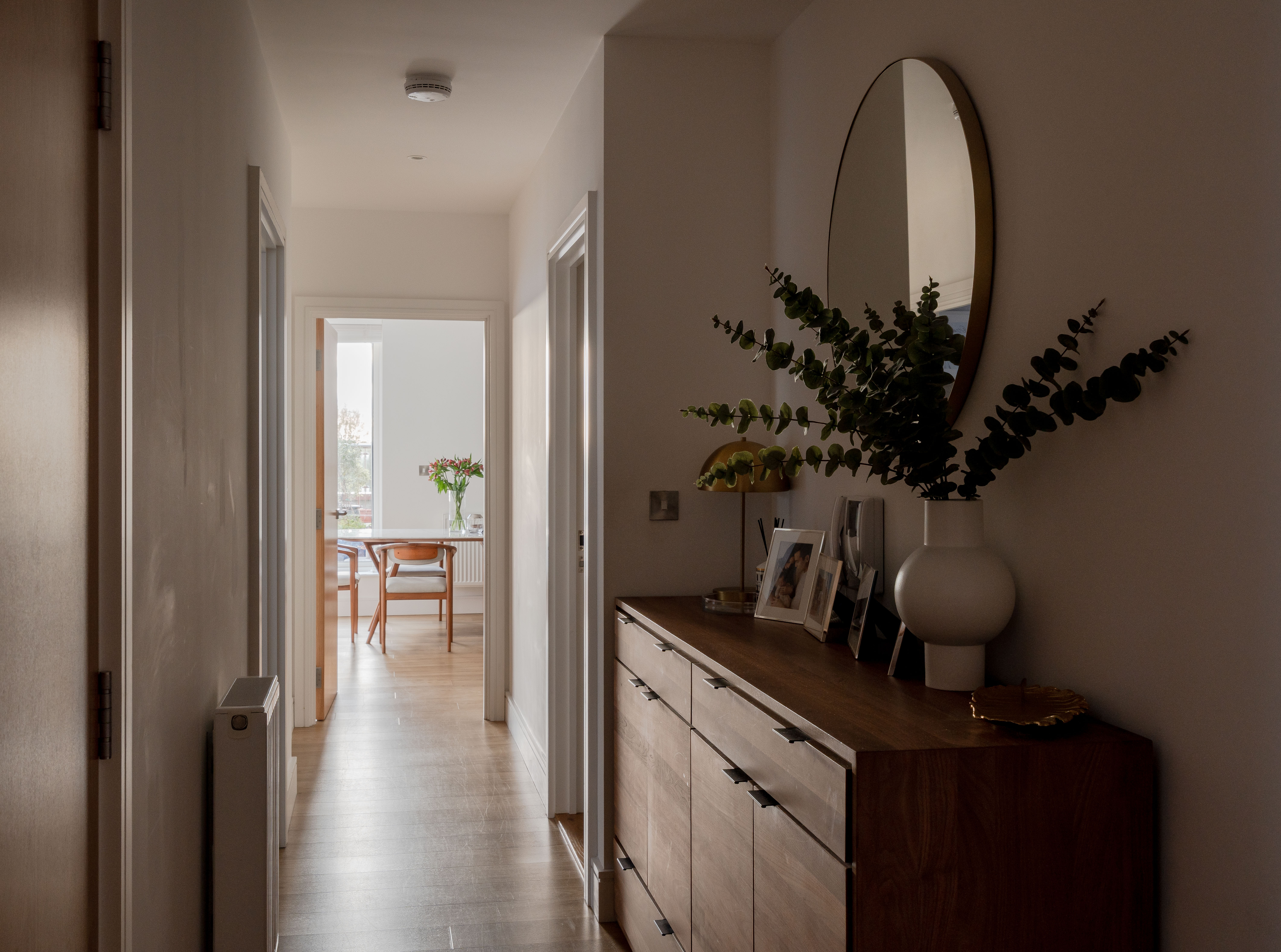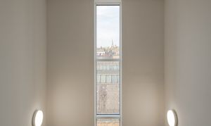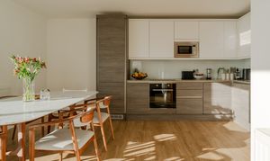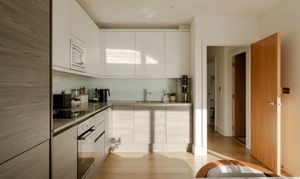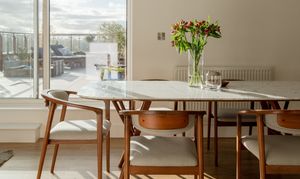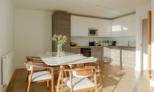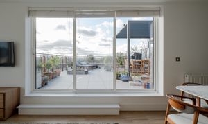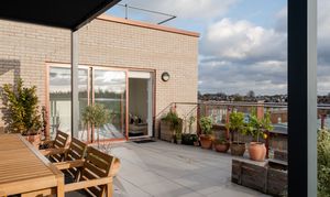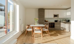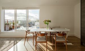 Step through into the hallway, where there’s in-built storage for coats and shoes along with plumbing and electrics for a washing machine; the boiler is housed here too. The wooden flooring and neutral walls coordinate this spacious entrance with the open-plan dining kitchen and living area beyond, which boasts a show-stopping view of the city skyline through a large casement window and sliding doors leading to the rooftop terrace.