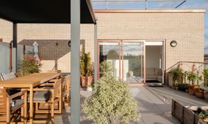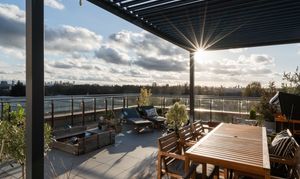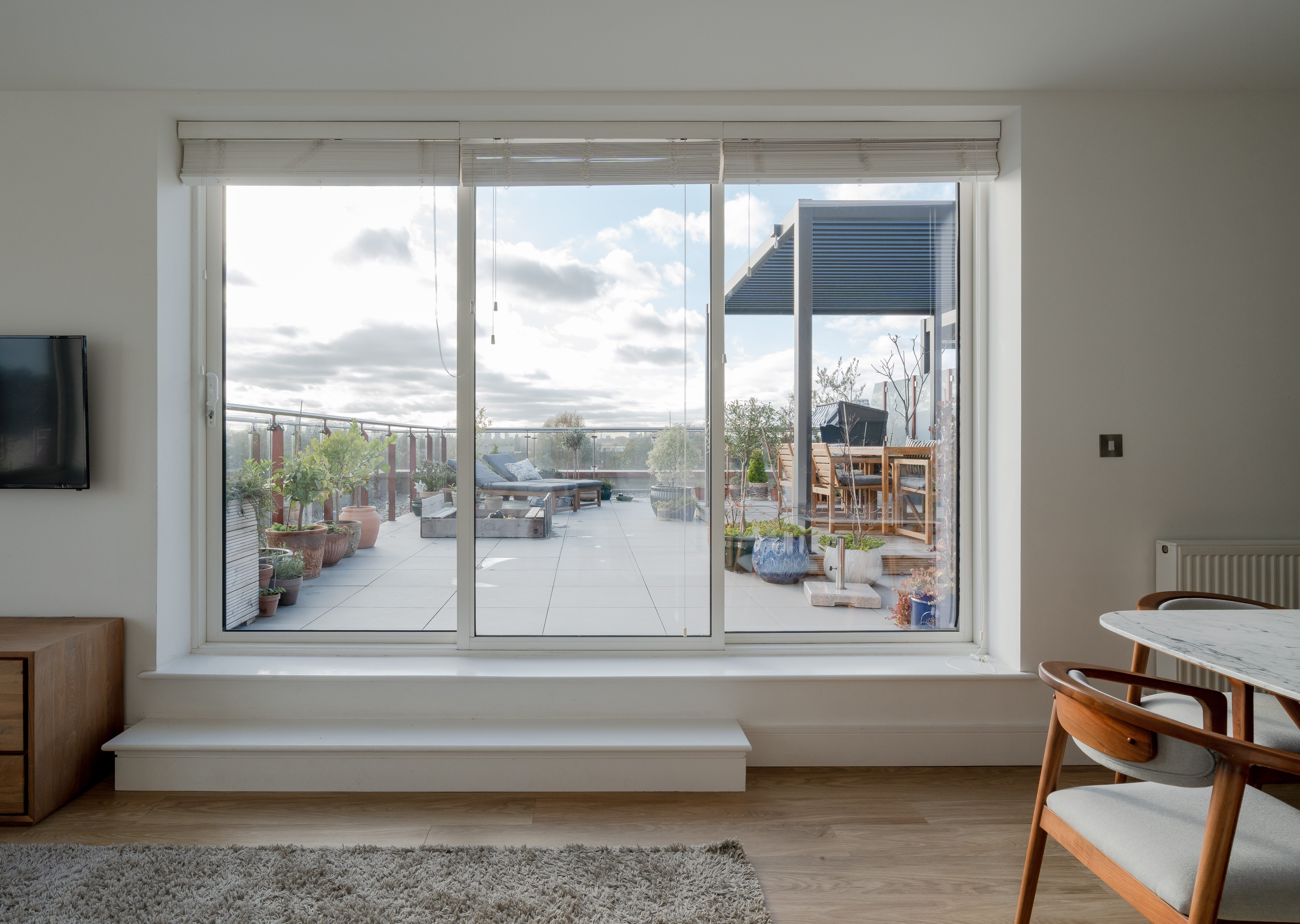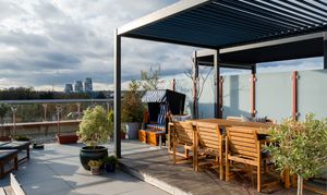 Sliding doors in the living room reveal a huge rooftop terrace, finished with external-grade porcelain pavers and enclosed by sleek glazed balustrades. The owners have added a timber deck and a metal-framed pergola, creating a comfortable shaded area that blends beautifully with the open sky. Potted olives, acers and citrus plants bring greenery and colour throughout the year.