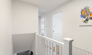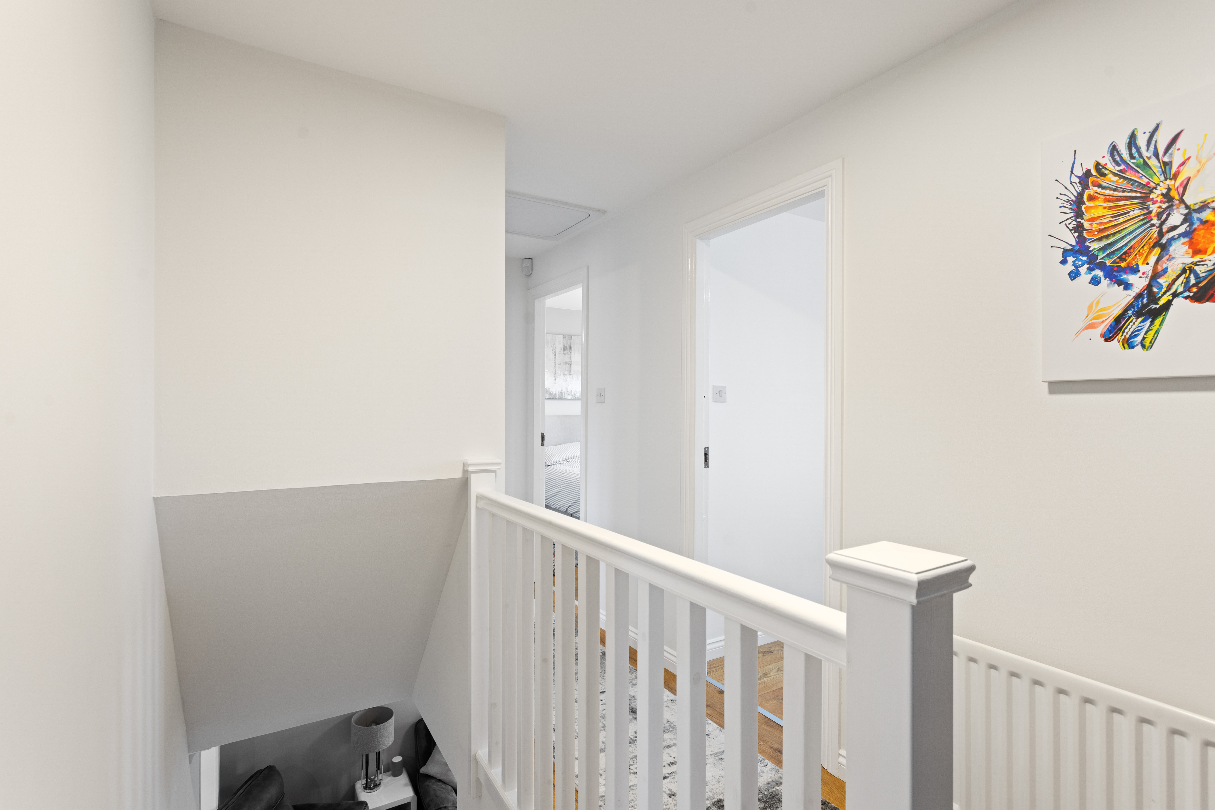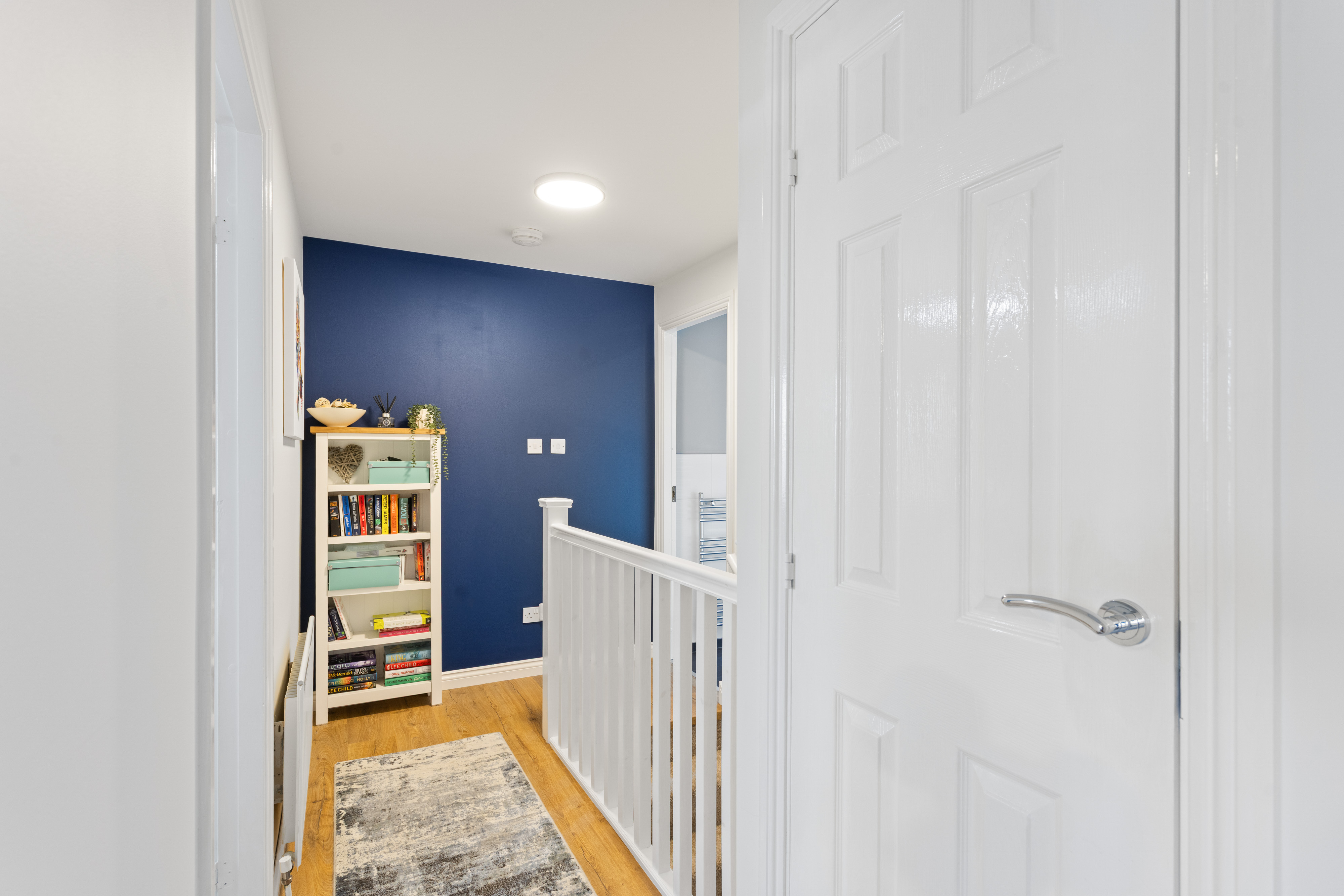 A bright and spacious upstairs hallway, accessed via carpeted stairs from the lounge, providing a central connection to all first-floor rooms. The hallway leads to three well-proportioned bedrooms, including the master suite with its own en suite, as well as the family bathroom. Practical storage is also included with a cupboard positioned above the stairs, and a hatch provides access to the loft area, adding further versatility to this functional and well-designed space.
