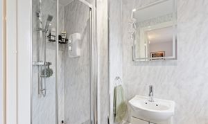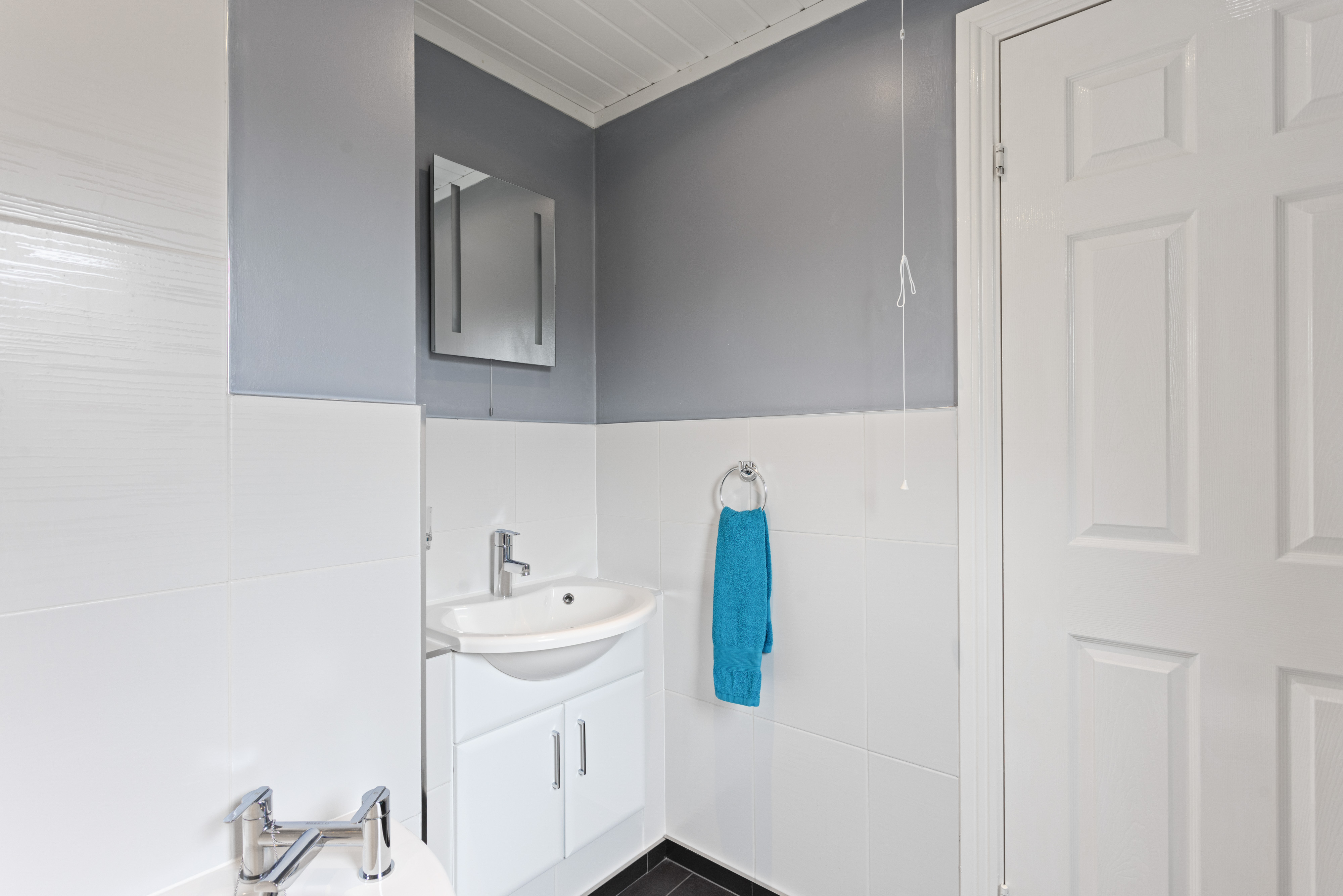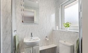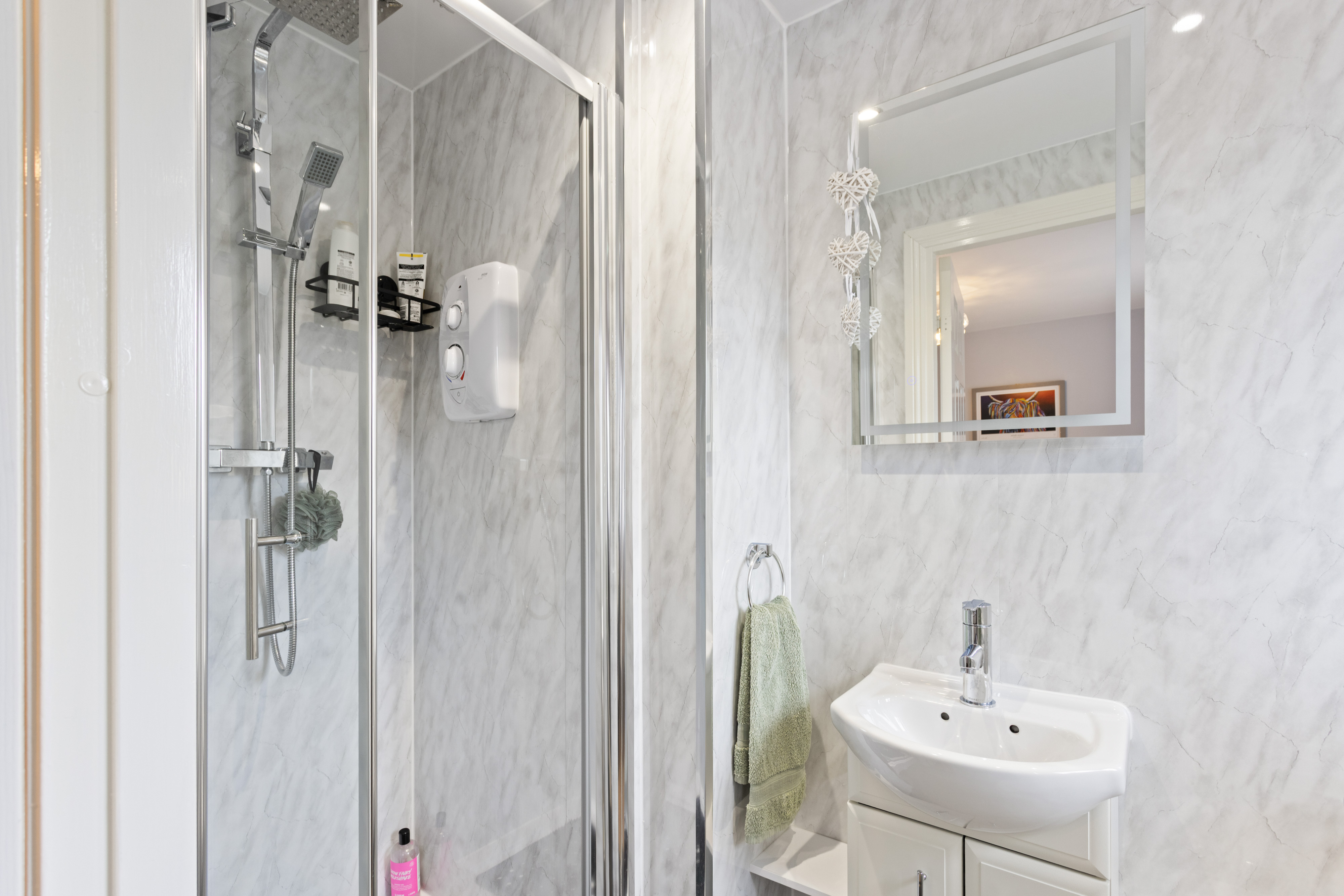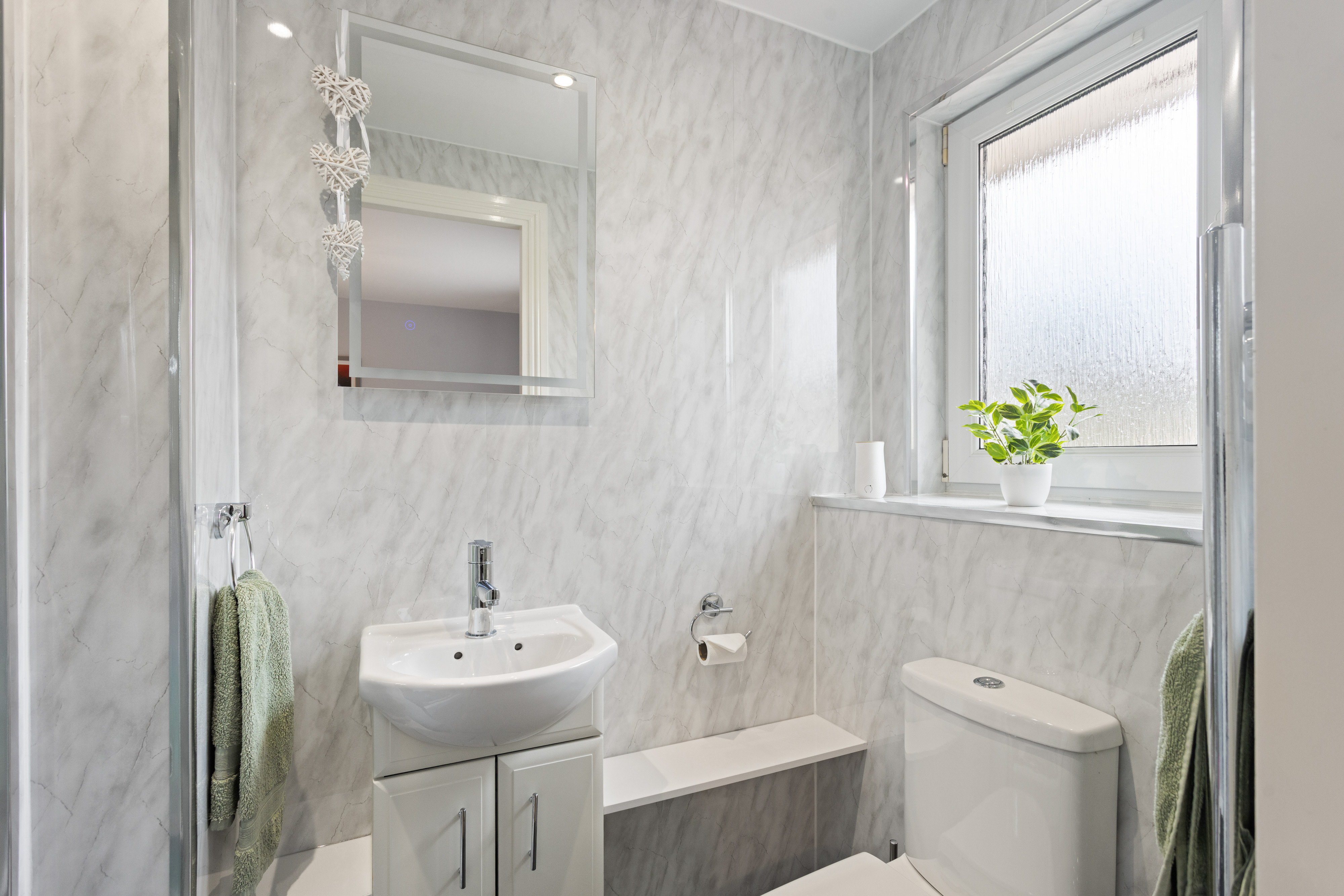 A well-appointed en suite bathroom, overlooking the rear garden and filled with natural light. It features a modern shower, a wash hand basin set into a sleek vanity unit, and a convenient push-button WC, combining functionality with a clean, contemporary finish.
