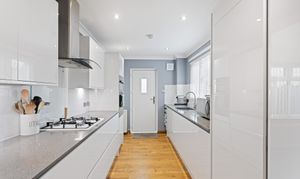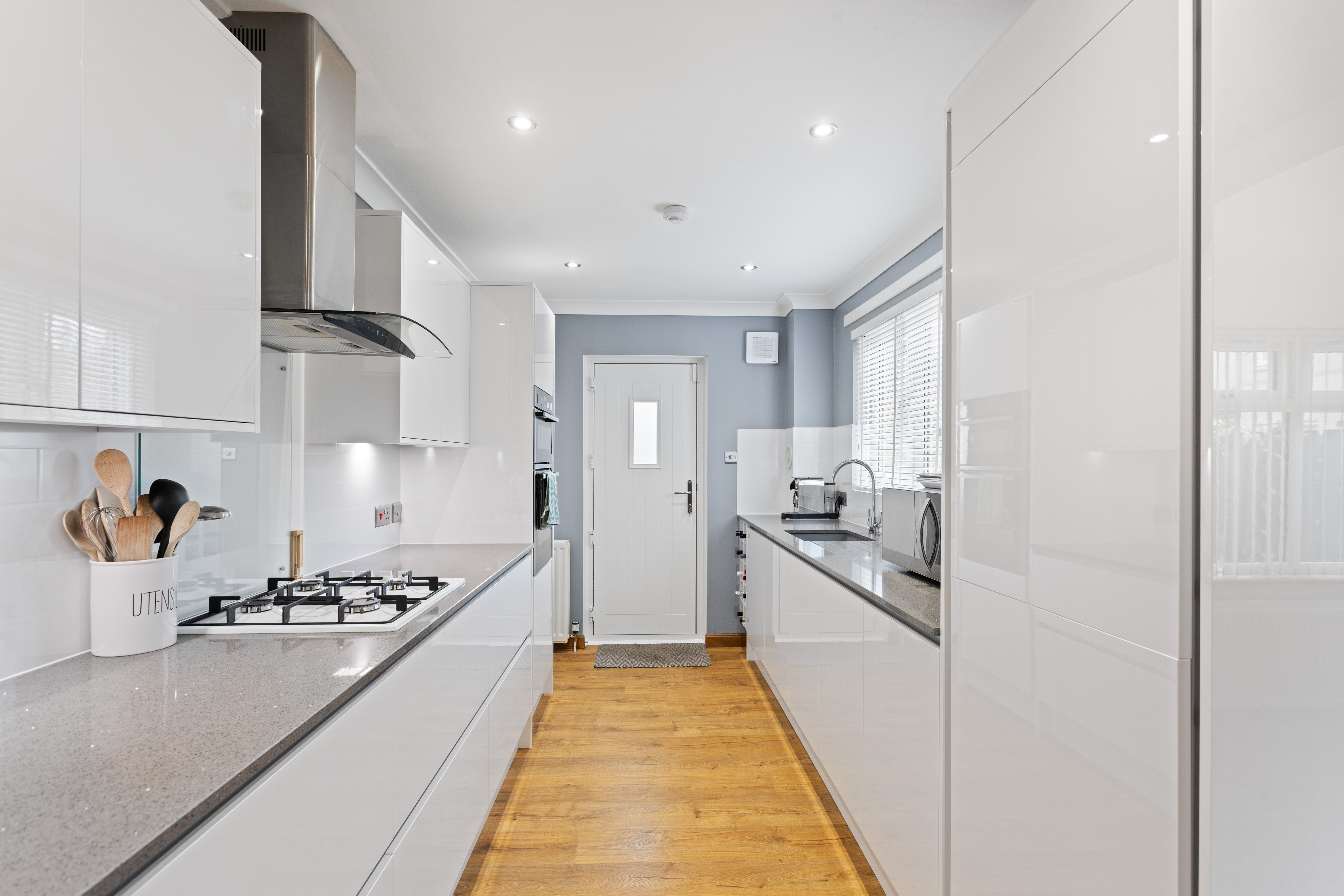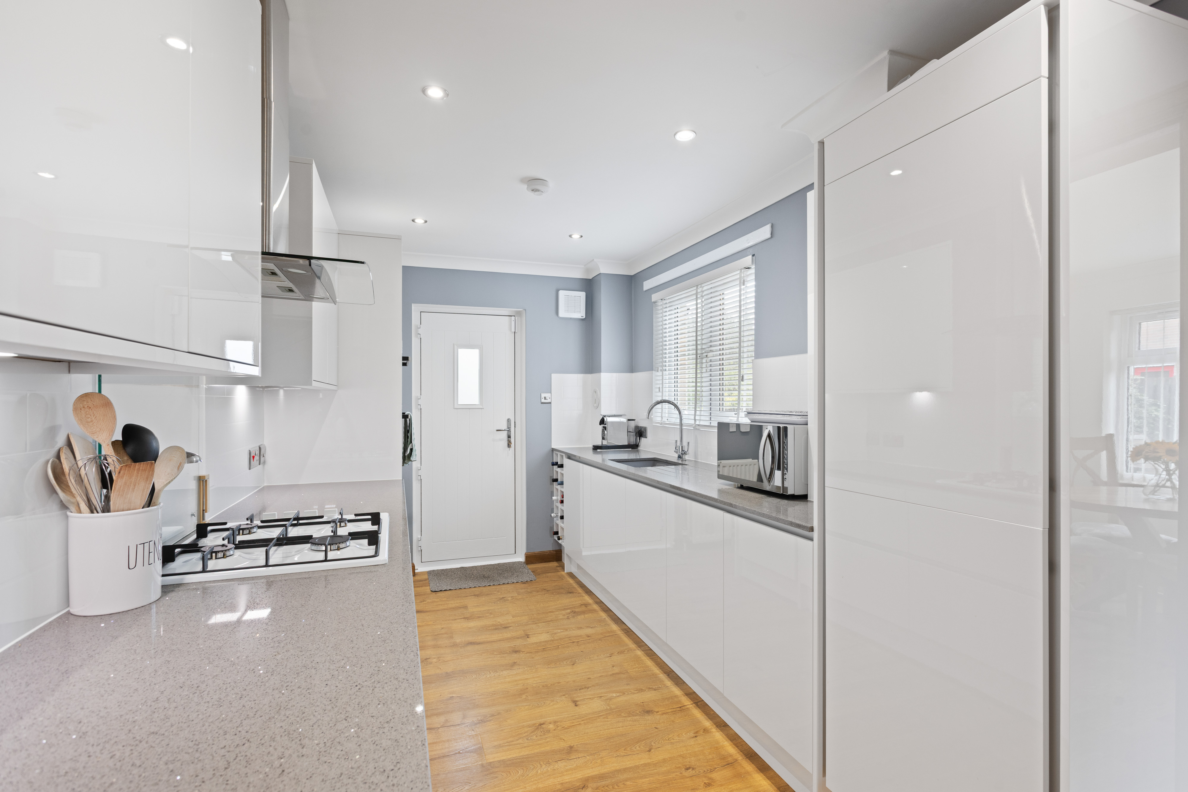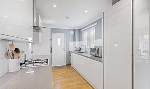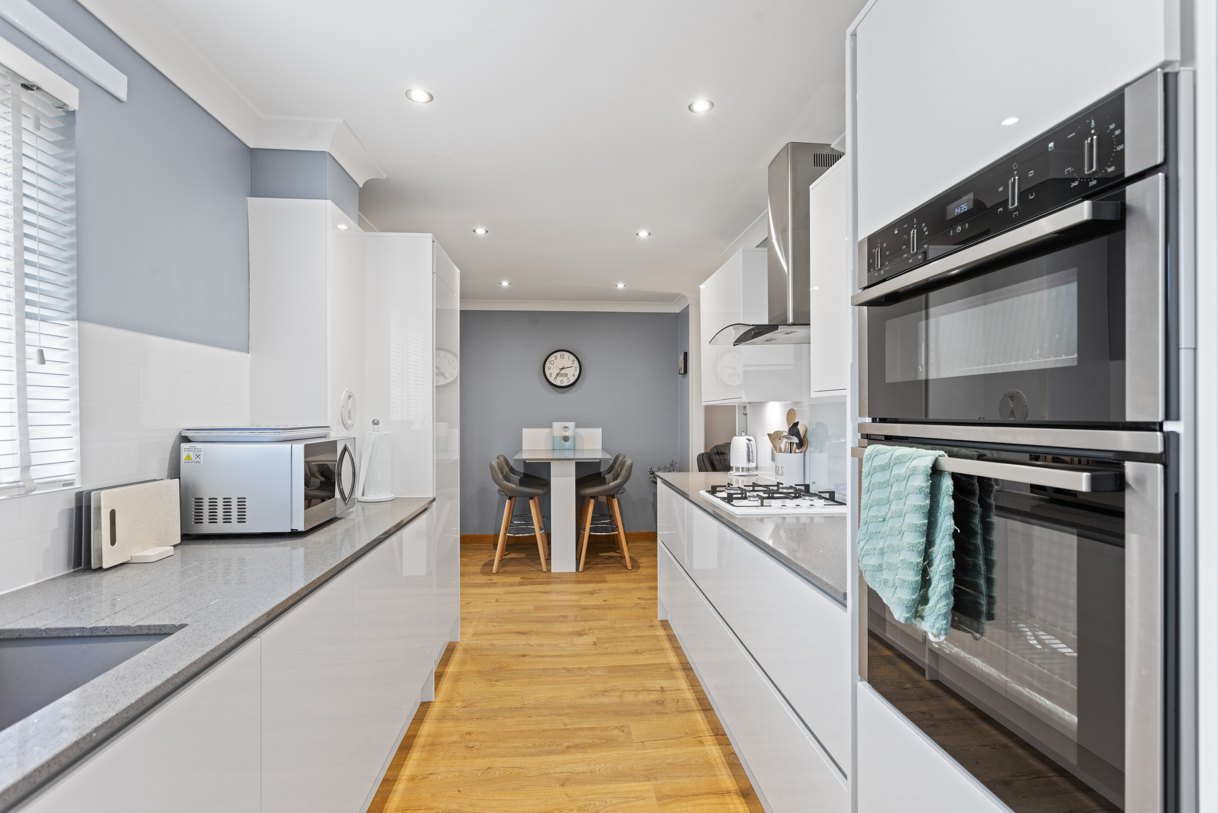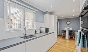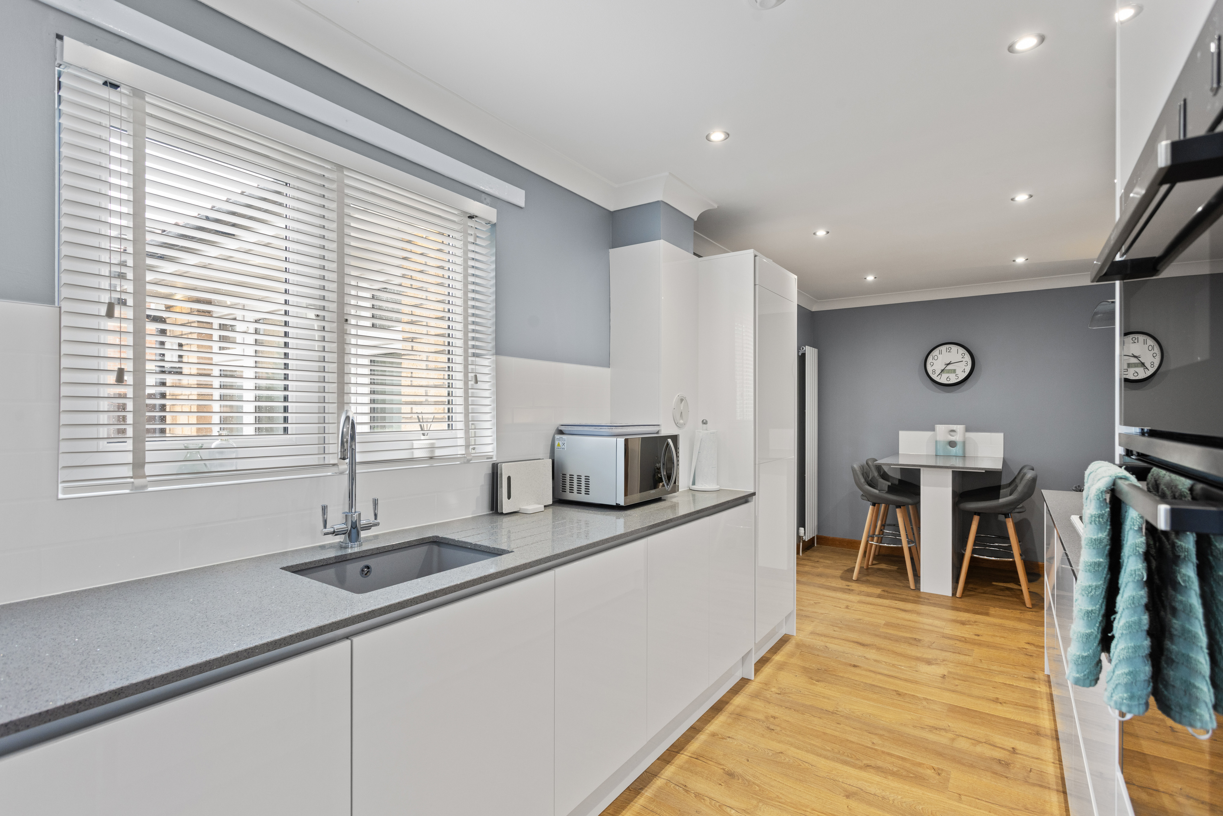 The kitchen/breakfasting area is a sleek and highly modern space, perfectly designed for both everyday living and entertaining. Flowing effortlessly from the open plan lounge, it offers a natural continuation of the living space, with double doors leading through to the sunroom, enhancing the light and openness throughout. The kitchen is well equipped with an abundance of worktop and cupboard space, providing both practicality and style. A cleverly designed utility area is neatly housed within a lar walk-in cupboard, offering a convenient and discreet solution for laundry. A window overlooking the rear garden and a door providing direct access outside further add to the appeal, making this a bright, functional and sociable heart of the home.
