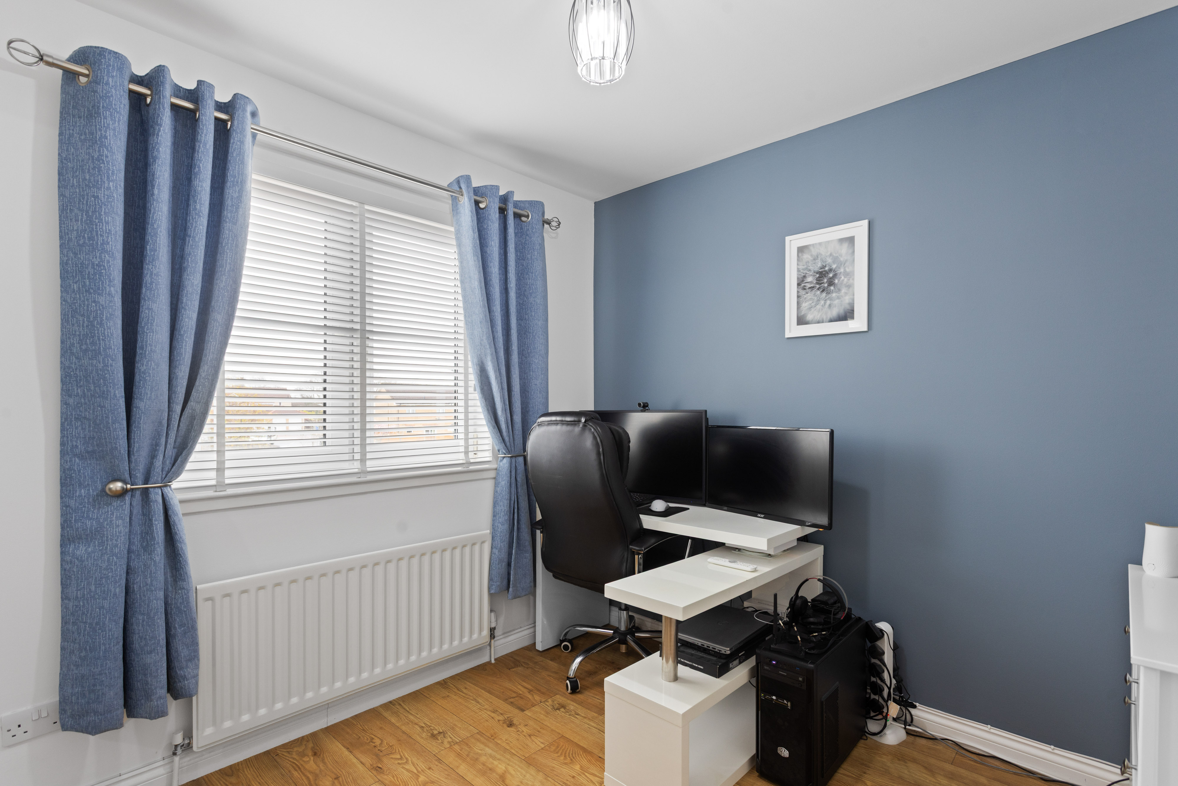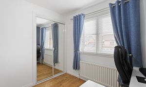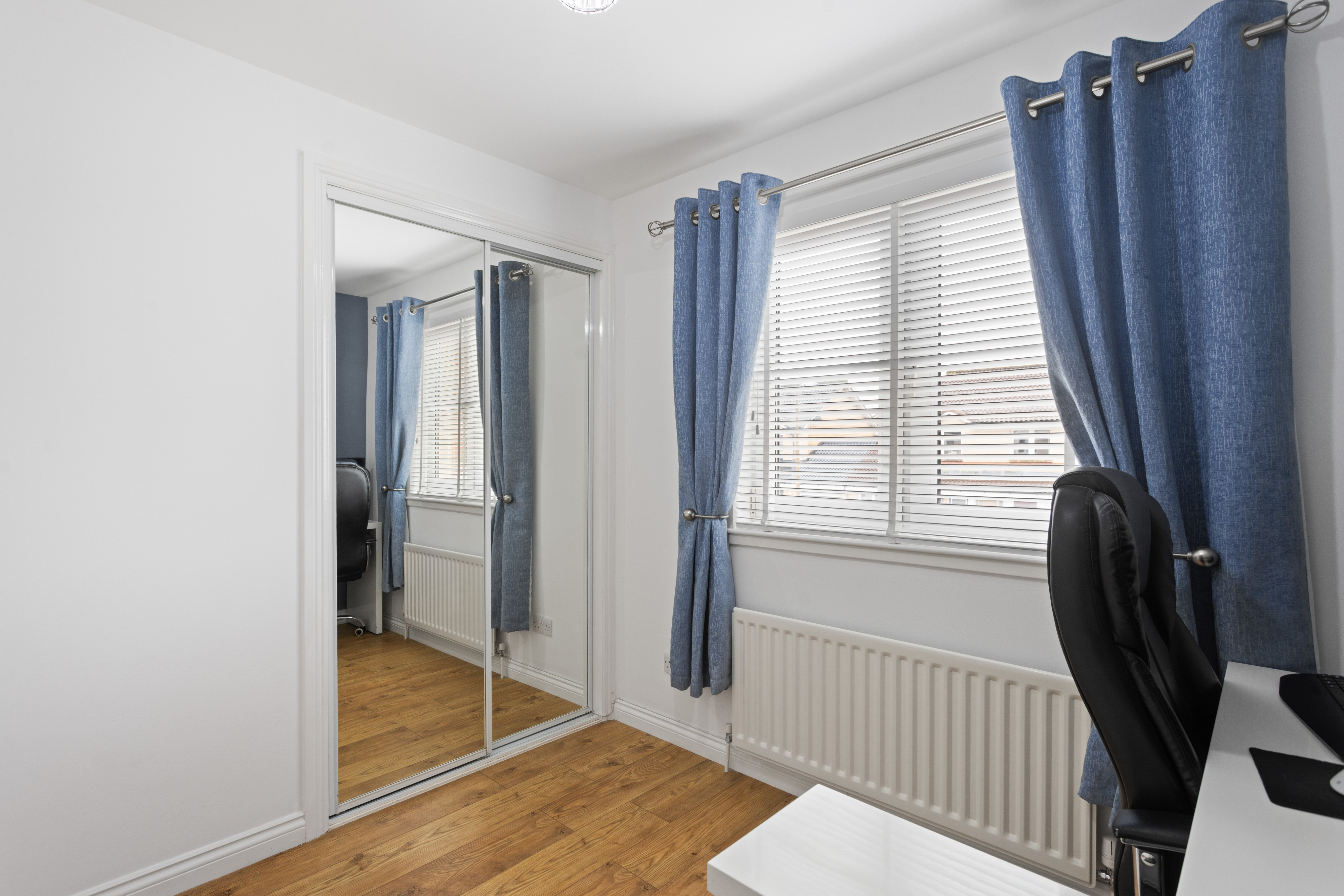 A well-proportioned, front-facing bedroom currently utilised as a home office. Bright and airy, the room offers ample space for a variety of uses and could easily accommodate freestanding furniture. Built-in mirrored wardrobes provide practical storage while helping to enhance the sense of space and light.