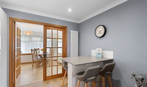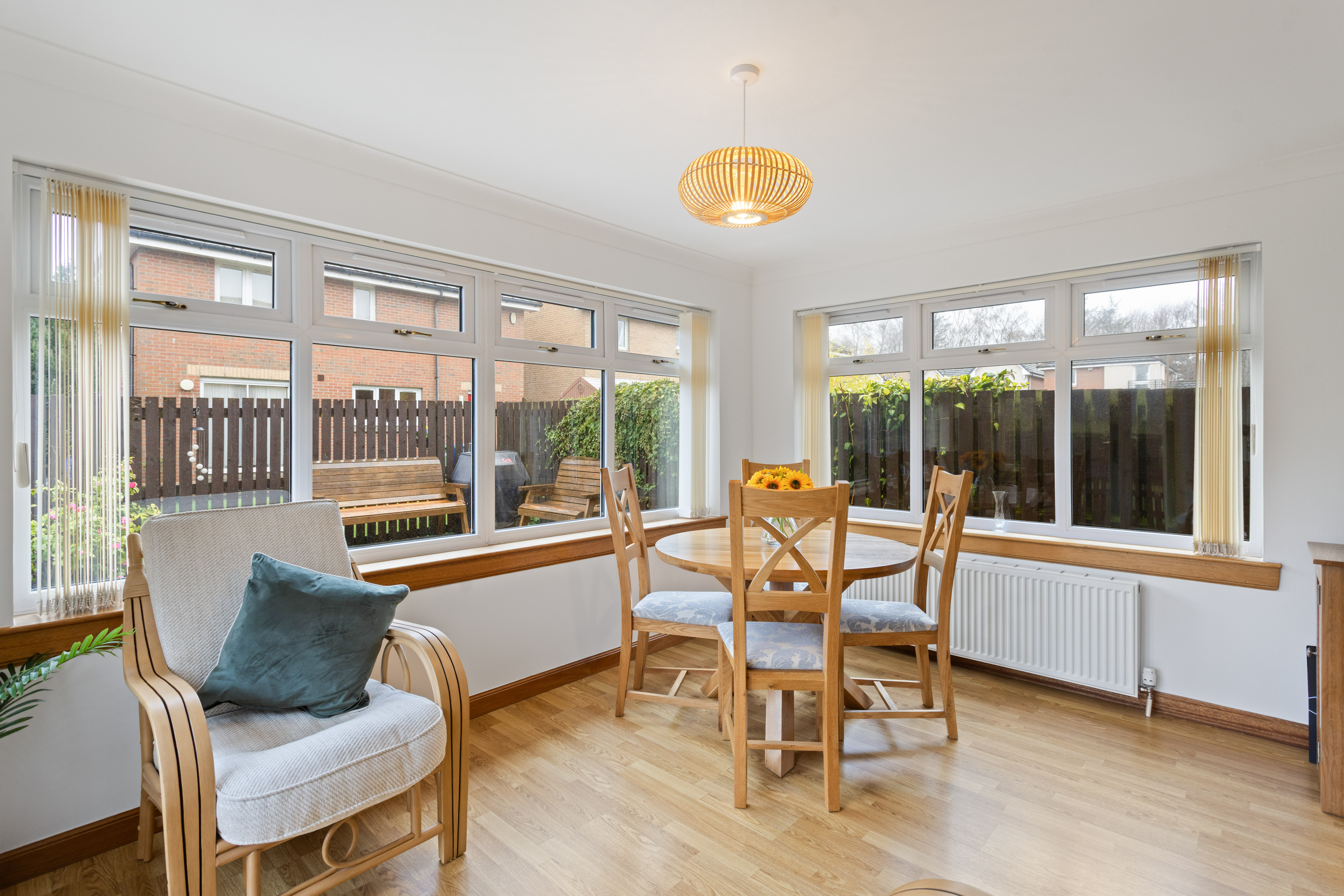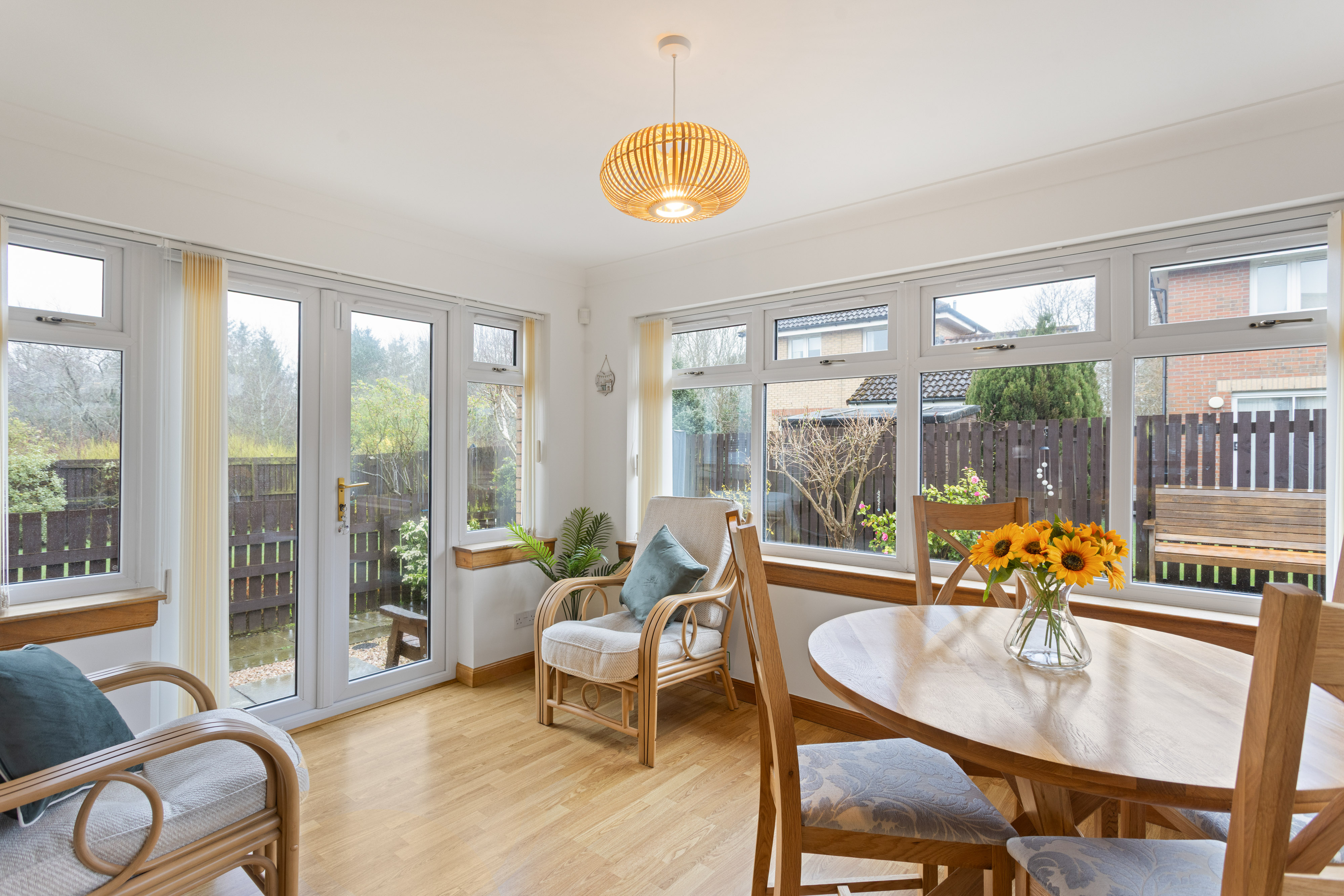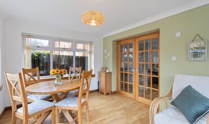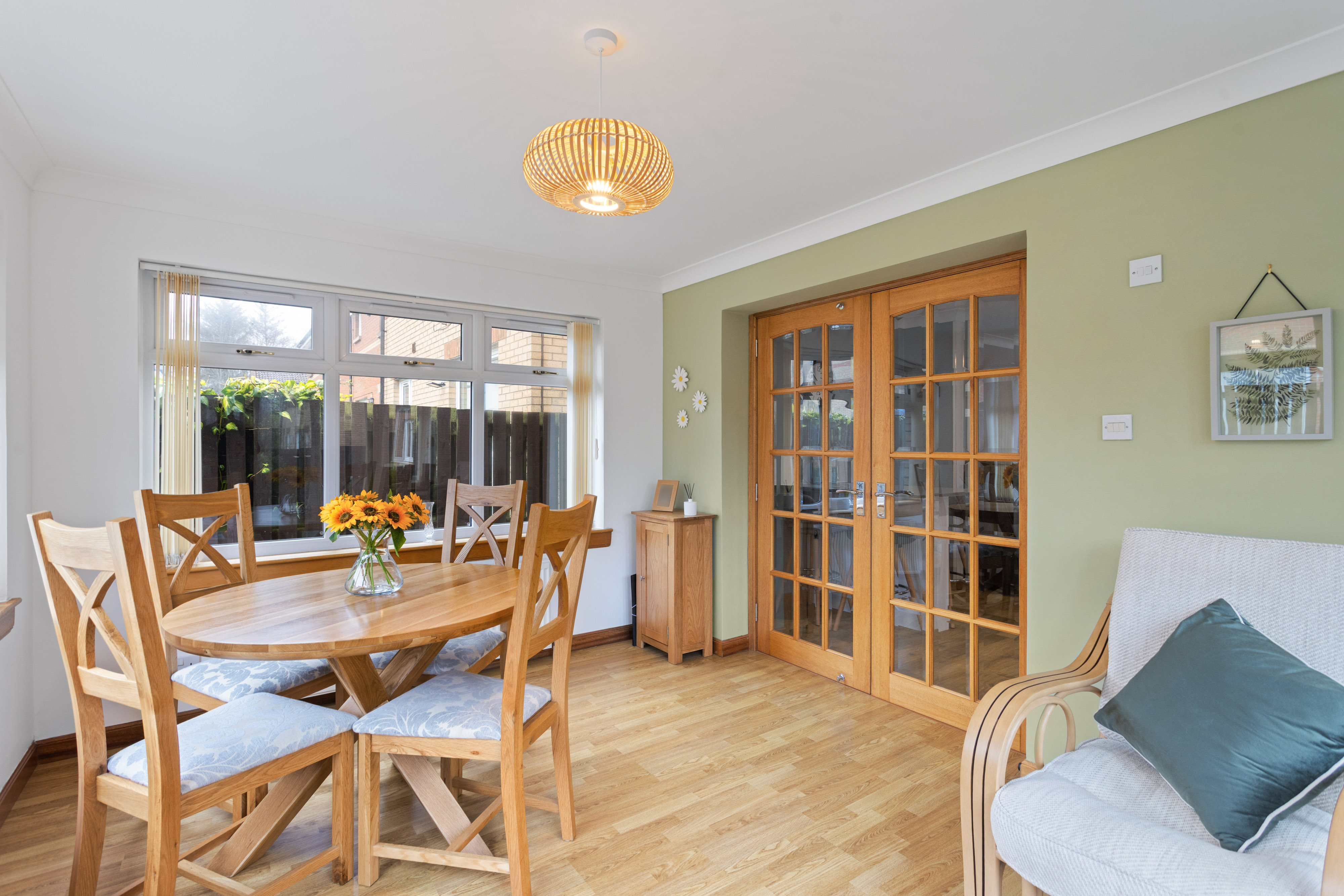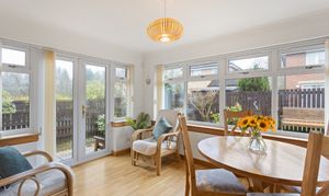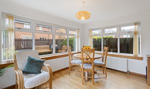A generously proportioned sunroom, currently utilised as a dining area, offering a bright and inviting space ideal for both everyday meals and entertaining. Surrounded by windows, the room enjoys an abundance of natural light and pleasant views over the rear garden. French doors provide direct access outside, creating a seamless connection between indoor and outdoor living. Accessed from the kitchen/breakfasting area, this versatile space enhances the overall flow of the home and provides a perfect setting for relaxed dining.