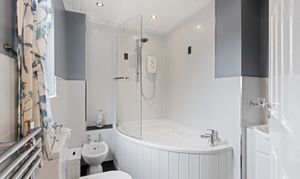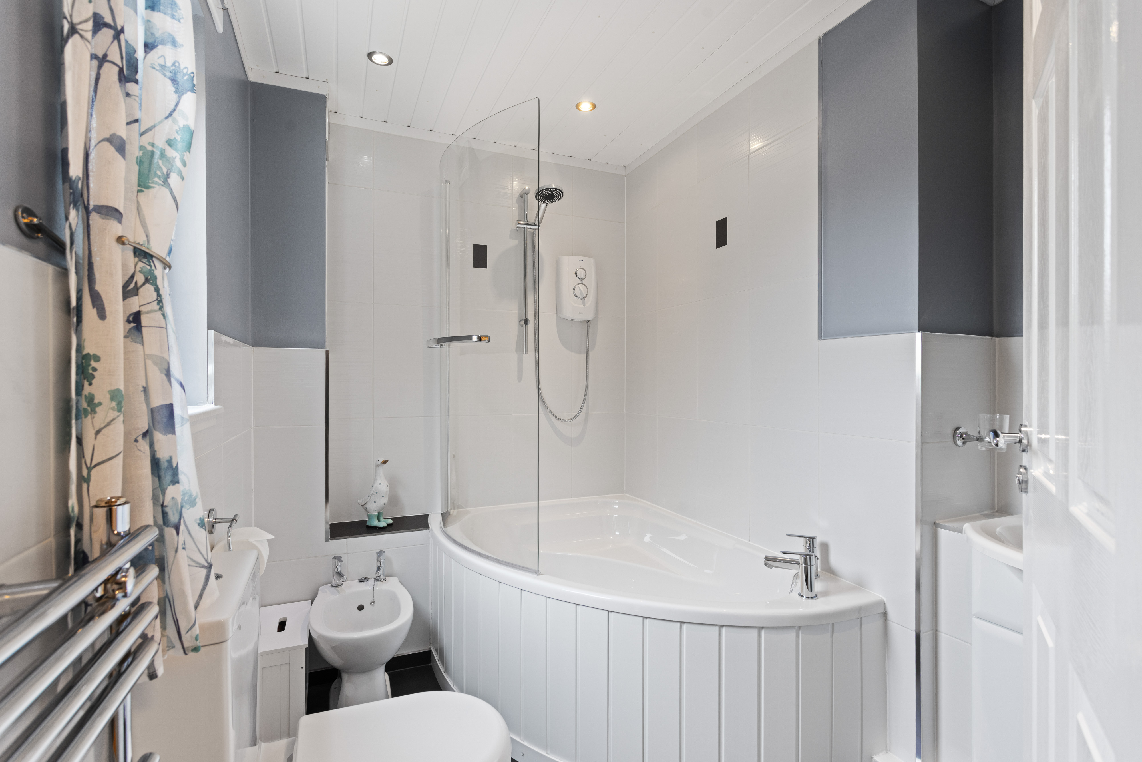A generously sized bathroom, thoughtfully designed to combine comfort and practicality. The room features a large corner bath with an overhead shower with glass screen, a sink set into a vanity unit, a push-button WC, and a bidet. Well-proportioned and bright, this bathroom offers a functional and relaxing space suitable for family use.