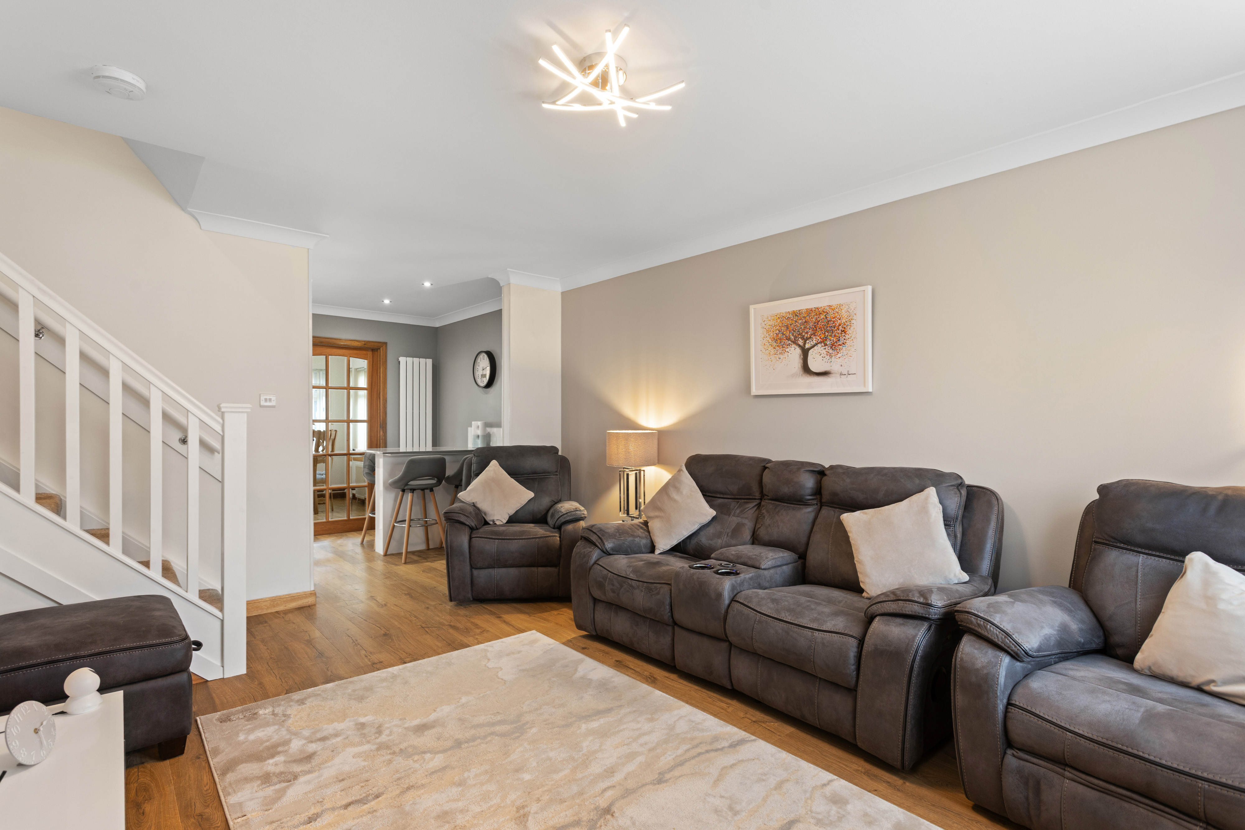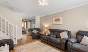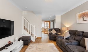 A spacious and welcoming lounge positioned to the front of the property, offering generous proportions and an abundance of natural light. The room flows seamlessly into the open plan kitchen/breakfasting area, creating an ideal layout for modern living and entertaining. From here, access is gained to a bright and inviting sunroom, further enhancing the sense of space and connection throughout the home. A staircase within the lounge provides convenient access to the upper level, while also adding an attractive focal point to the room.