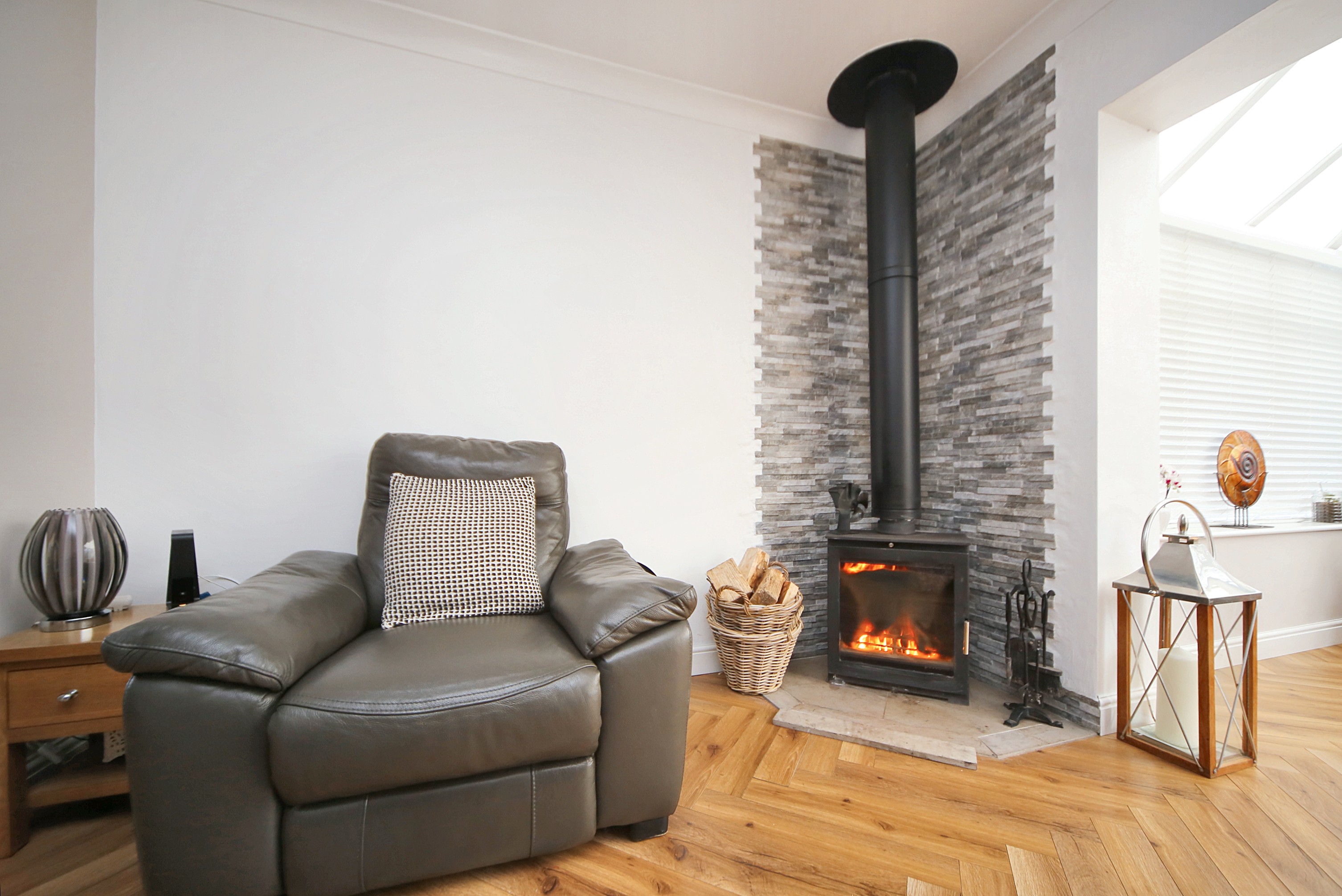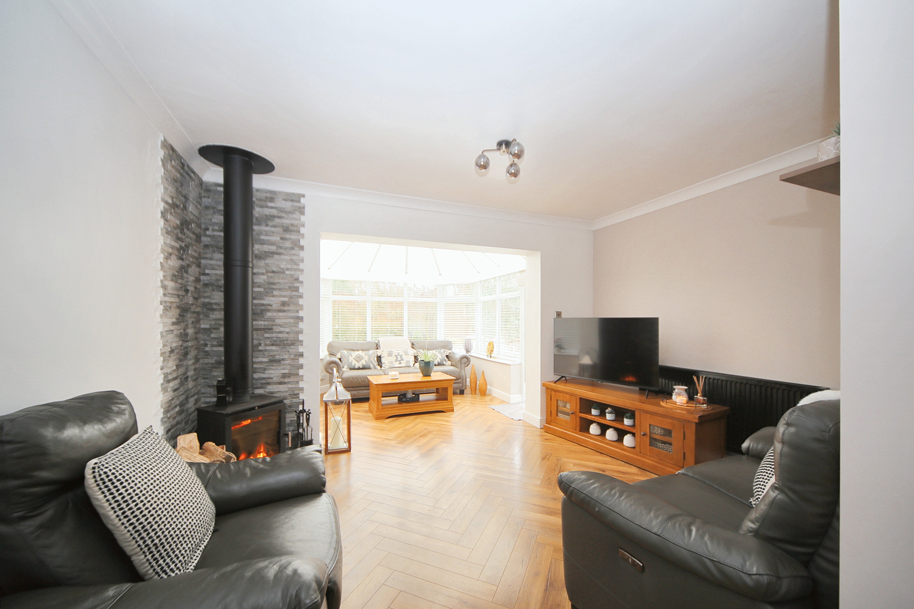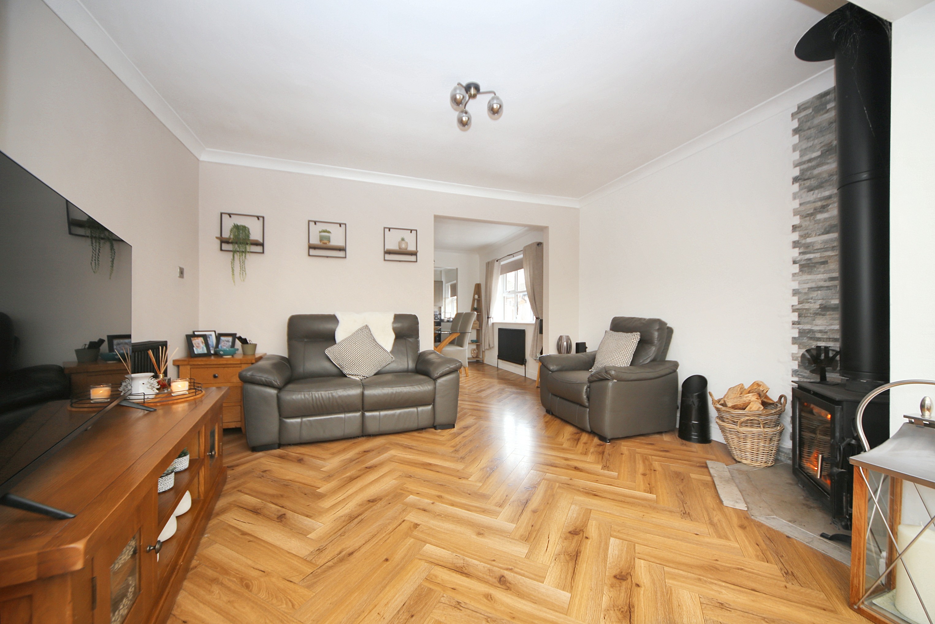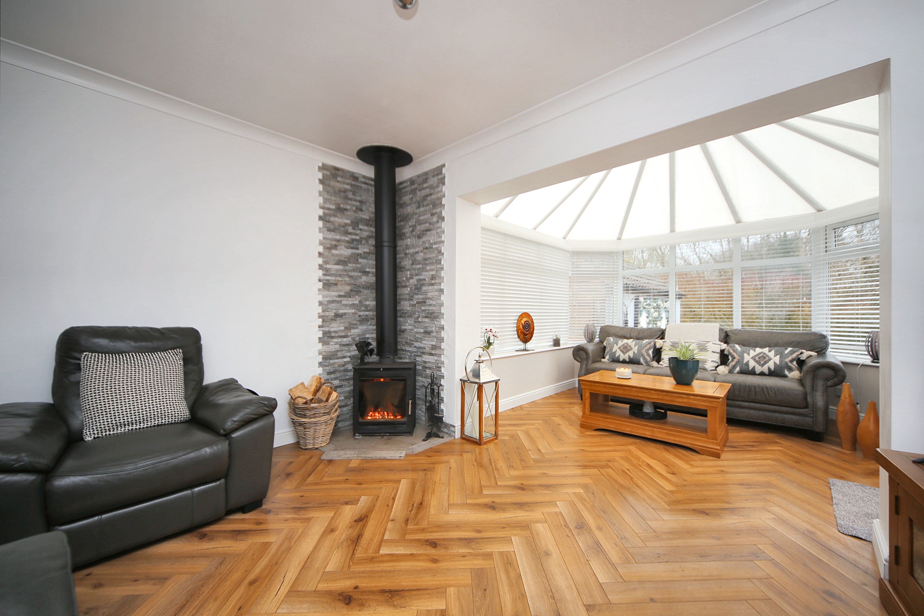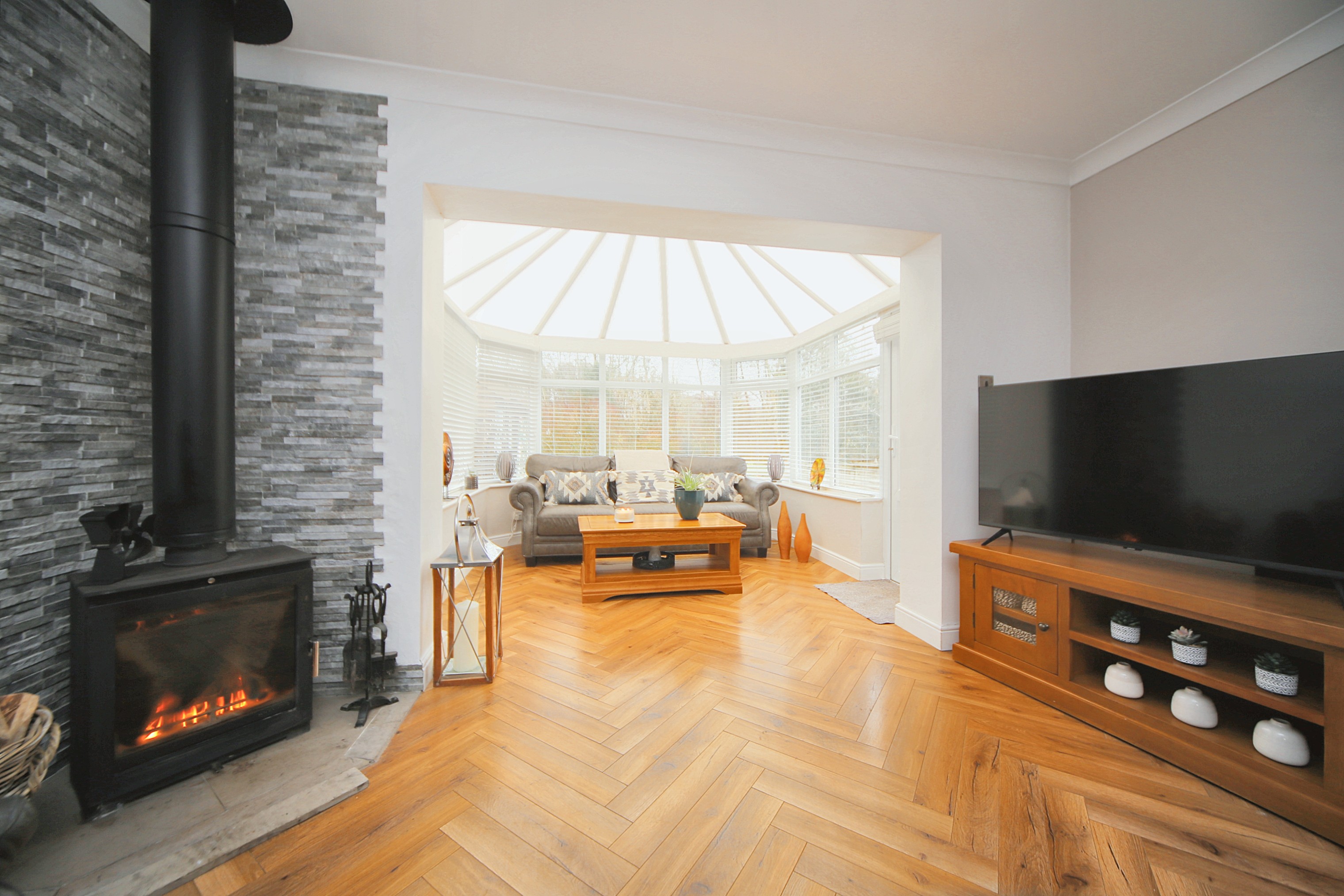 Accessed via the side of the property, the kitchen boasts a tiled floor and is equipped with integrated appliances, including a fridge, hob, oven, and extractor. The kitchen flows seamlessly into the dining room, which is open plan to the lounge – a bright and inviting space with a multi-fuel burning stove, ideal for cozy evenings. The lounge continues through to a lovely conservatory, offering additional living space with a view of the garden and woodland beyond.