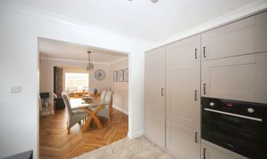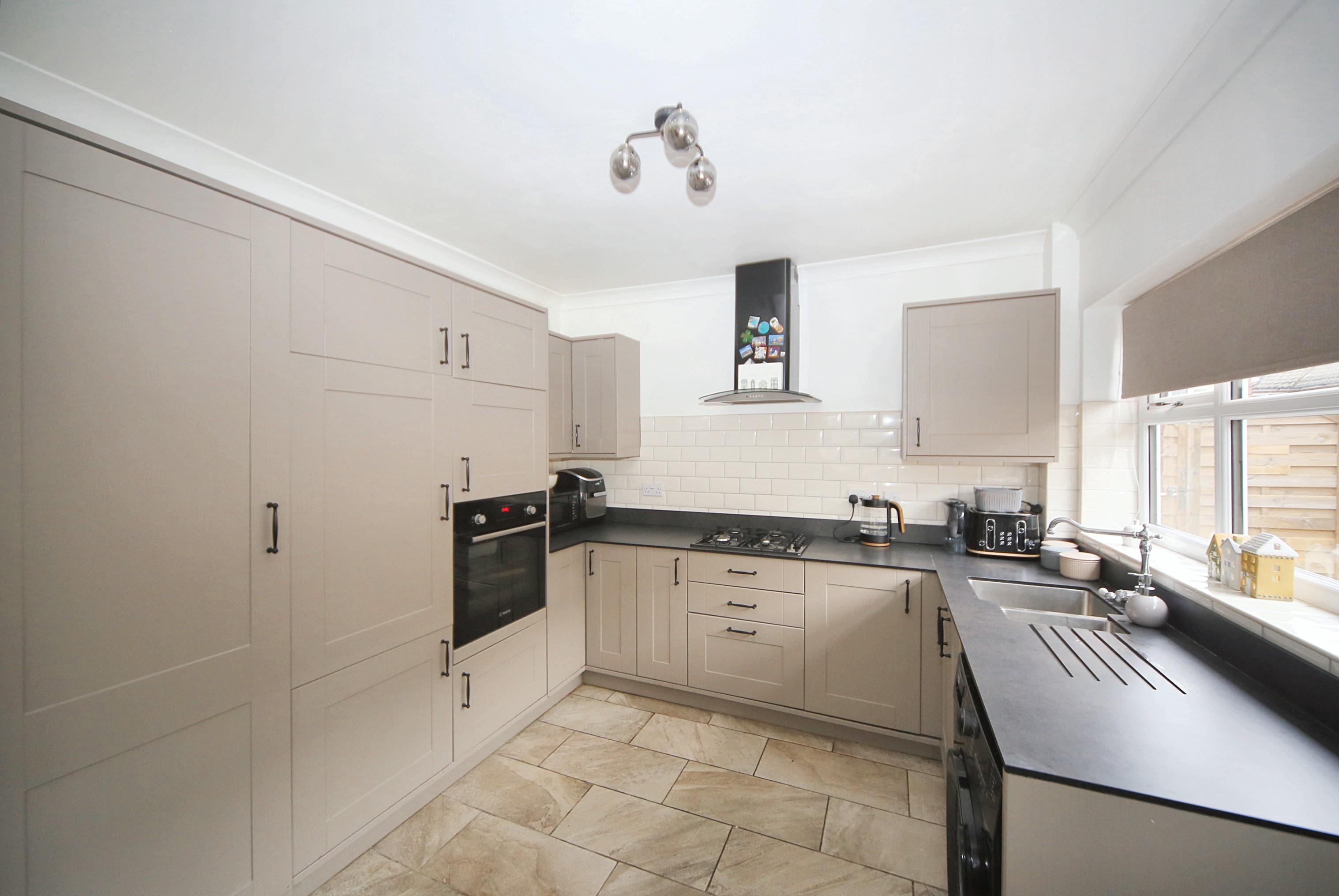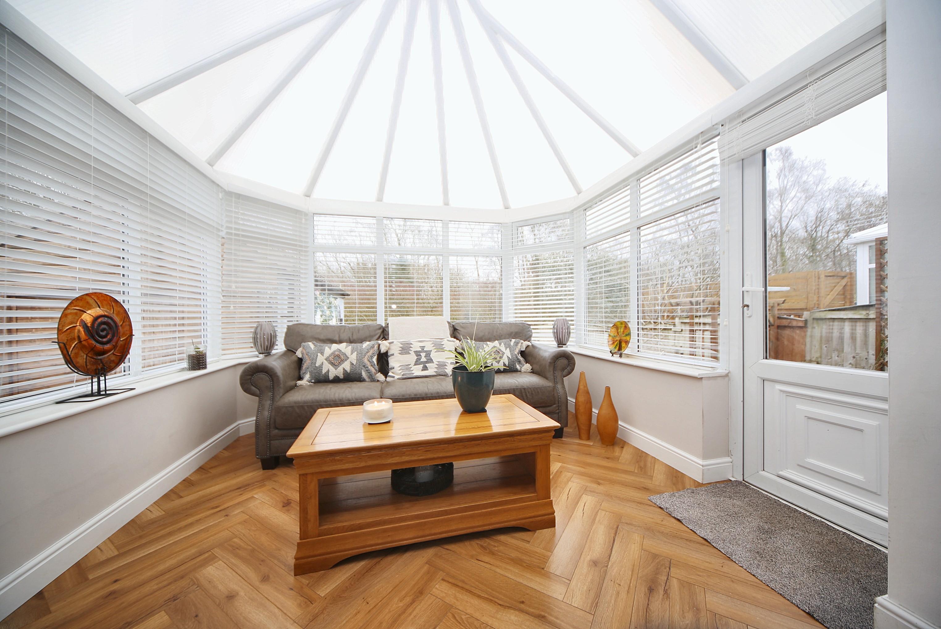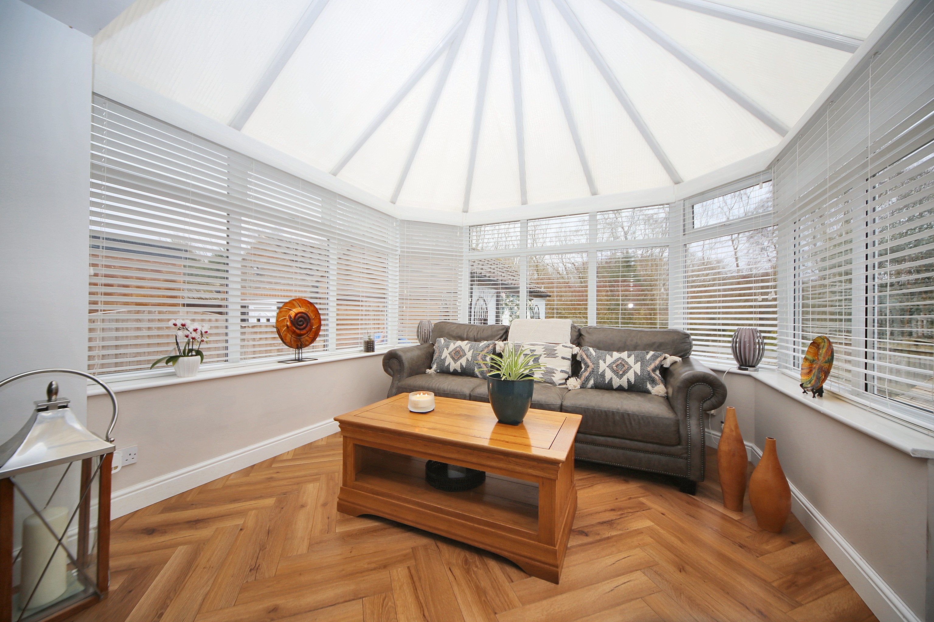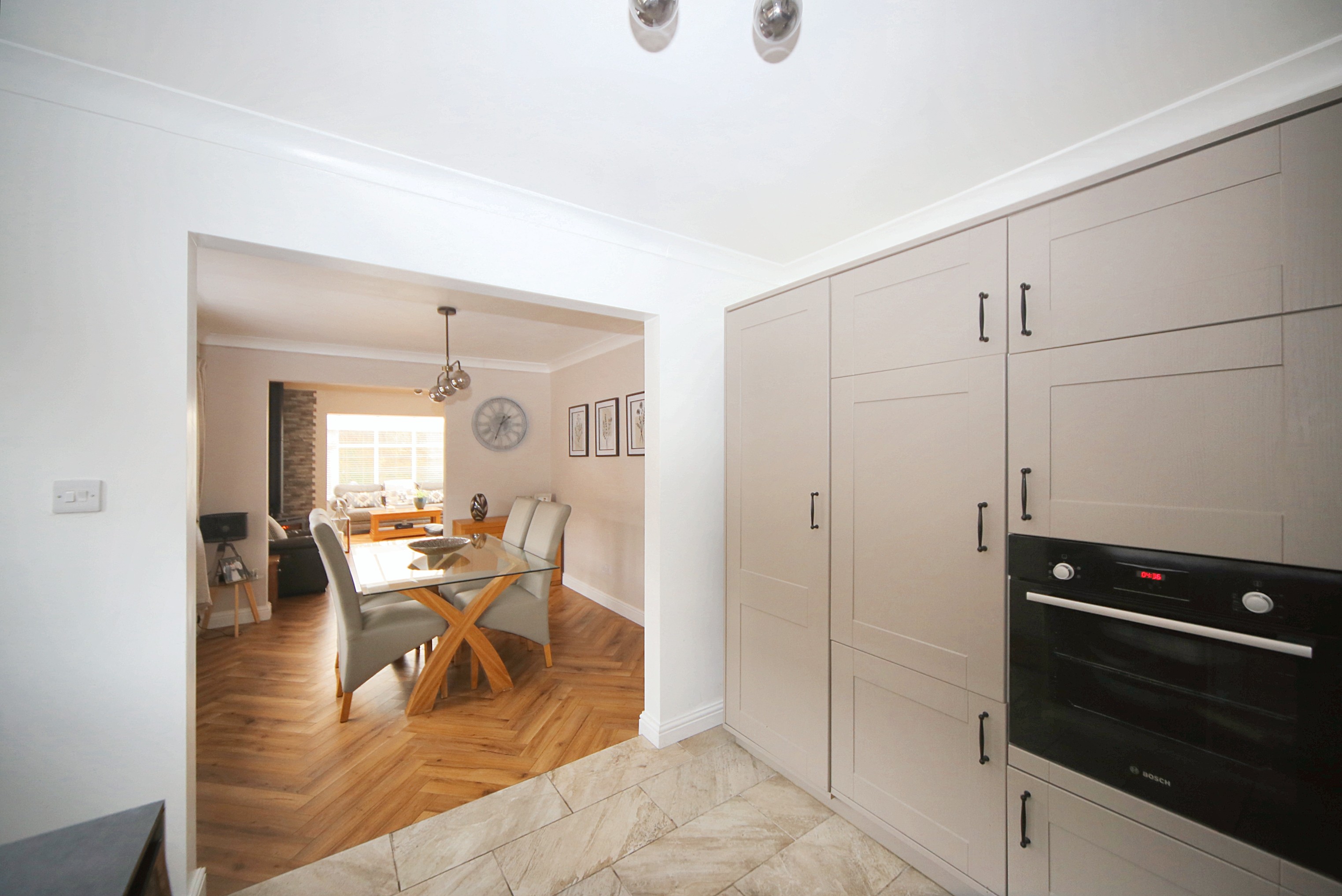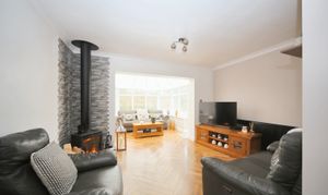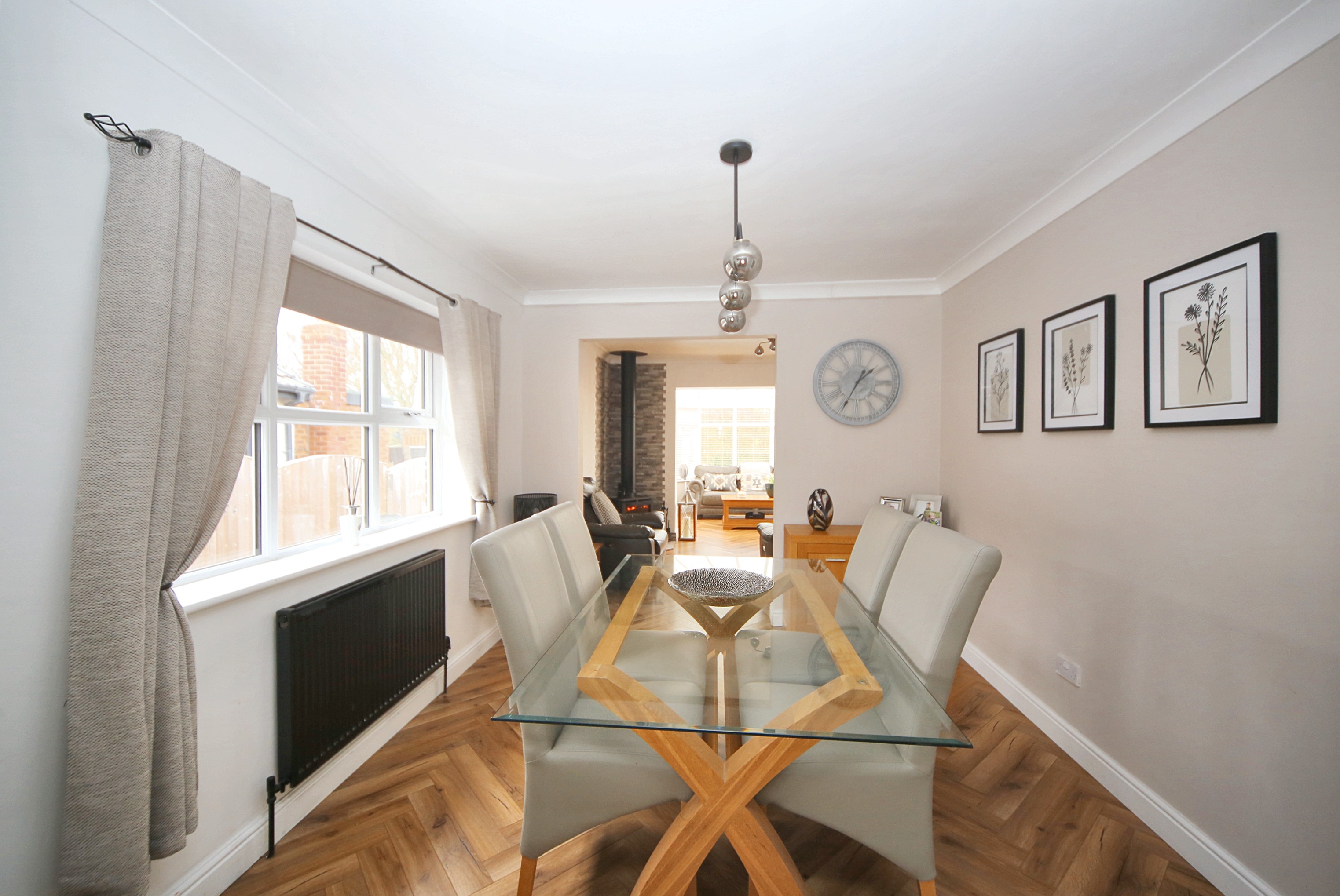 Accessed via the side of the property, the kitchen boasts a tiled floor and is equipped with integrated appliances, including a fridge, hob, oven, and extractor. The kitchen flows seamlessly into the dining room, which is open plan to the lounge – a bright and inviting space with a multi-fuel burning stove, ideal for cozy evenings. The lounge continues through to a lovely conservatory, offering additional living space with a view of the garden and woodland beyond.