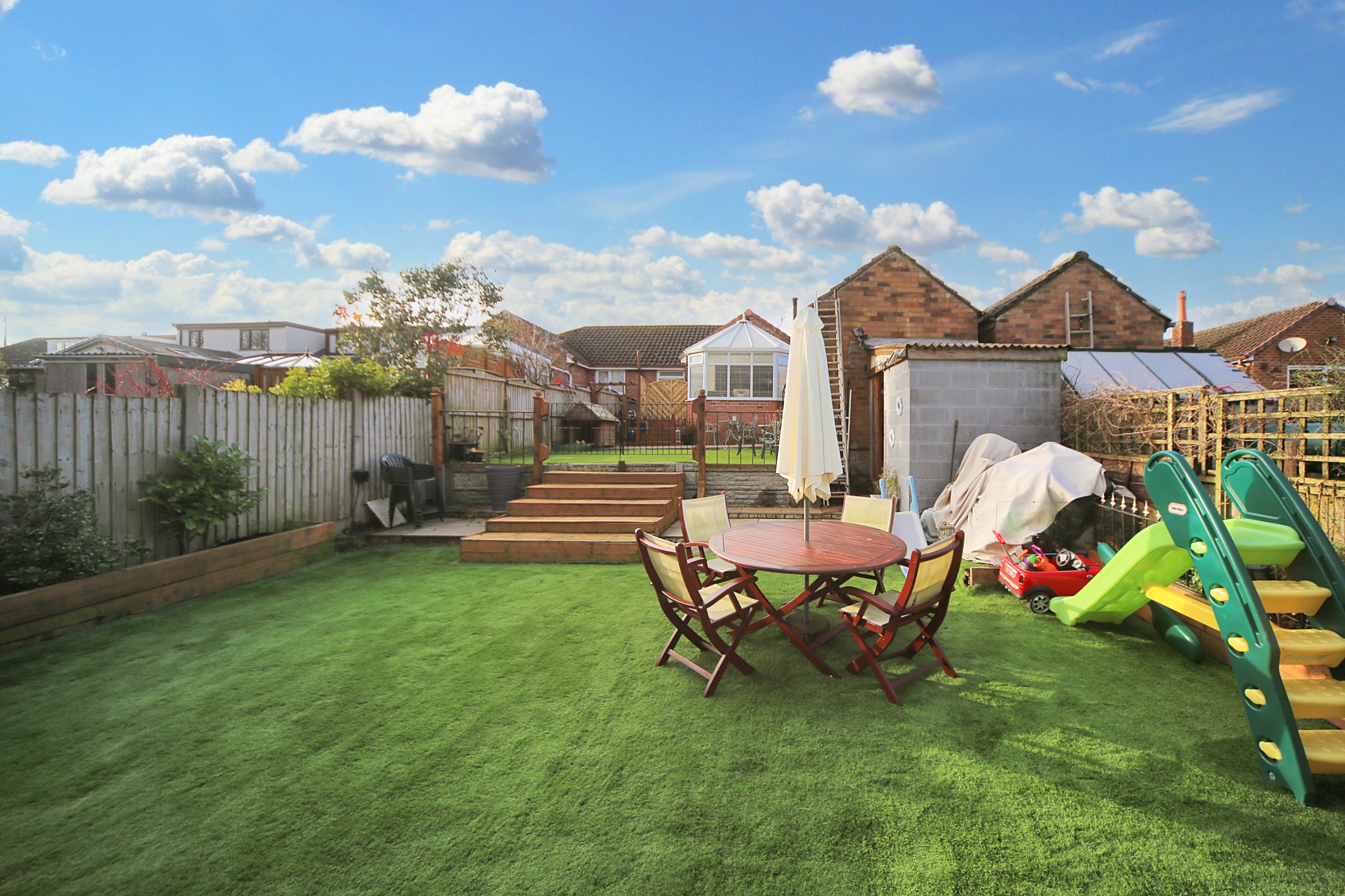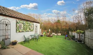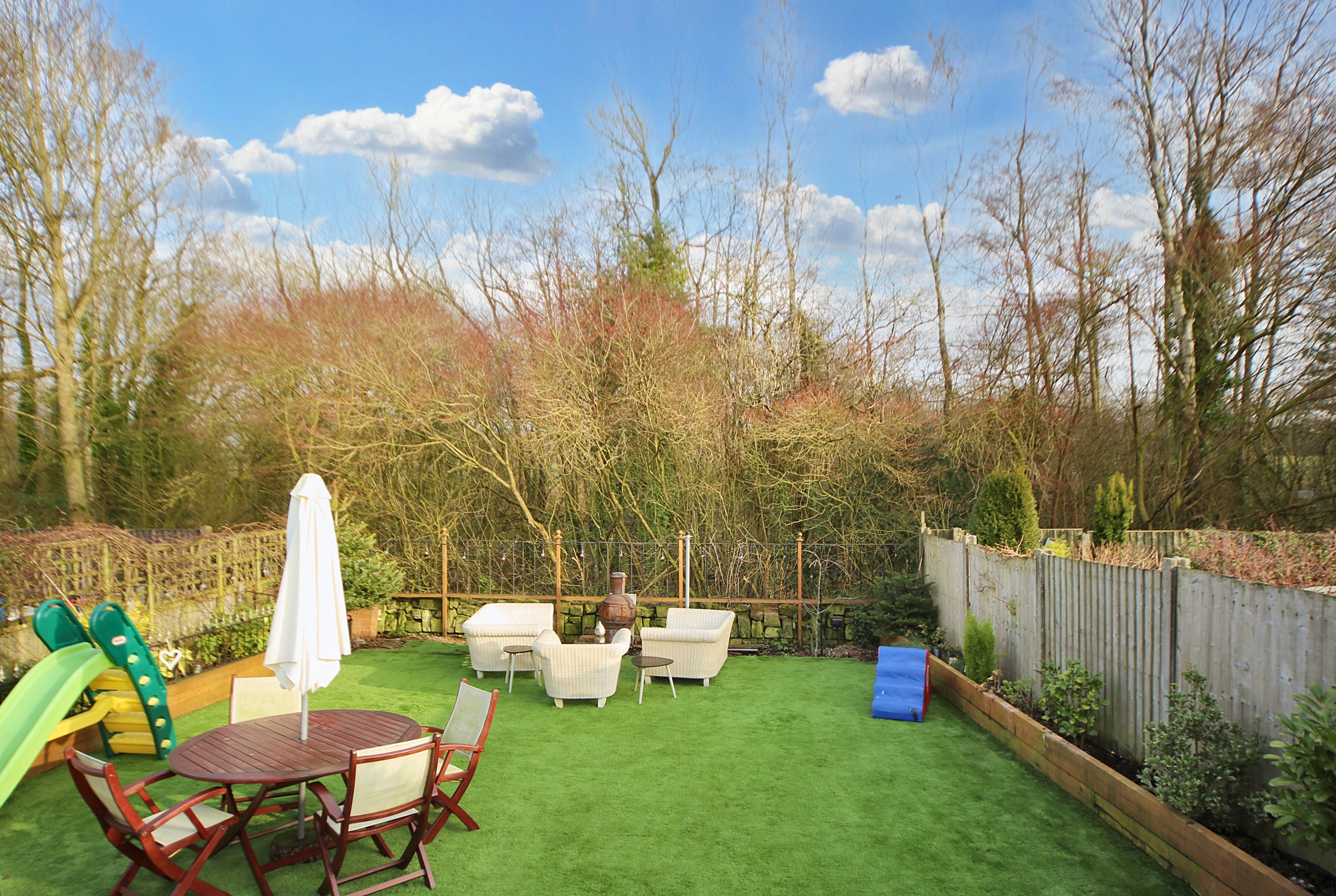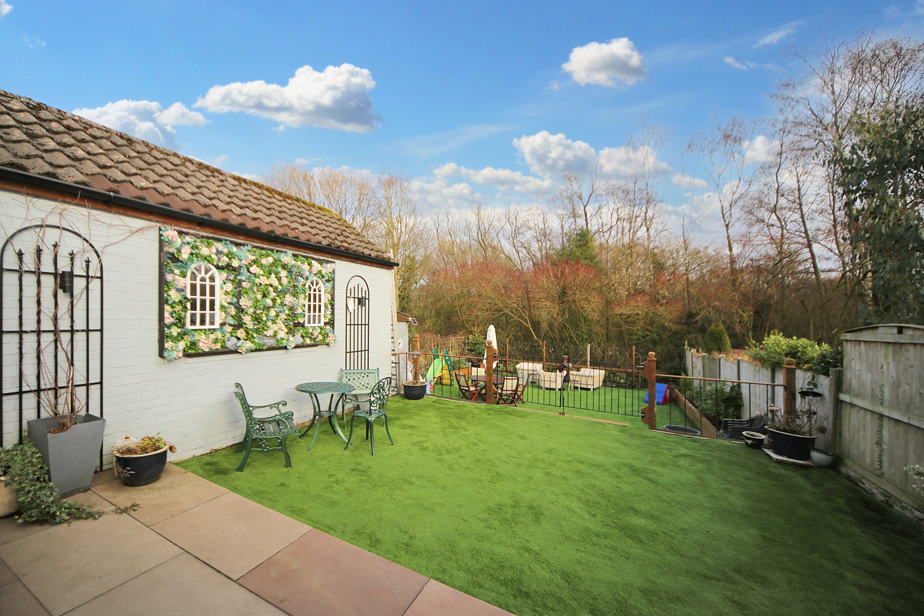 The property benefits from a driveway with space for two cars, alongside a detached garage and an outhouse, both with electric – ideal for additional storage or workshop space. The large garden is a standout feature, offering a woodland backdrop that ensures privacy and seclusion, with no properties overlooking the garden. The outdoor space includes a patio area and artificial lawn, making it low-maintenance and perfect for relaxing or entertaining.