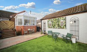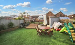 - Patio area and artificial lawn, low-maintenance outdoor space