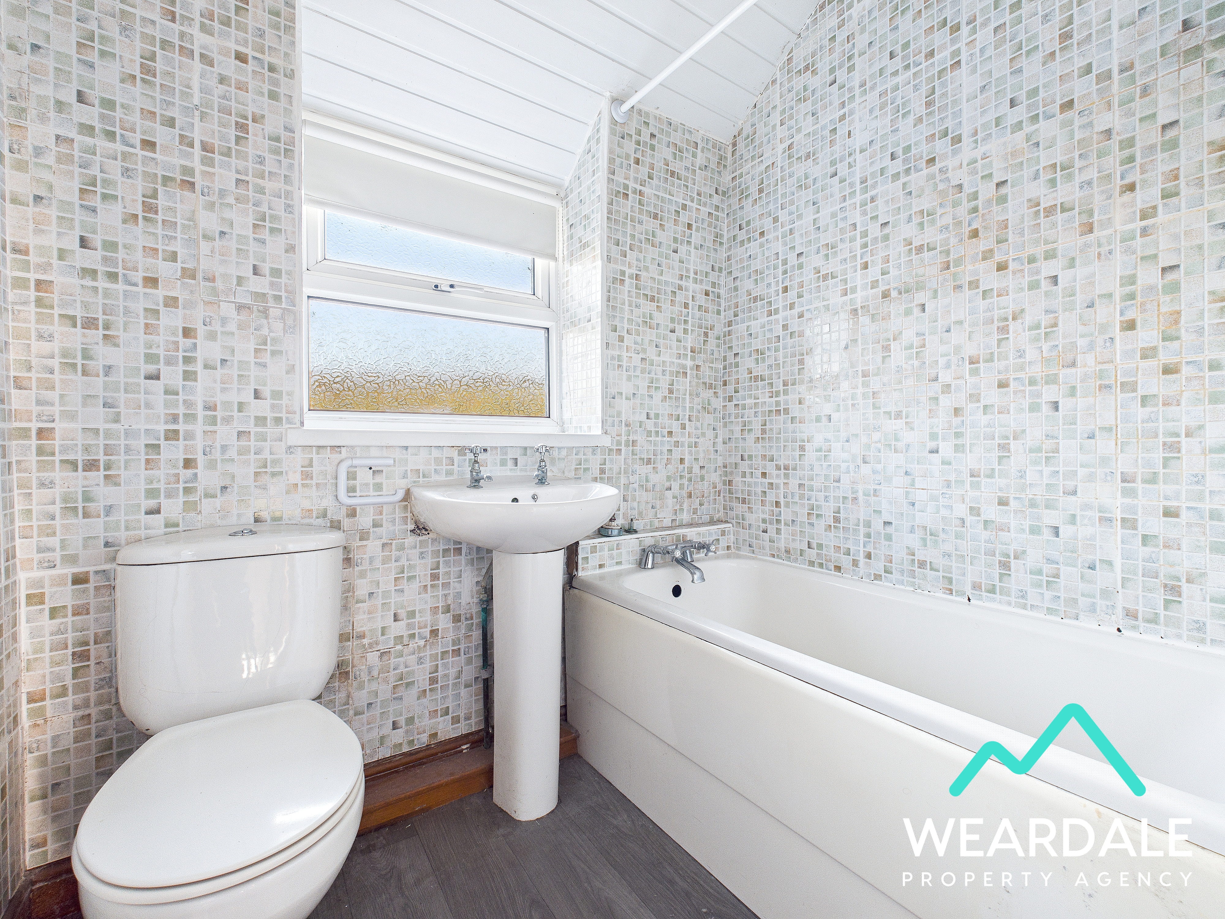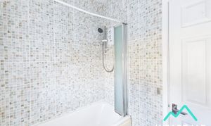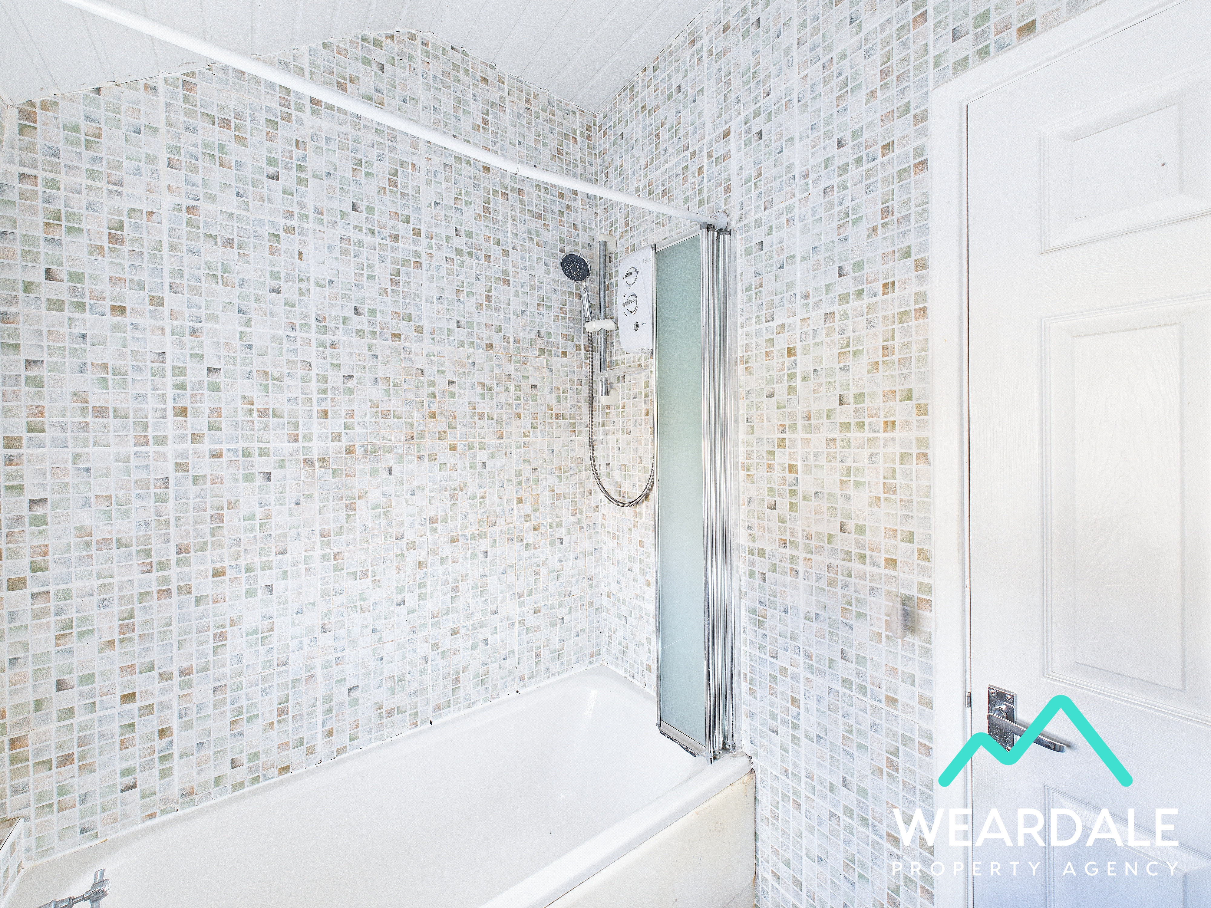 - Positioned to the rear of the property and accessed directly from the landing - Double-glazed uPVC window with frosted pane and deep uPVC sill to the Northern aspect - Vinyl flooring - Fully tiled walls - Clad ceiling - Panel bath with folding glass screen and overhead electric shower - WC - Hand-wash basin - Ceiling light fitting - Radiator - Extractor fan