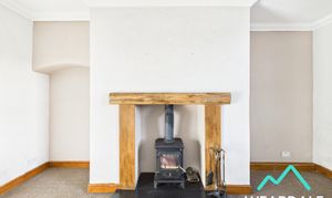 - Positioned to the front of the property, accessed from the entrance hallway and providing onward internal access to the kitchen - Double-glazed uPVC window with deep wooden sill to the Southern aspect, looking over the front garden and providing stunning views of the surrounding hillsides - Carpeted - Neutrally decorated - Multi-fuel burner set on marble hearth with wooden surround and mantle - Built-in under stairs storage cupboard - Two ceiling light fittings - Radiator - Space for freestanding furniture