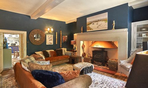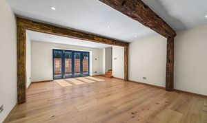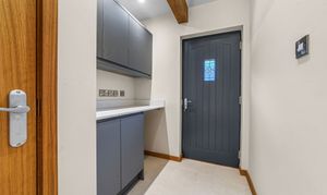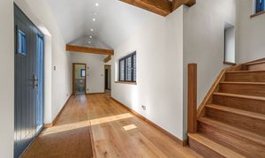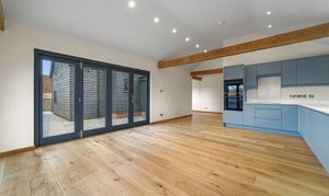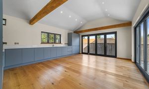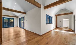 Inside, the property continues to impress. The accommodation has been thoughtfully arranged, with an emphasis on space, light, and flow. A large hall sets the tone on entry, offering a versatile area that could easily be adapted for home working, a library space, or simply a quiet corner for books and reading. From here, the home unfolds into a welcoming sitting room, housed within the original barn, creating a cosy retreat full of character where exposed beams and authentic finishes provide a strong sense of history. The newly built extension introduces a spectacular open-plan kitchen and dining space, beautifully appointed with contemporary cabinetry, luxurious work surfaces, and integrated appliances. Bi-fold doors open directly onto the garden, creating a seamless connection between inside and out, ideal for both entertaining and everyday living. A utility room and cloakroom complete the ground floor, ensuring practicality as well as style.