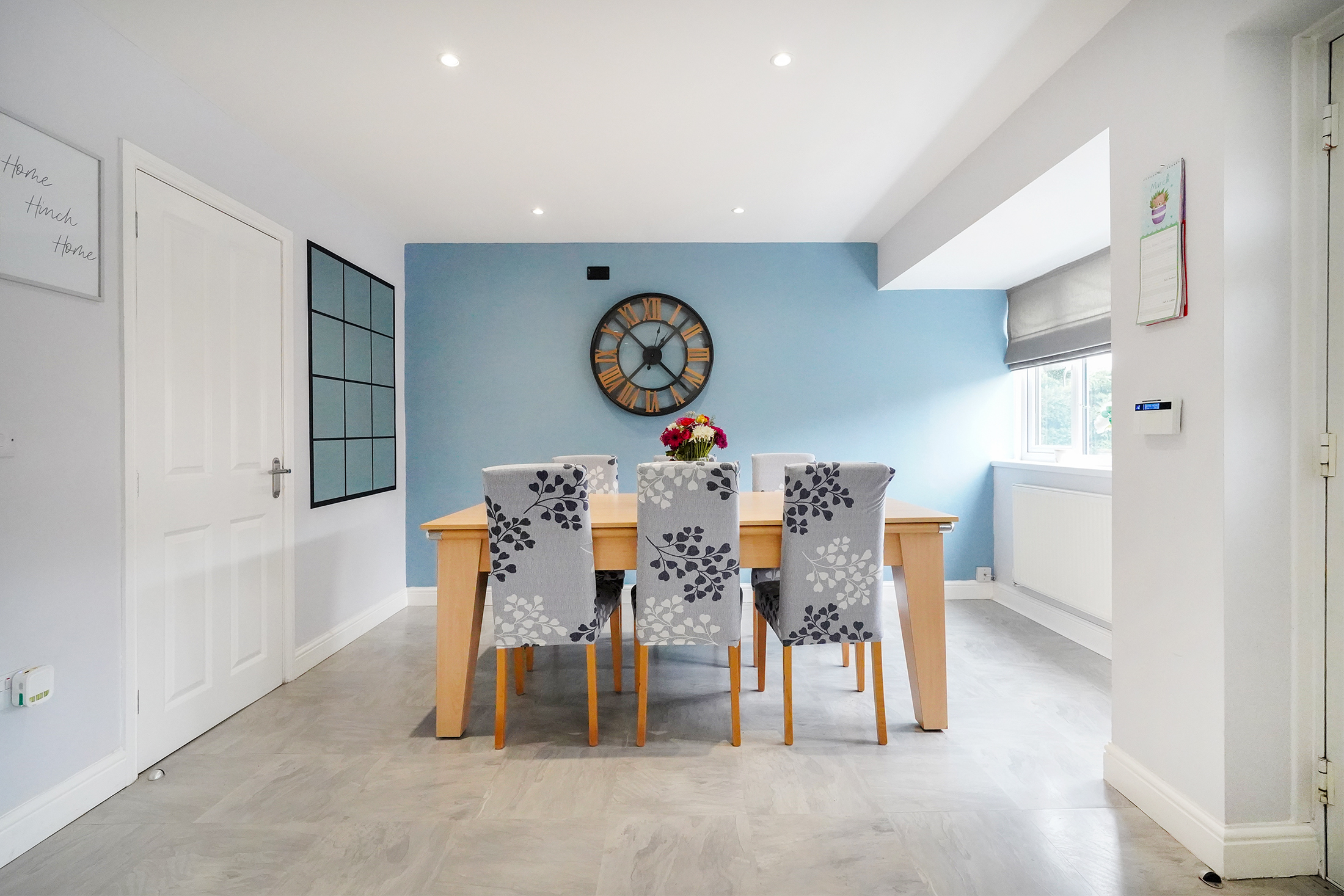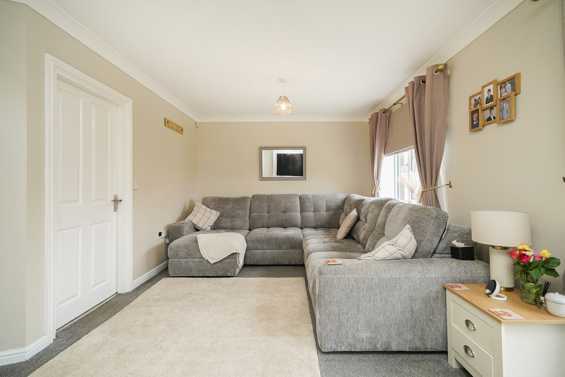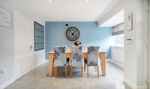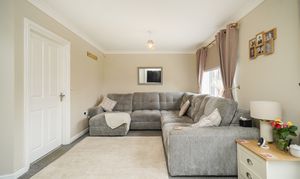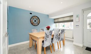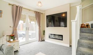 The property opens with a modern kitchen-diner, which boasts integrated appliances, quartz worktops, feature lighting and a generous dining area, making it ideal for bringing the family together at meal times. A practical ground-floor utility room with W.C., positioned just off the kitchen, adds convenience. The light and airy lounge allows access to the garden via French doors and is flooded with natural light, providing a comfortable main reception space.