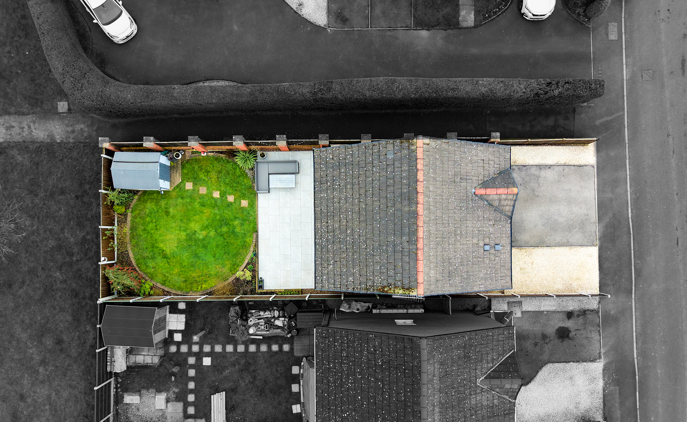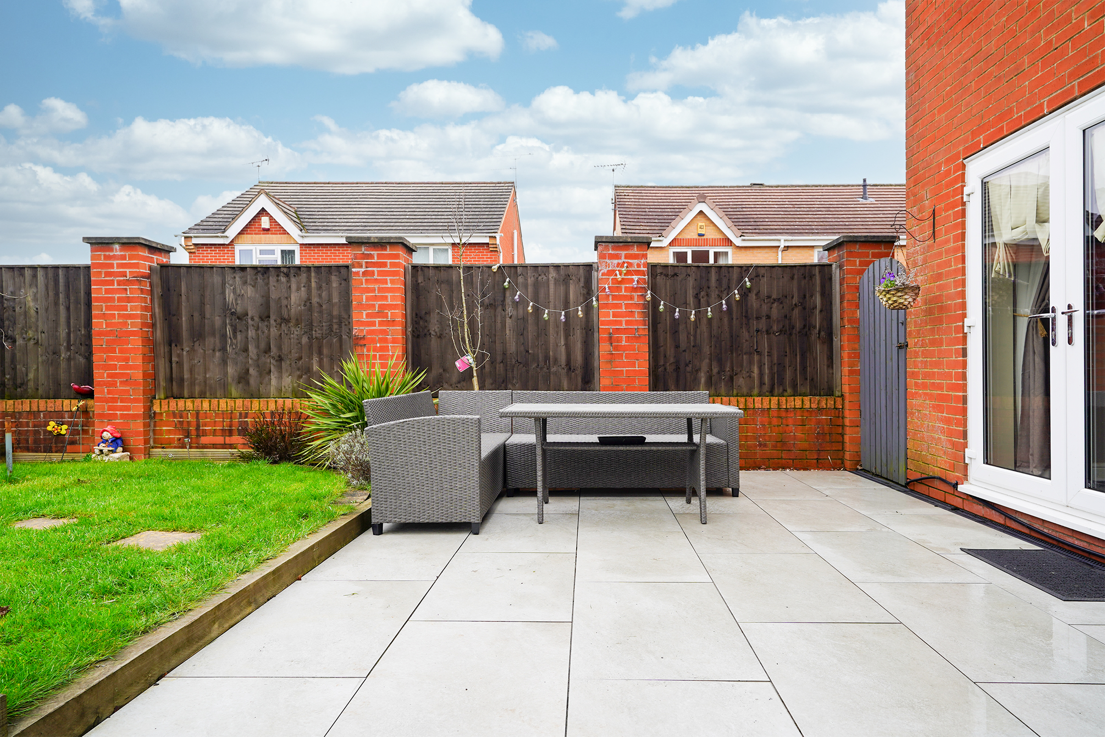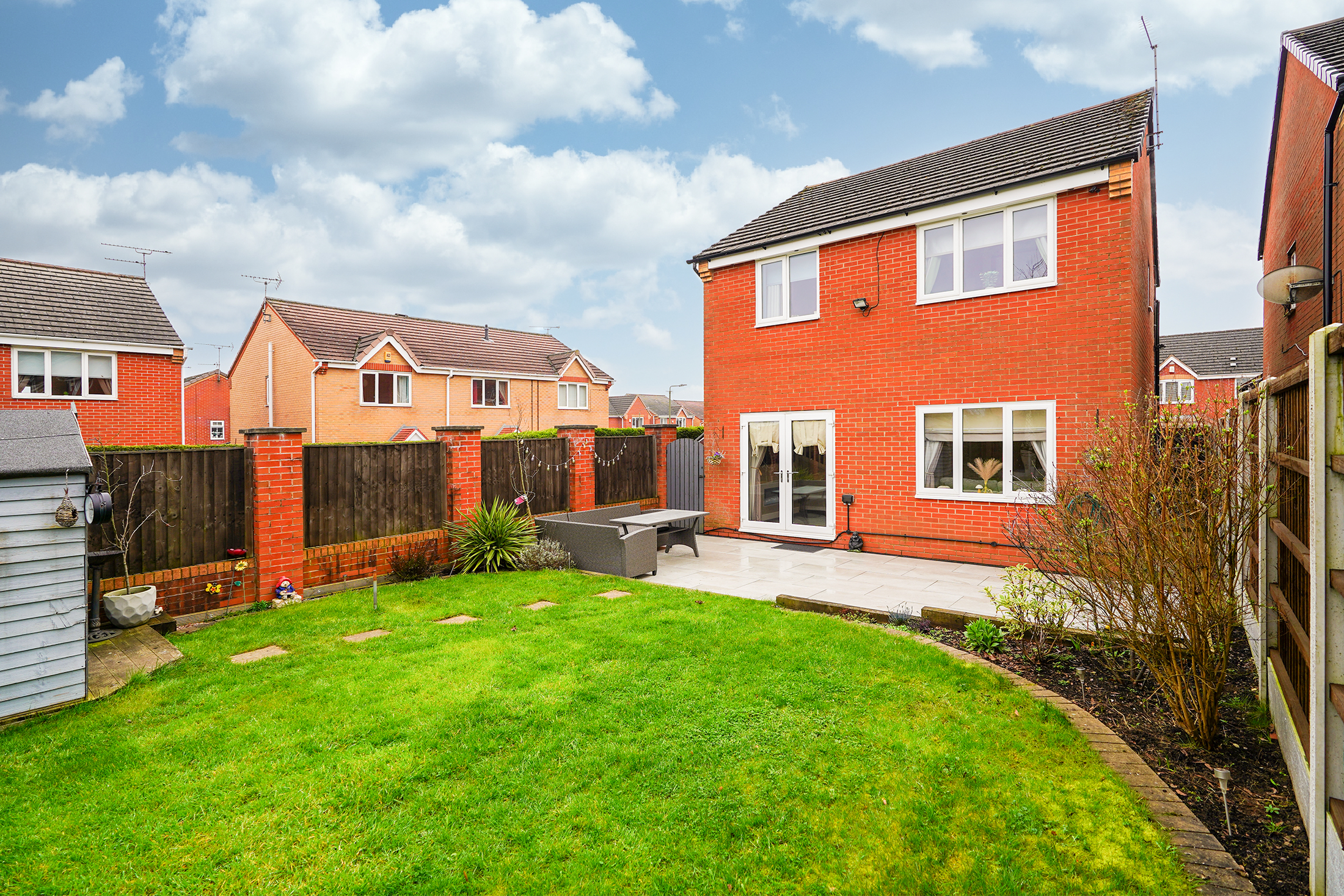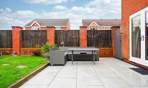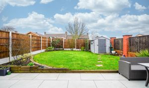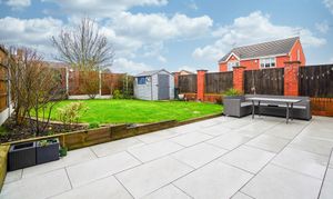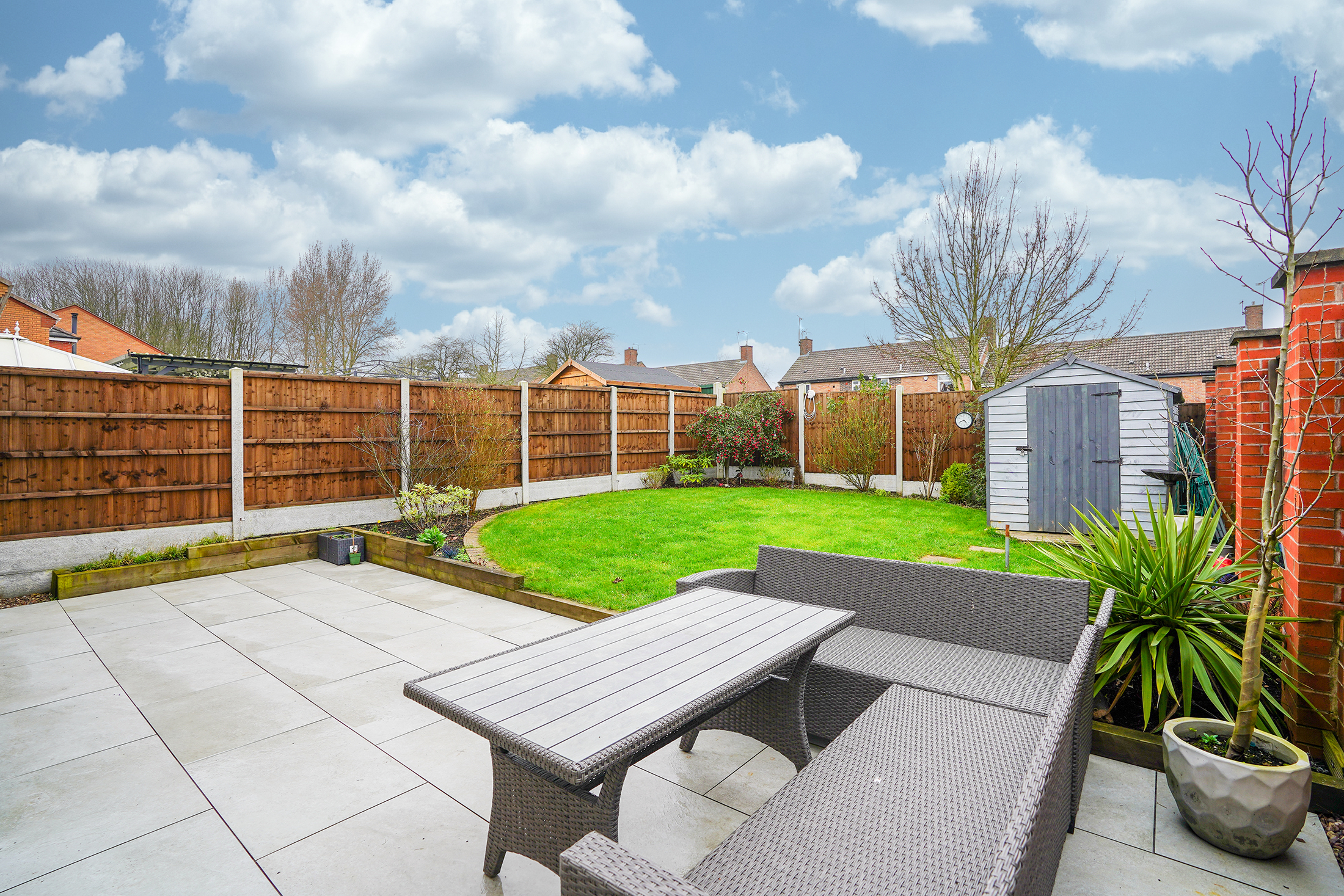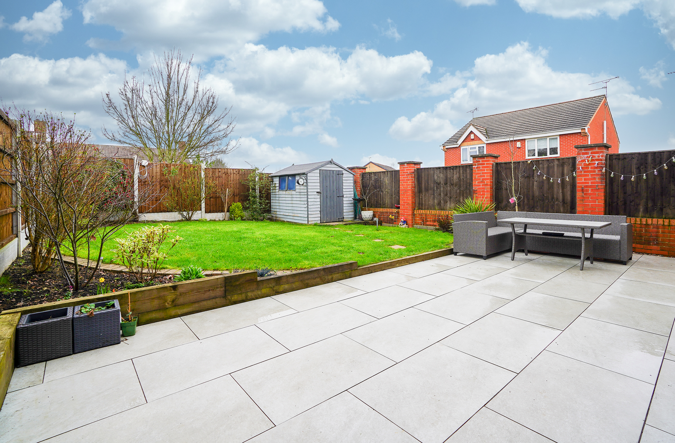 - Landscaped Garden With Tiled Patio, Lawn, Shed & Borders