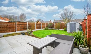 Stepping outside, you will find a superbly landscaped rear garden, complete with a tiled patio area, a well-maintained lawn, and attractive borders that add colour throughout the seasons. There is also a useful shed for additional storage. The front of the property benefits from a driveway with space for two vehicles, ensuring parking is never an issue.