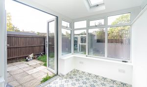 The ground floor comprises a spacious entrance hall which opens to a living room with under-stairs storage and a front bay window with shutters. The kitchen comprises a range of wall and base units, in a white matt finish with built-in oven, 4-ring gas hob and extractor hood, integrated dishwasher and fridge/freezer. The dining area has space for a 6-seater dining table, French doors leading to the garden and access to the ground-floor WC. Accessed via the garden is a home office/garden room which provides a versatile study space or play room and has a vaulted ceiling with three Velux windows, French doors and tiled flooring.