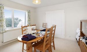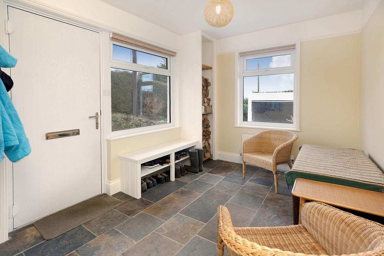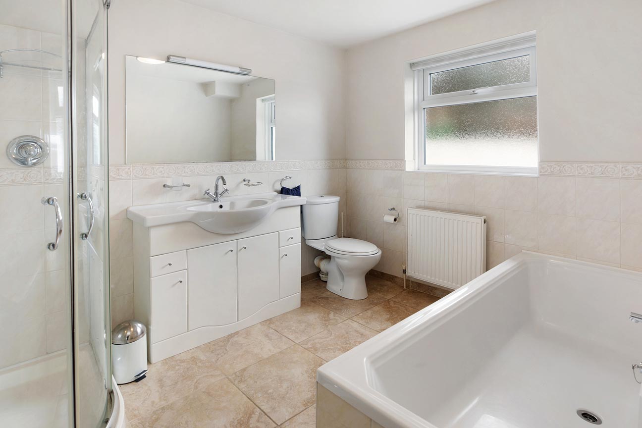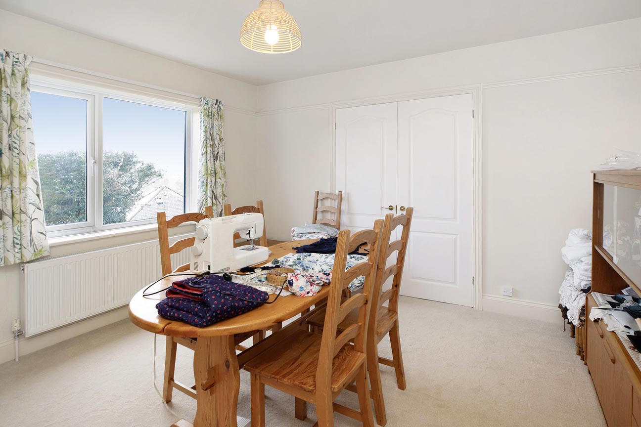 Upon entering through the front door, you step into a welcoming porch with a practical bench and log storage, tiled flooring, and dual aspect windows allowing natural light to brighten the space. This leads seamlessly to the principal ground-floor rooms. From the entrance hall, to the right a door leads directly into the utility room — a highly convenient space with plumbing for washing machine and tumble dryer, shelving/storage, and a WC. Adjacent to the utility, there is the ground-floor family bathroom this is well-appointed, featuring a white suite with a bath, separate shower cubicle, wash basin, WC, heated towel rail, and a frosted window for privacy and light. The ground floor offers excellent flexibility with two bedrooms positioned conveniently off the central hallway. The first bedroom is a generous double room with built-in wardrobes and a peaceful outlook over the left side of the garden, ideal as a guest bedroom or home office. The second bedroom similar to the first bedroom is a good size double which enjoys natural light from a large window, built-in wardrobes.