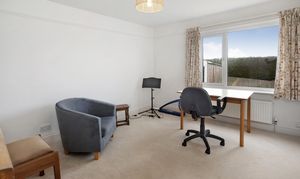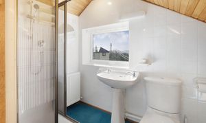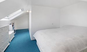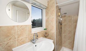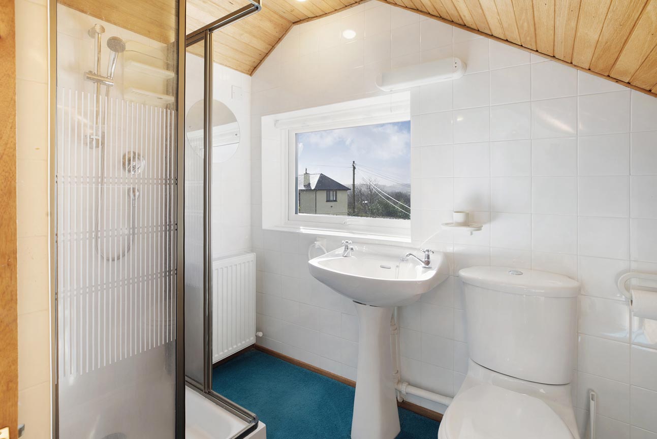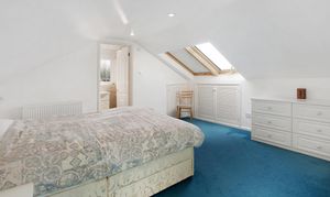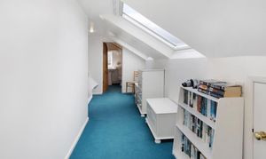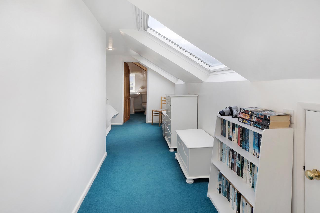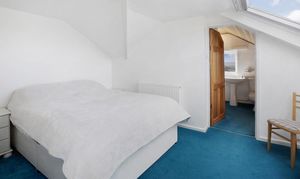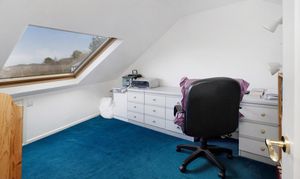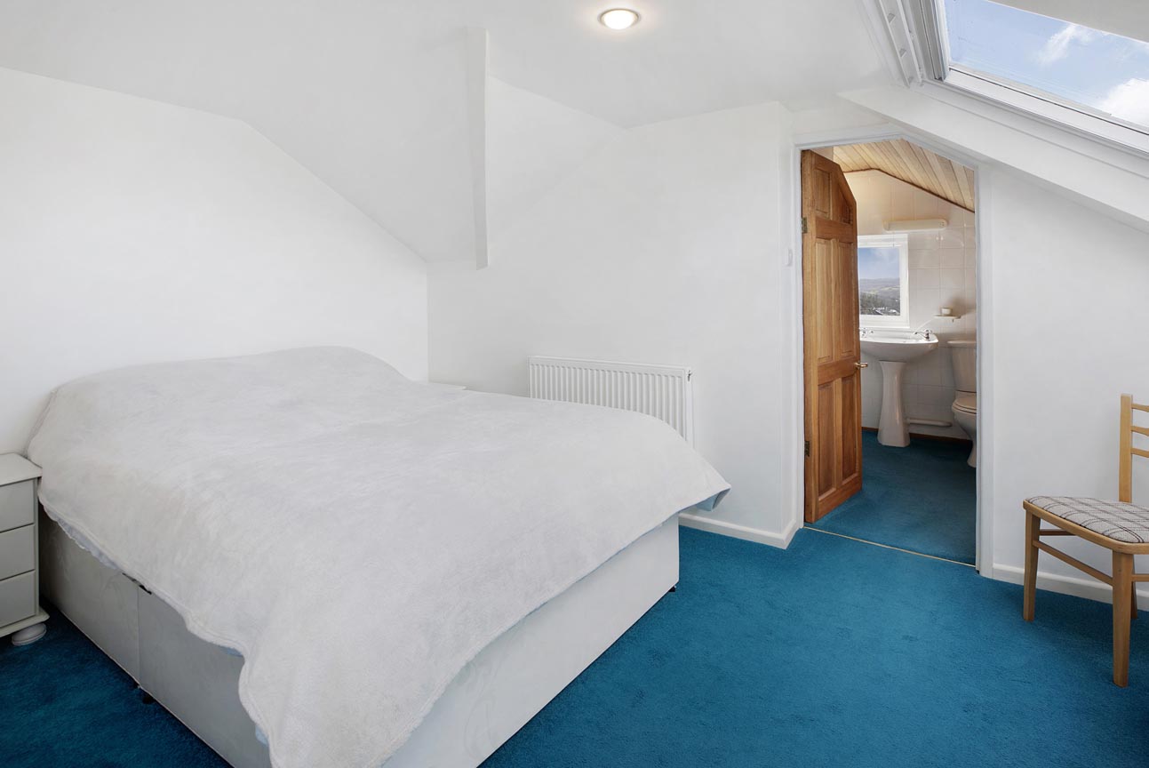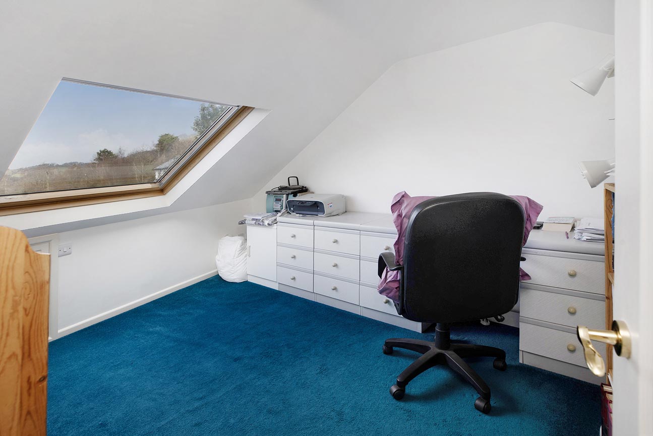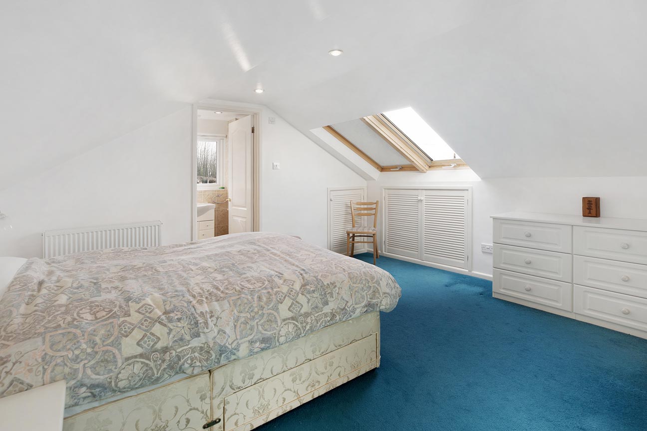 Ascending the staircase from the entrance hall, the first-floor landing is light and airy, served by a window that brings in plenty of natural daylight. This leads to three further well-proportioned bedrooms. The principal bedroom is a generous double with built-in wardrobes and drawers, a peaceful aspect with Velux windows, and its own En-suite shower room comprising a shower cubicle, WC, and wash basin. The second bedroom is another good-sized double enjoying lovely countryside views through its large Velux windows. It also holds a En-suite shower room, with a shower cubical, WC and wash basin. Completing the accommodation is a versatile third bedroom/study with space for ample storage, and skylights offering inspiring outlooks over the garden and distant landscape — ideal for work, creative pursuits, or as a quiet retreat.