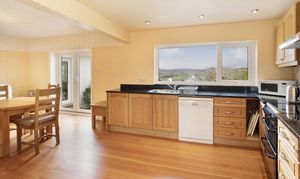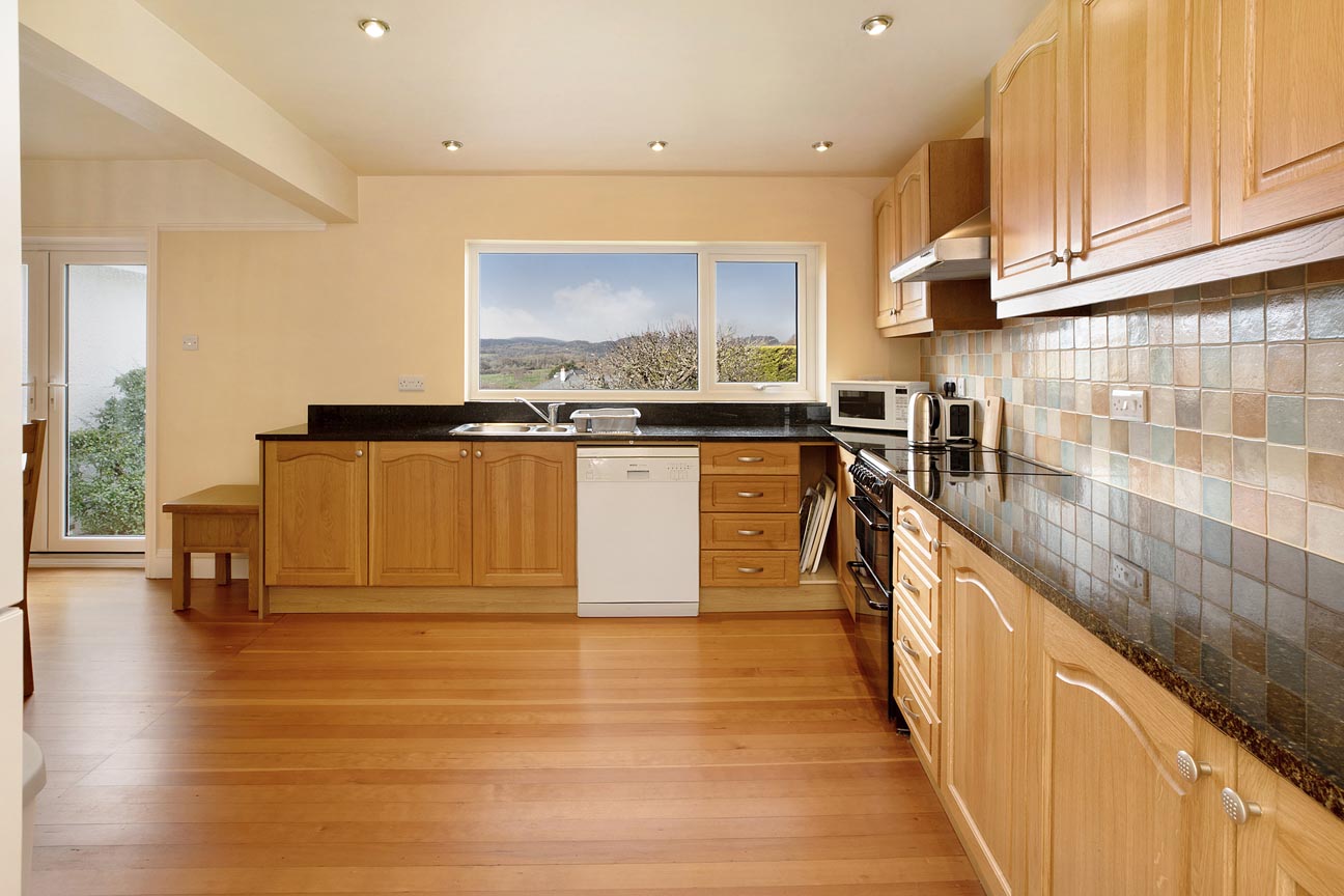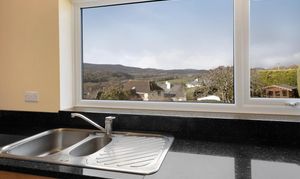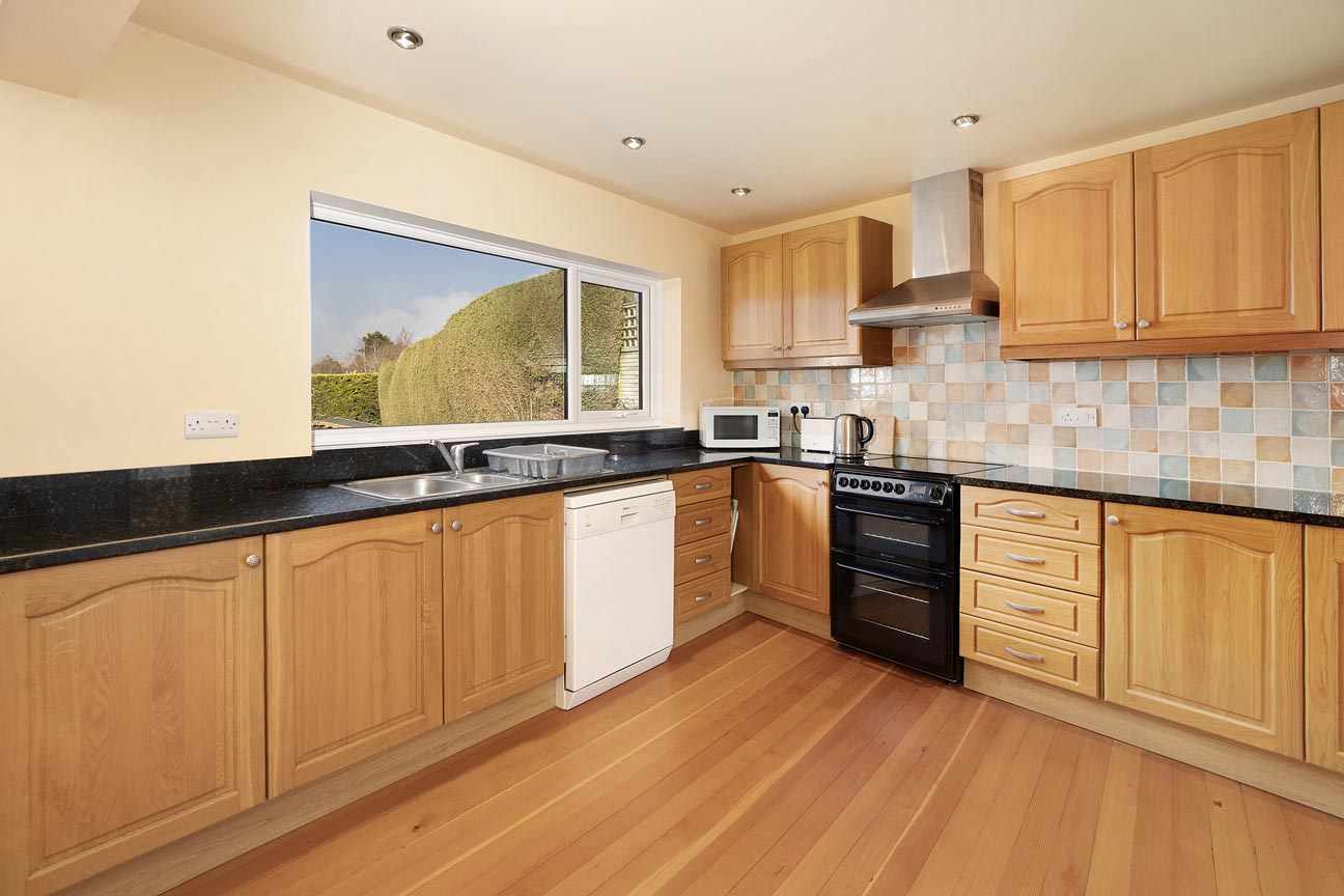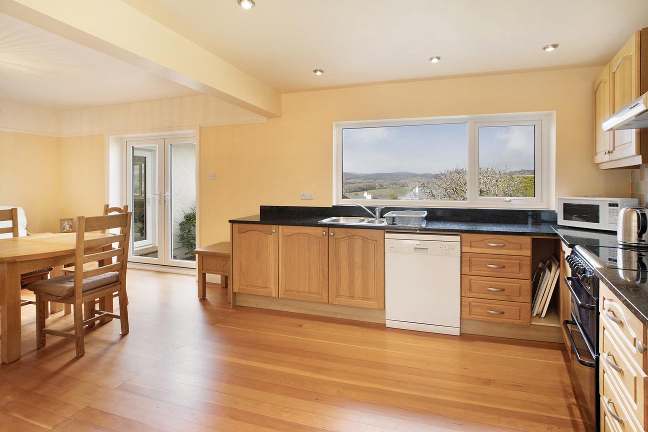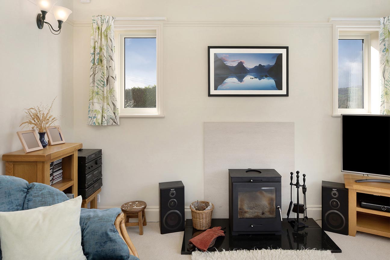 Moving through the home, the dining room is a bright and spacious formal dining area with a large window capturing those stunning countryside views, making it an elegant spot for family meals or entertaining and with double double doors leading to the lounge. Continuing the flow of the home, on the right is the open and sociable kitchen/breakfast room — the true hub of the property. The kitchen is fitted with attractive wooden-fronted units, generous black granite work surfaces, oven/hob, and space for additional appliances, two storage cupboards that also host the hot water tank and buffer tank for the air source heat pump. A large window and french doors allows panoramic rural views, flooding the room with light and connecting it visually to the garden. The breakfast room area provides a cosy, informal dining spot with the same exceptional outlooks, creating a wonderful flow for daily family life. The impressive lounge is the standout reception room, featuring a cosy wood-burning stove set within a stone fireplace as its centrepiece. Dual-aspect windows and a patio door opens onto the garden, framing breath-taking far-reaching views across rolling hills and valleys — an inviting space for relaxation, reading by the fire, or gathering with loved ones.