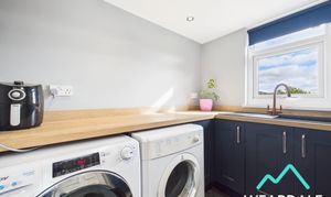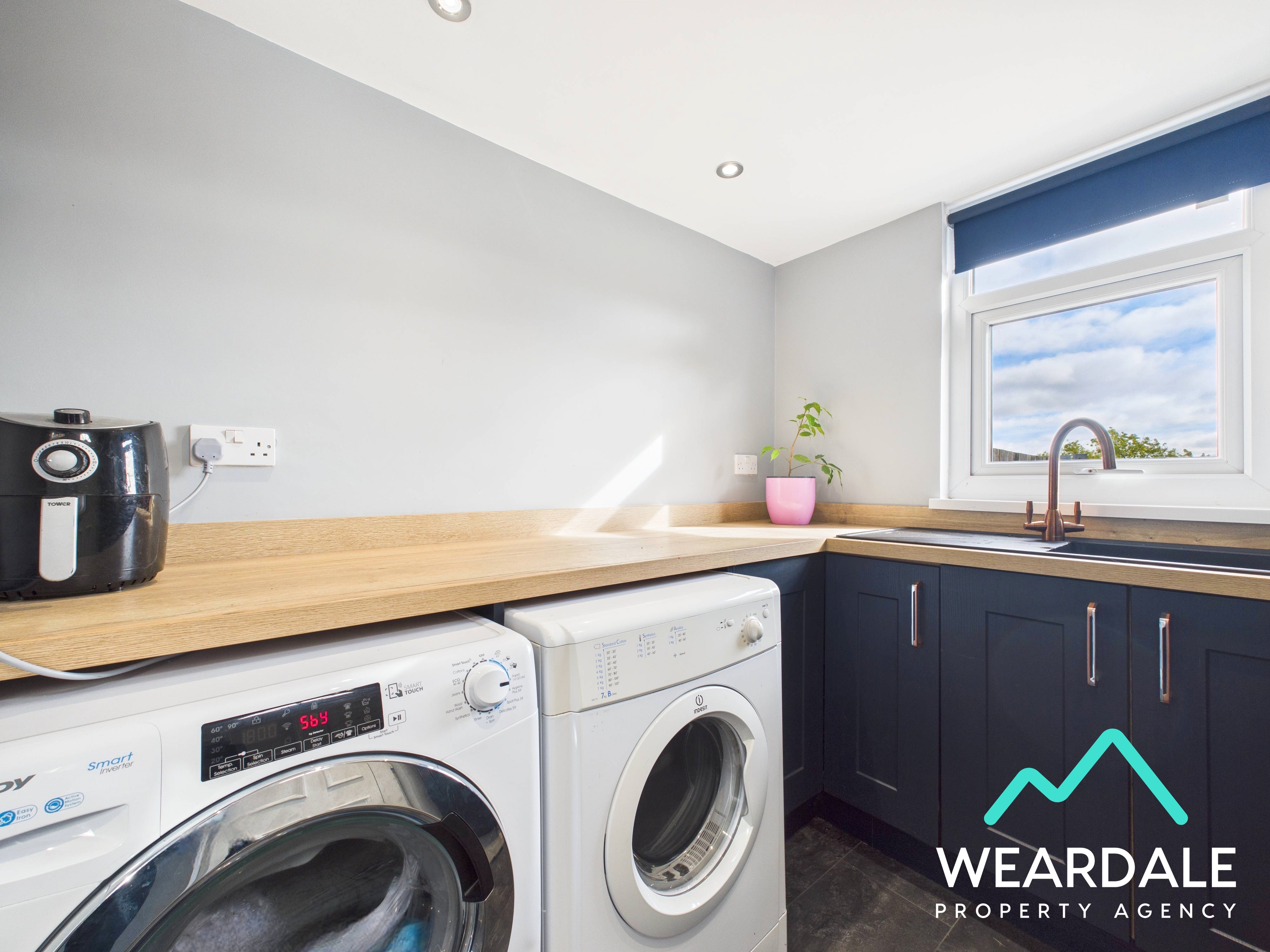 - The utility room is open plan with the kitchen, being positioned to the rear of the property and providing external access to the garden via a uPVC door - uPVC windows to the Southeastern and Western aspects - Further laminate worksurface with additional composite sink and under counter storage units - Ample space for a freestanding fridge freezer and plumbing for a washing machine and tumble dryer - Vinyl tile flooring - Modern vertical radiator - Ceiling spotlights