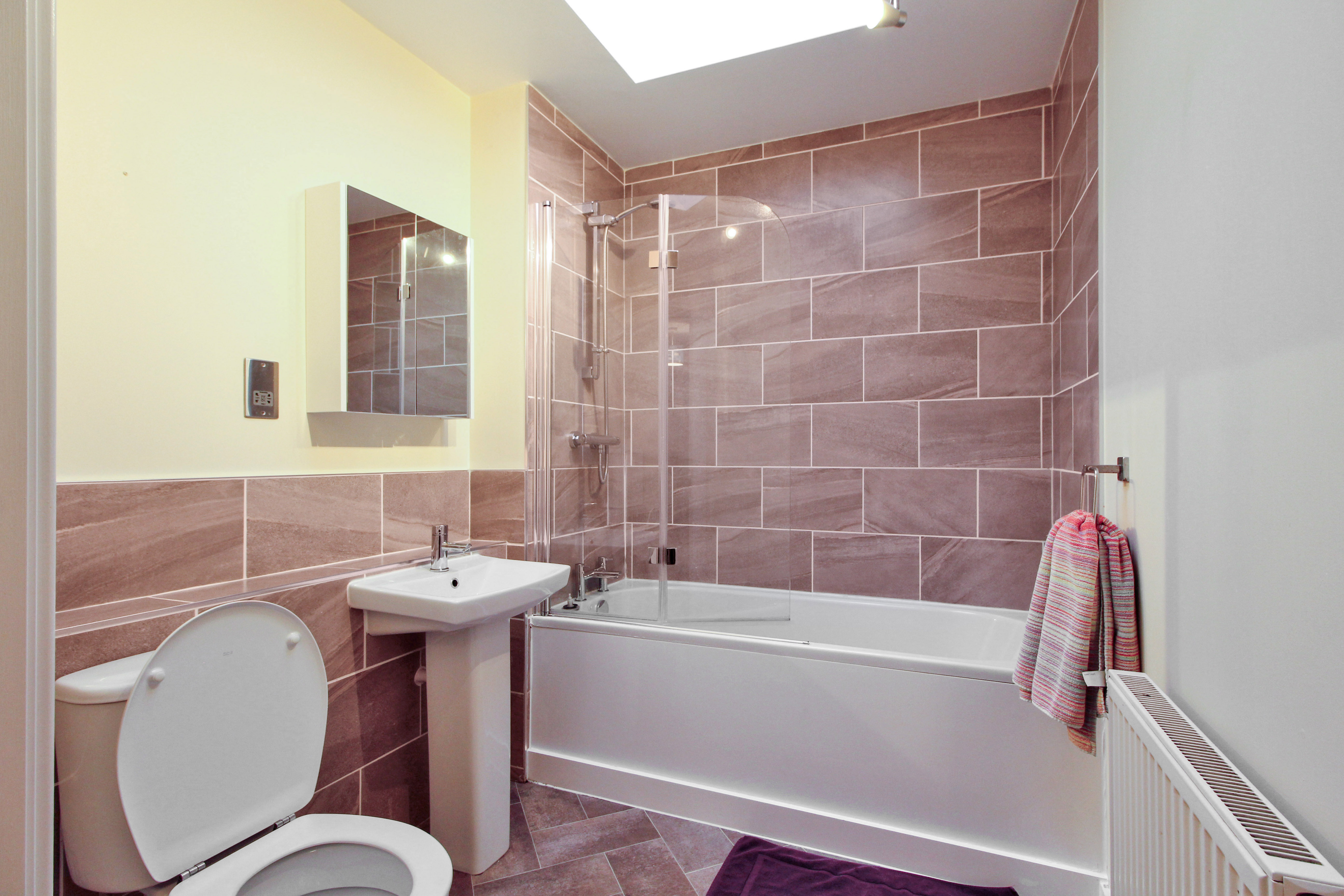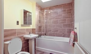A modern bathroom fitted with a white suite comprising a panelled bath with glass shower screen and shower over, pedestal wash hand basin, and low-level WC. The room is finished with part-tiled walls and tiled flooring, complemented by a skylight providing natural light. A radiator completes this well-presented and practical bathroom.