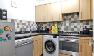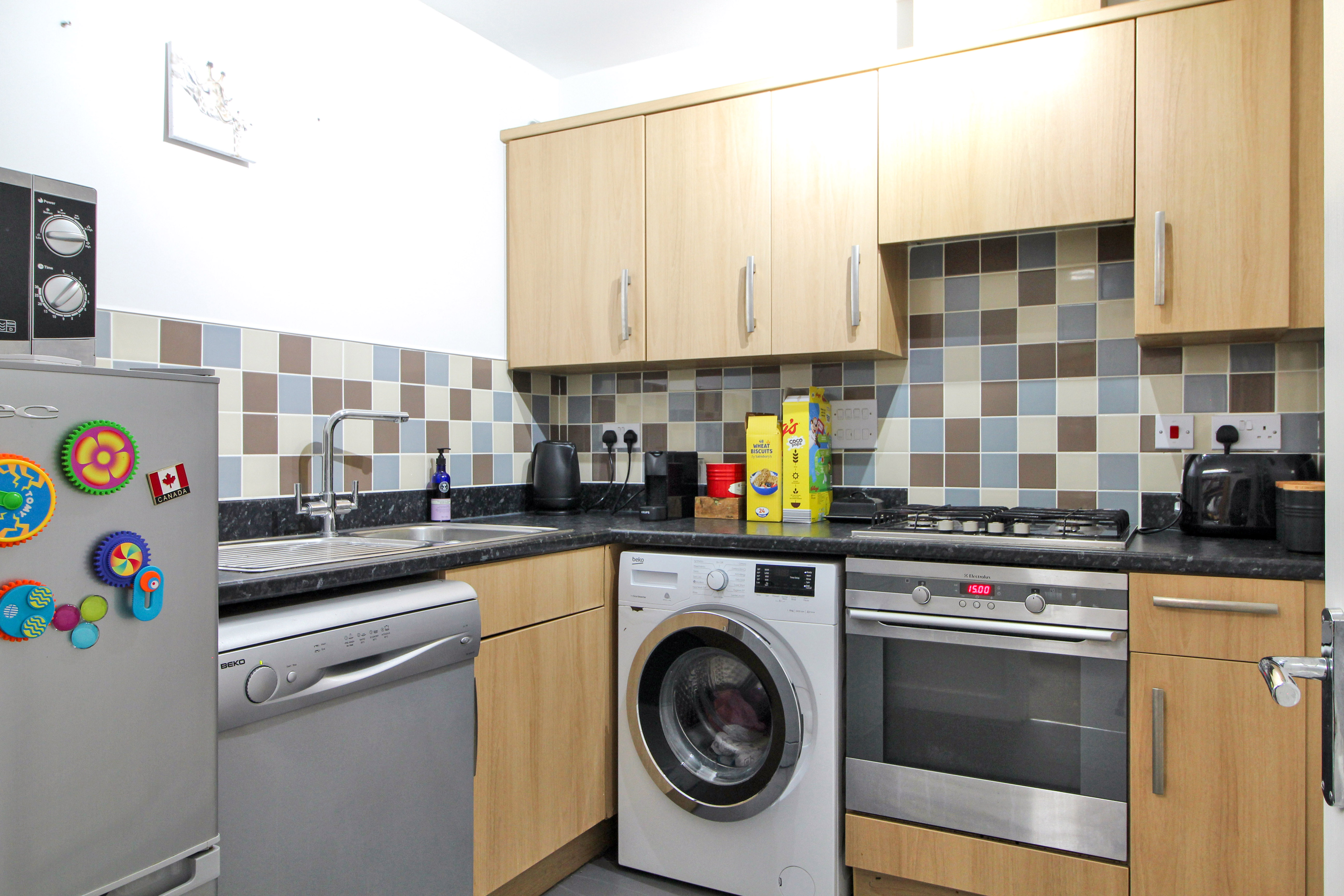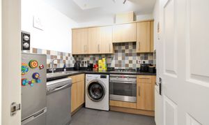 A well-arranged kitchen fitted with a range of matching wall and base units providing ample storage. Work surfaces incorporate a stainless steel sink with mixer tap, complemented by part-tiled splashbacks. Integrated cooking facilities include an oven with hob, along with space and plumbing for a washing machine and dishwasher, and space for a freestanding fridge/freezer. A skylight provides natural light, while practical flooring and neutral finishes complete this functional and well presented kitchen.