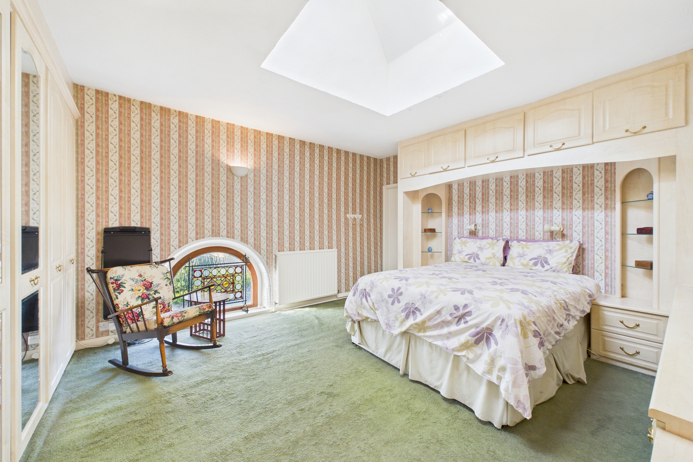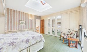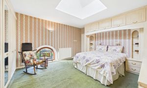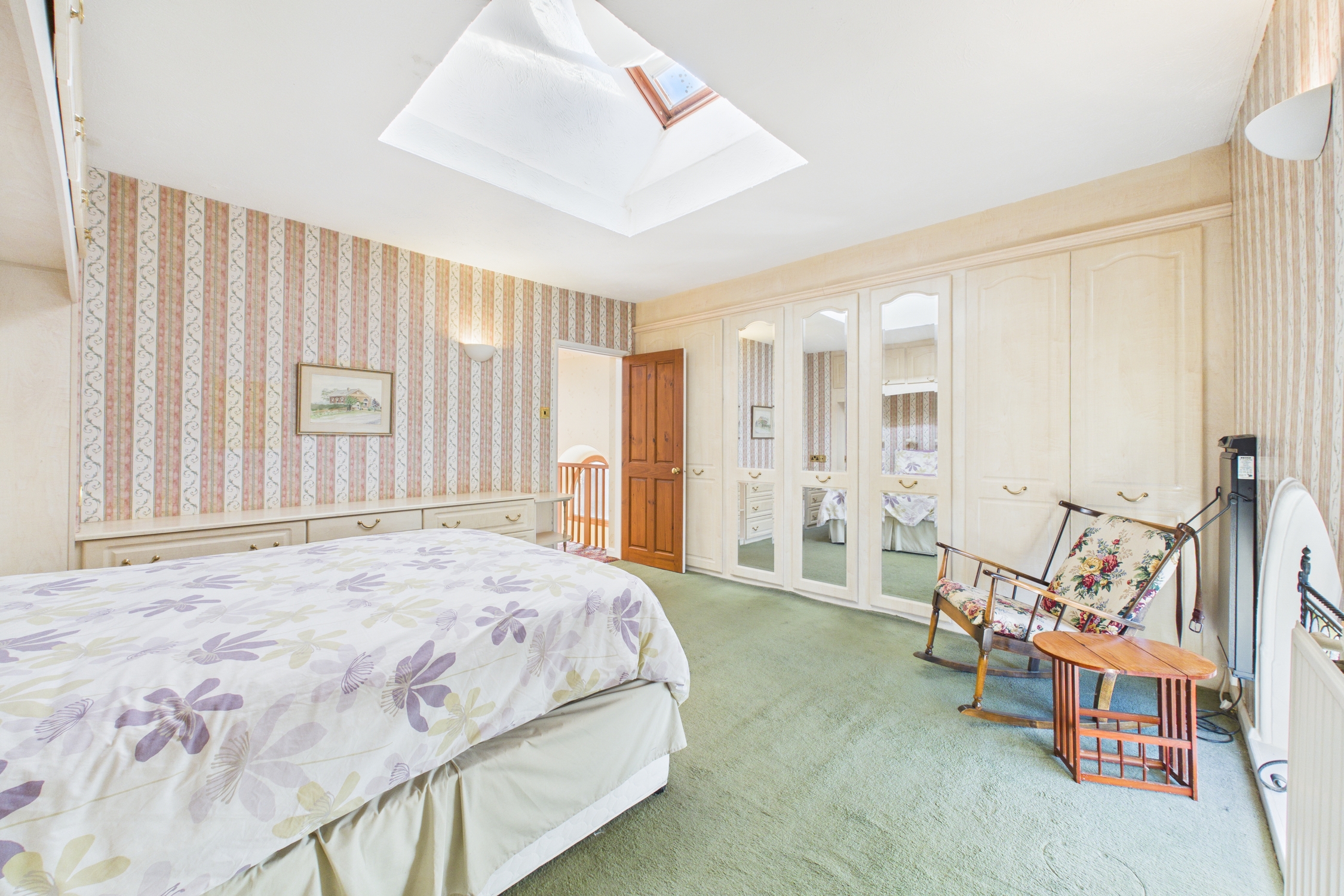 Velux window to front and window to side, radiator, carpet flooring, built in wardrobes with matching dresser and over bed storage and door to en-suite.