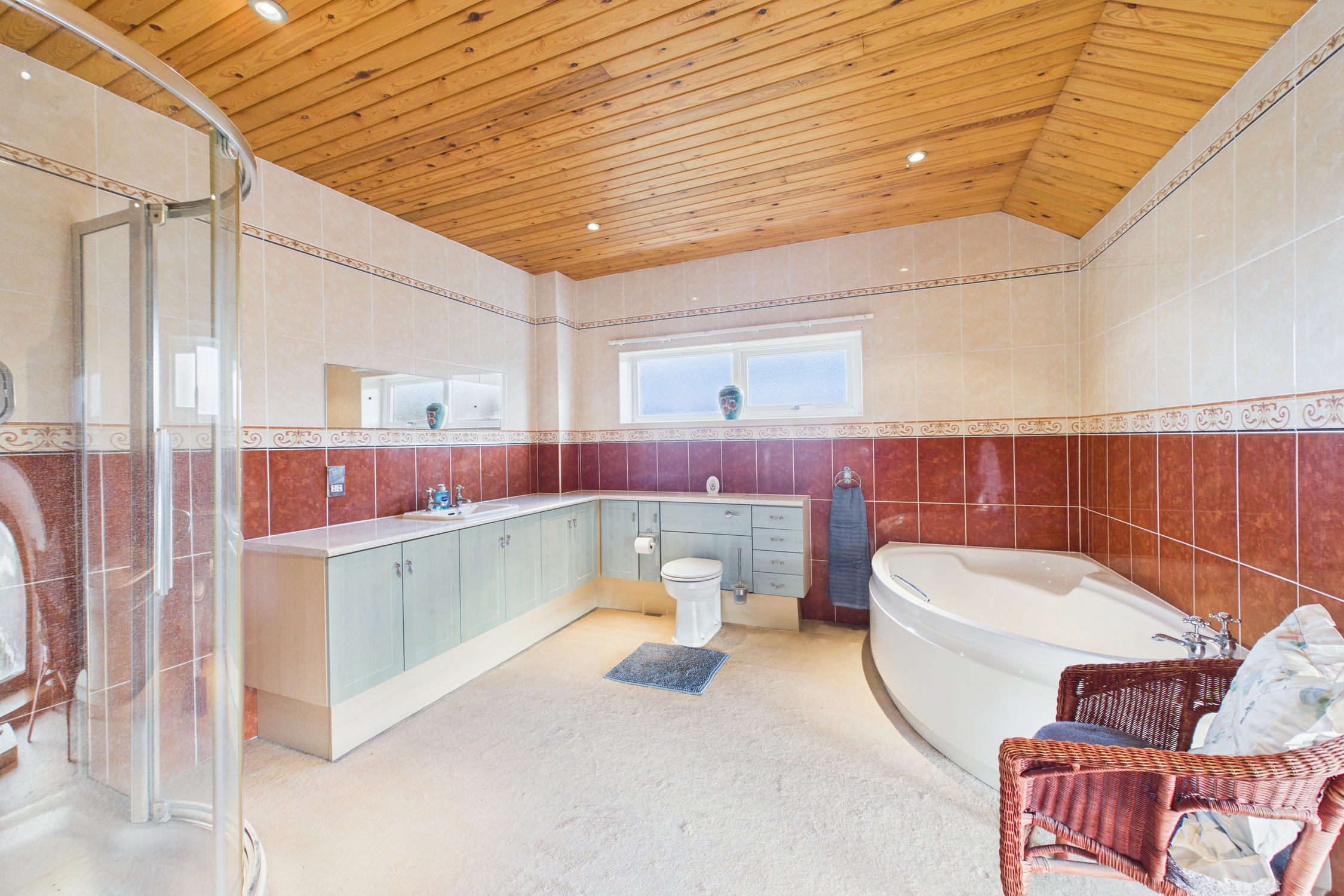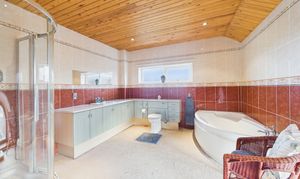 Window to front and side, large corner bath with duel taps over, double width shower cubicle with built-in seat and shower jets, low-level WC with concealed system, vanity style sink unit with storage under, fully tiled walls, carpet flooring, shaving point and heated towel rail.