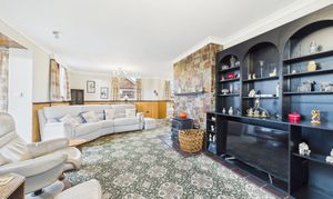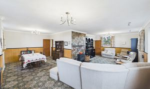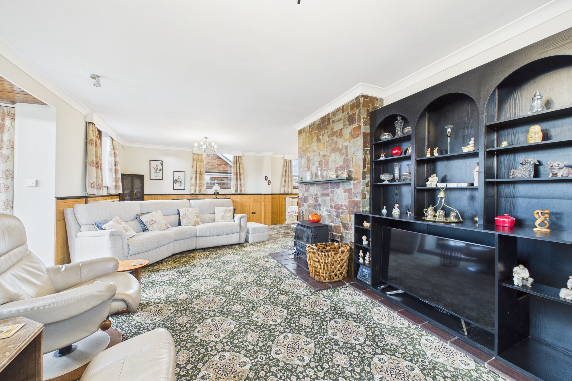 Large L shape room with window to front, bay window with two further windows to side and two windows to rear, three radiators, carpet flooring and fire surround with feature slate wall, stone plinth and log burner.