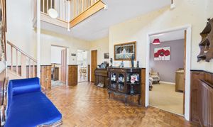 The grand entrance offers vaulted ceilings with views of the gallery landing, parquet flooring, doors to downstairs WC, lounge, dining room, study, kitchen / Breakfast room and under stairs storage cupboard, radiator and stairs to first floor landing. The original chapel organ has also been retained in the hallway.