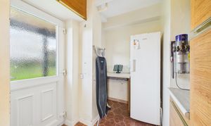 Wall and base units with worktop over, tiled splash backs and tiled flooring, space for washing machine and fridge freezer, window to rear and door to rear garden.