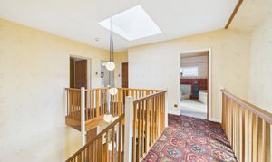 Gallery landing with doors to all bedrooms, bathroom and airing cupboard housing the hot water cylinder, Velux window to front, radiator and carpet floor flooring.