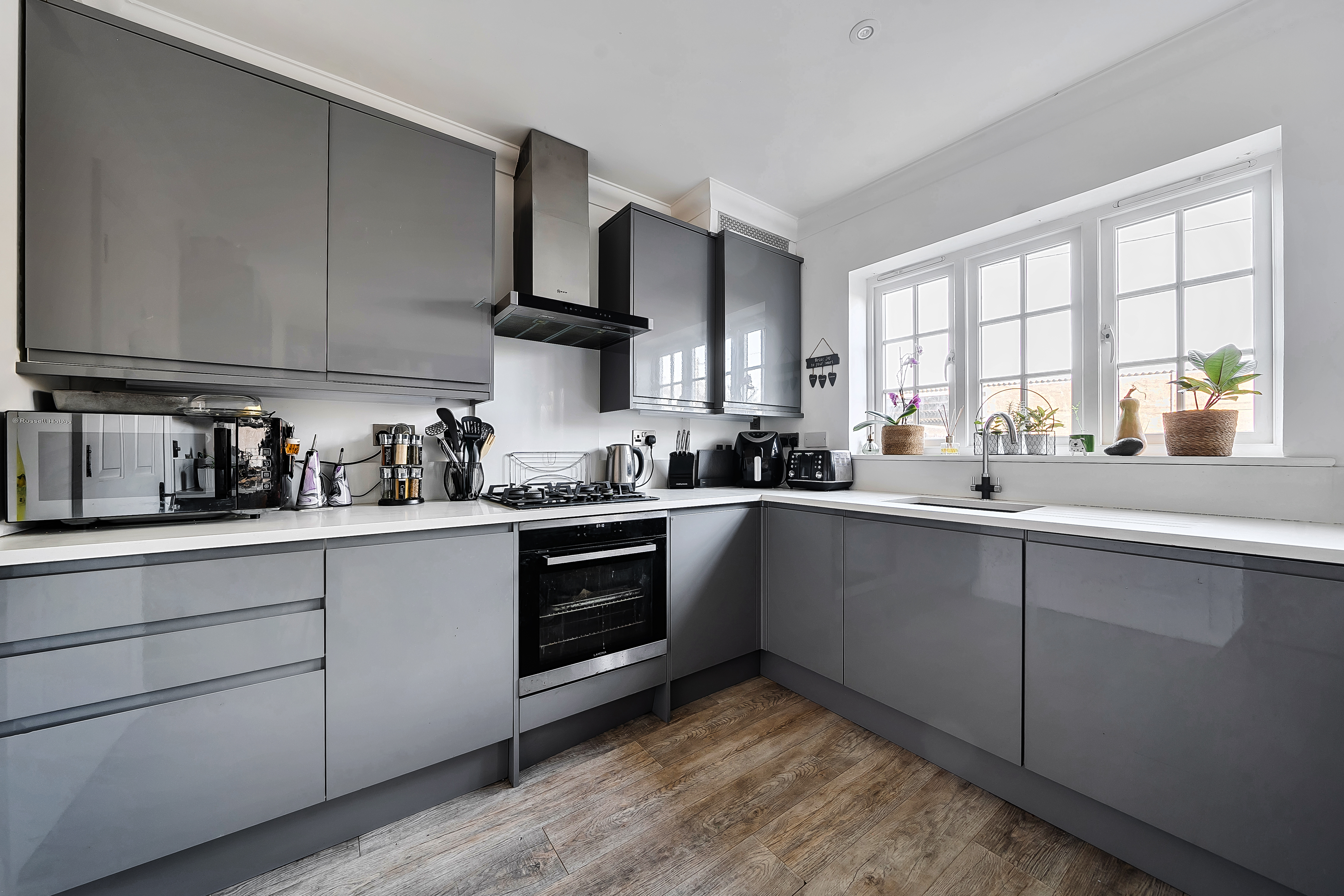 Laminate flooring, a range of matching wall and base units with granite worktop with built-in drainer grooves into sink, integrated Lamona oven, four ring gas hob over with Neff cooker hood above, integrated dishwasher, integrated washing machine, integrated fridge, integrated freezer, boiler, breakfast bar with seating for three stools, double glazed window to rear overlooking the garden, double glazed patio doors to rear, radiator, double doors leading into the lounge.
