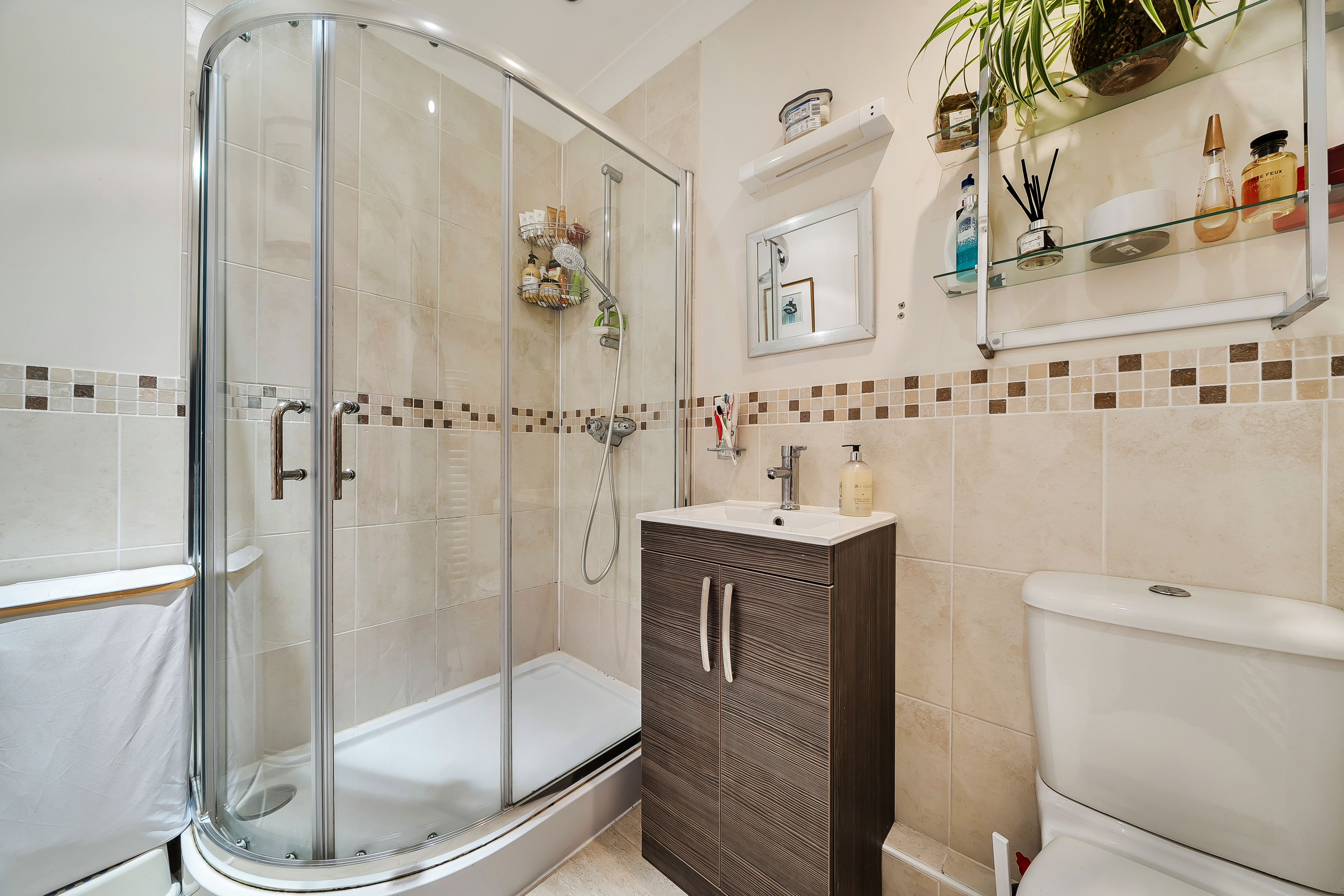 Tiled flooring, shower cubicle, low level WC, wash hand basin, heated towel rail.