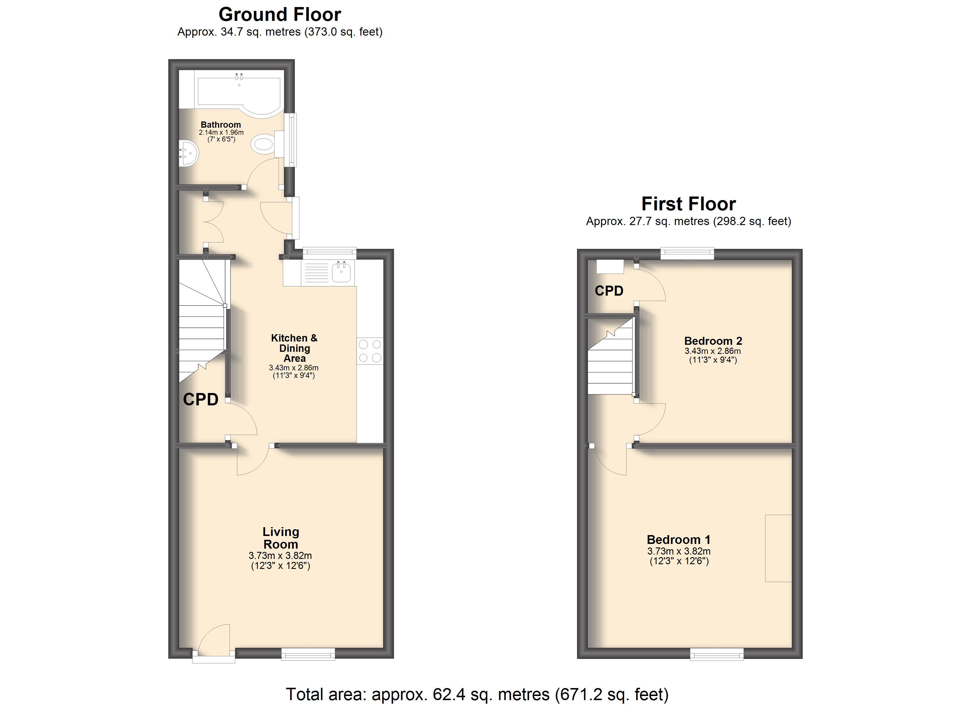 Upstairs, there are two generously sized bedrooms, each providing ample room for fitted or freestanding furniture. The modern bathroom, fitted with a three-piece suite, is conveniently located on the ground floor.