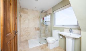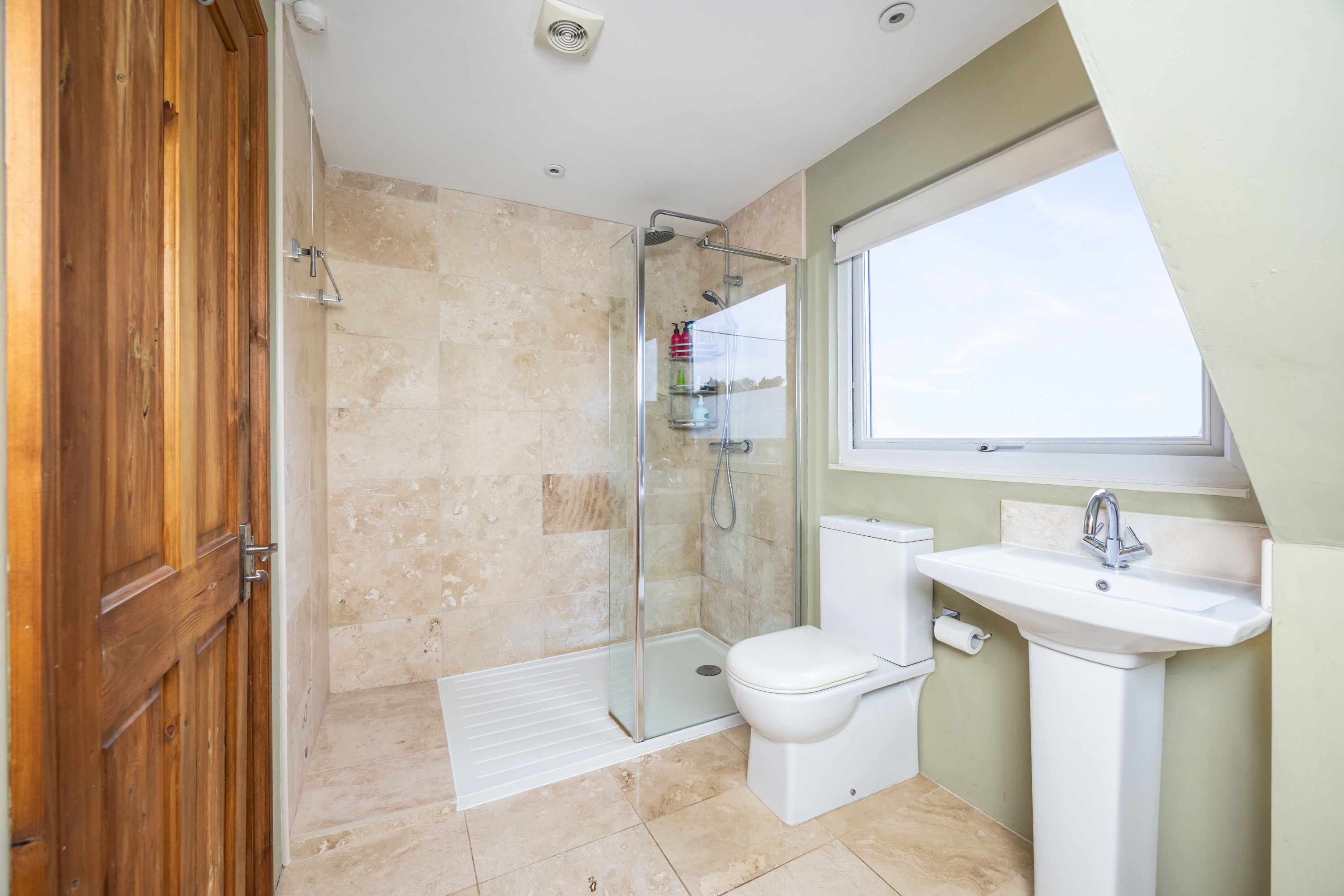 Up the stairs leads to the first floor landing with doors to two further bedrooms and upstairs shower room. The main bedroom is a dual aspect, bright and spacious rooms with uPVC double glazed Velux window fitted with blackout blind to the front elevation and uPVC double glazed dormer window overlooking the rear garden. Fitted wardrobes have been constructed into the eaves space to improve the storage. The other bedroom on this floor is a good size single bedroom/office space with Velux uPVC double glazed window to the front elevation and fitted cupboard space. The upstairs shower room is a three-piece suite with low level w/c, basin, large walk-in shower cubicle with dual rainfall/detachable shower heads. The eaves space has been fitted with shelves and a towel radiator.