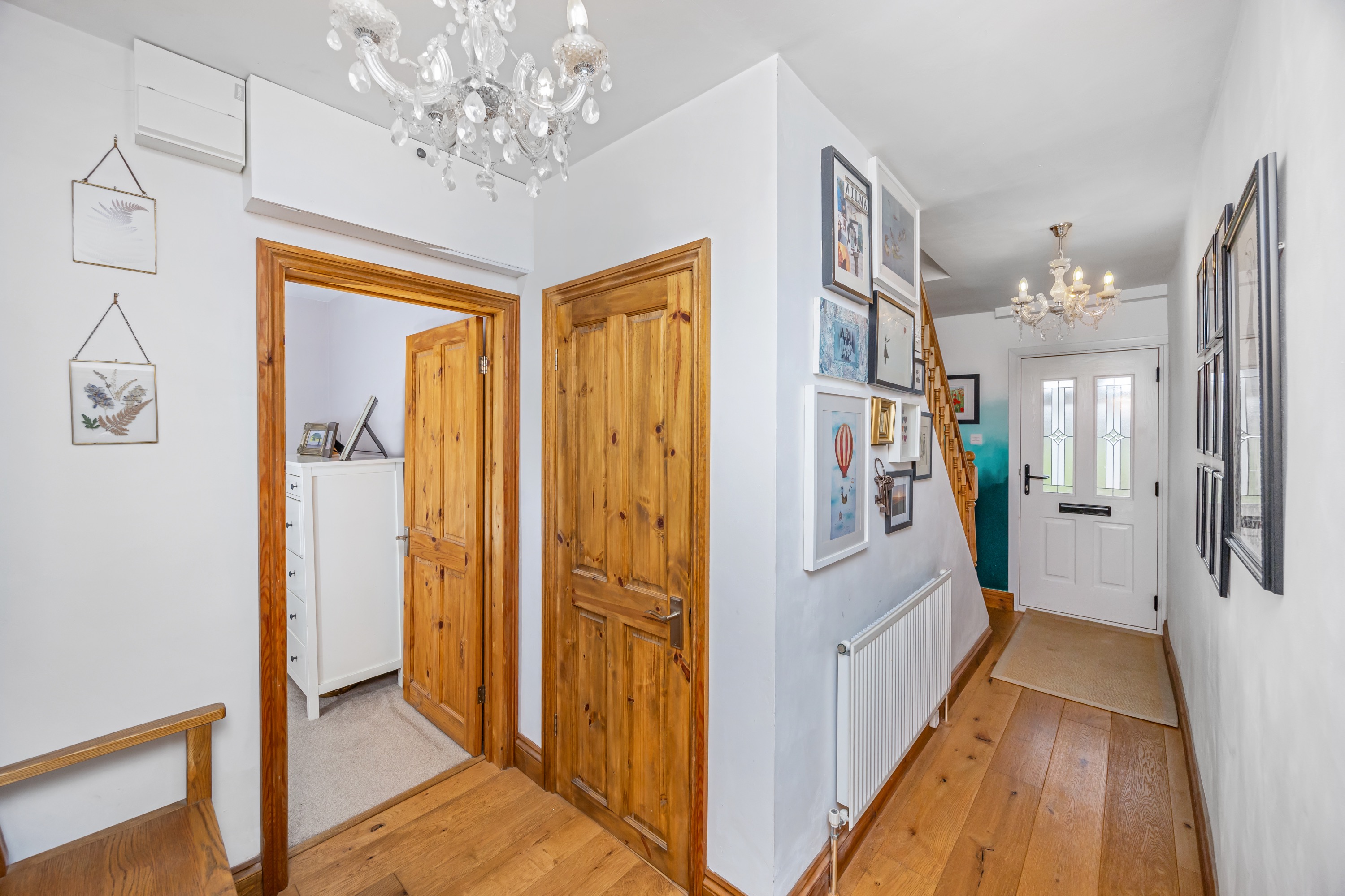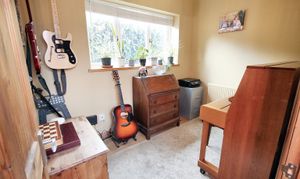 An oak porch provides cover to the composite double glazed front door leading into the hallway with doors to all rooms, stairs to the first floor and an understairs cupboard for coats/shoes storage. There are two downstairs bedrooms, the first being a large double bedroom with a uPVC double glazed window to the front fitted with blinds and curtains and offers plenty of space for freestanding furniture. The other downstairs bedroom is also a good size double with a uPVC double glazed window to the side. The downstairs bathroom is a three piece suite with low level w/c, basin, shower over bath and towel radiator. There is a further fifth bedroom/study with uPVC double glazed window to the side, multiple power sockets and BT OpenReach master socket.