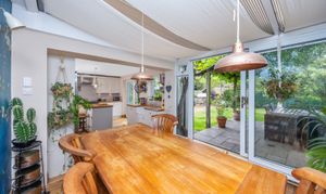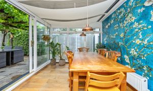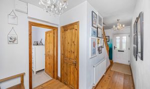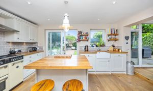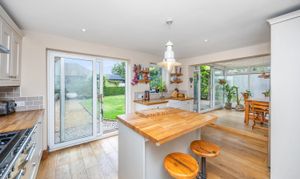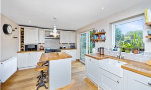 A door from the hallway leads into the kitchen/dining room passing through a short corridor lined with slatted doors providing larder storage and a space for a washing machine and tumble dryer to be stacked. The kitchen was refitted approximately in 2014 to contain a number of eye and base level cream coloured Shaker style solid Oak units with solid Oak countertops. The current owners have had a number of useful features and integrated appliances fitted including wine rack storage, an integrated microwave, integrated and concealed bins and Bosch dishwasher. There is space for a Rangemaster-style 5-ring gas hob/3 door oven to be fitted opposite a kitchen island fitted with similar solid Oak shaker style drawers with solid wood countertops. There is space for a two-door American style fridge/freezer with further fitted pantry storage surrounding. Lastly, the Glow Worm condensing boiler is concealed in a corner cupboard. The dining space is situated within a uPVC double glazed conservatory sensibly fitted with inlet window blinds for shade and temperature control. Both kitchen and dining spaces have a sliding uPVC double glazed door leading to the rear garden.