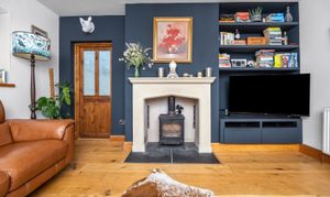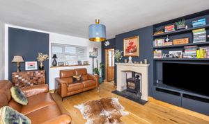 The living room is a bright & spacious room with a large uPVC double glazed window with fitted blinds to the front, fitted TV unit with shelves above and a decorative, feature, stone fireplace with wood burner. A door from the living room leads to a lean-to uPVC double glazed sun room.