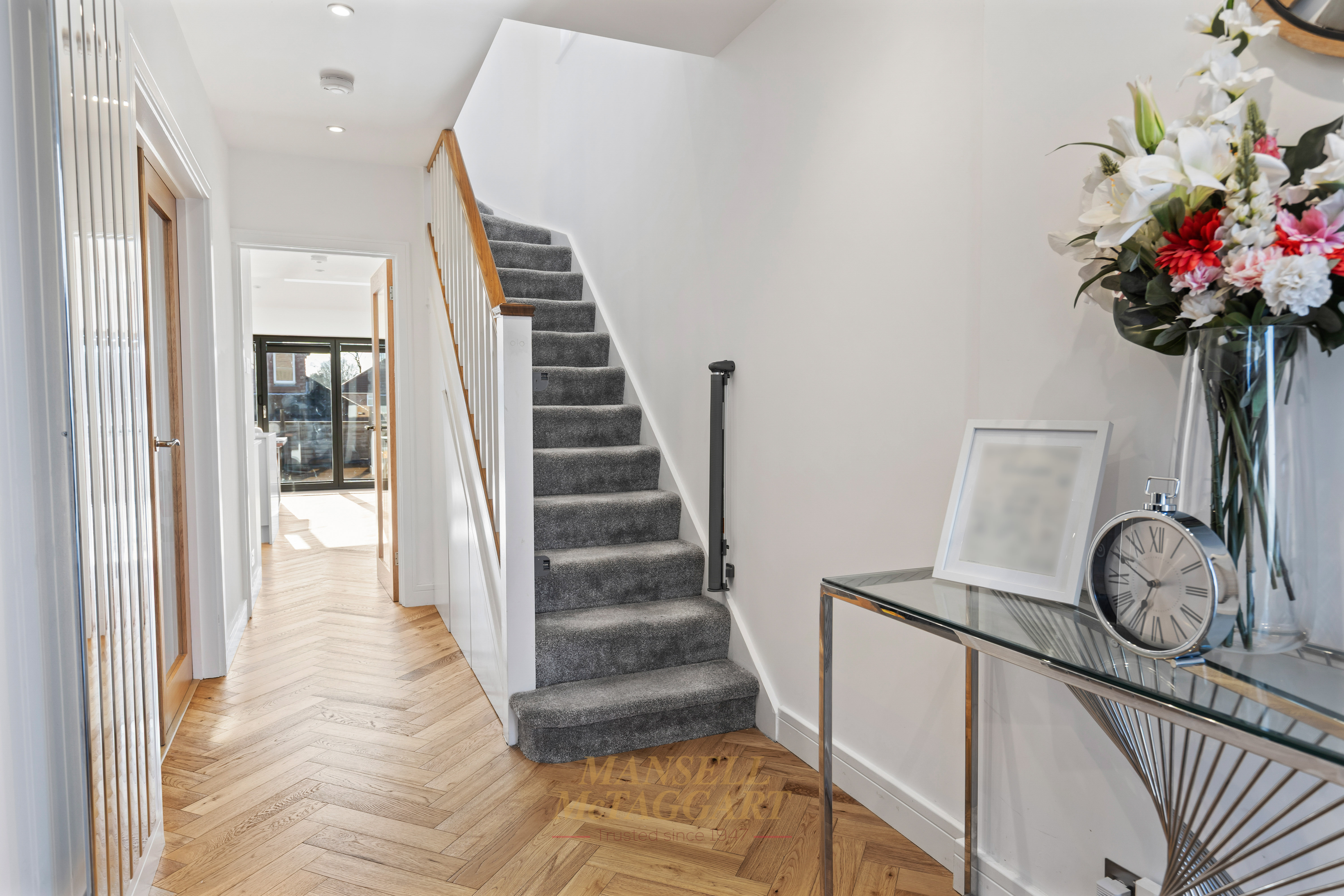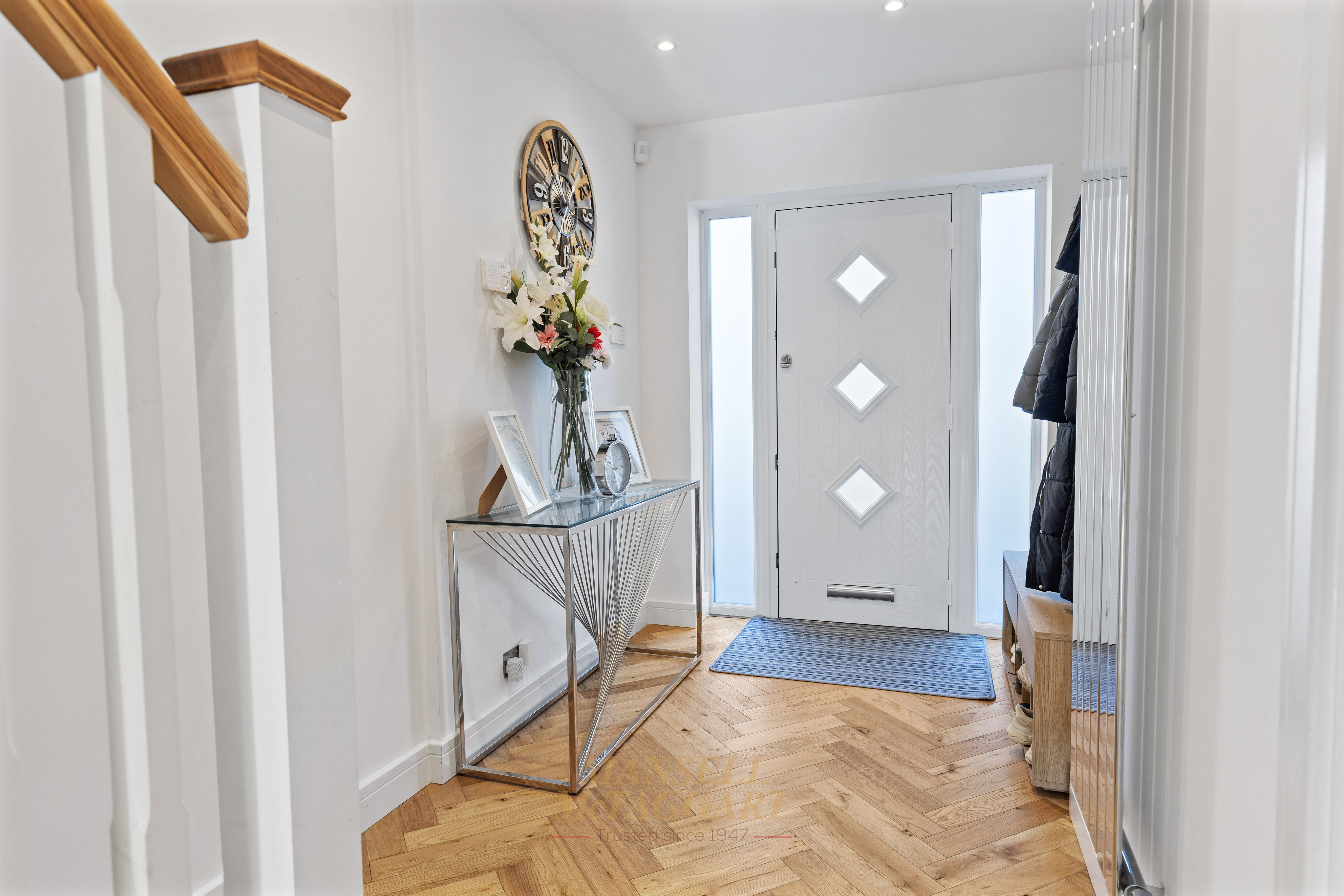 The front door opens into a welcoming and light-filled entrance hall, creating a sense of space from the moment you step inside. Practical under-stairs pull-out storage provides an ideal solution for coats, shoes, school bags, and everyday essentials, while the glazed front door allows natural light to flow through the space. Double doors lead through to the main living room, offering a lovely sense of separation for family evenings or entertaining.