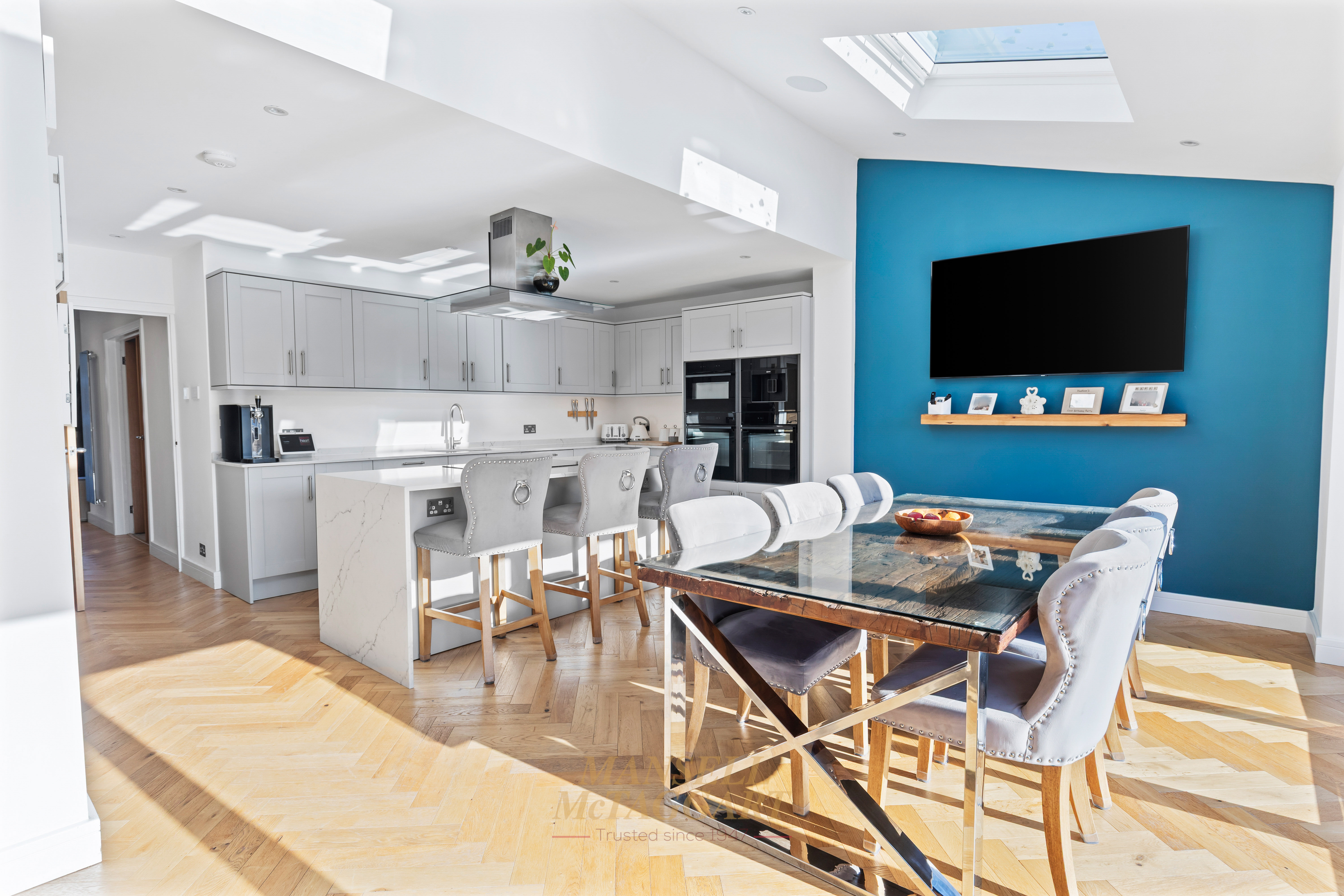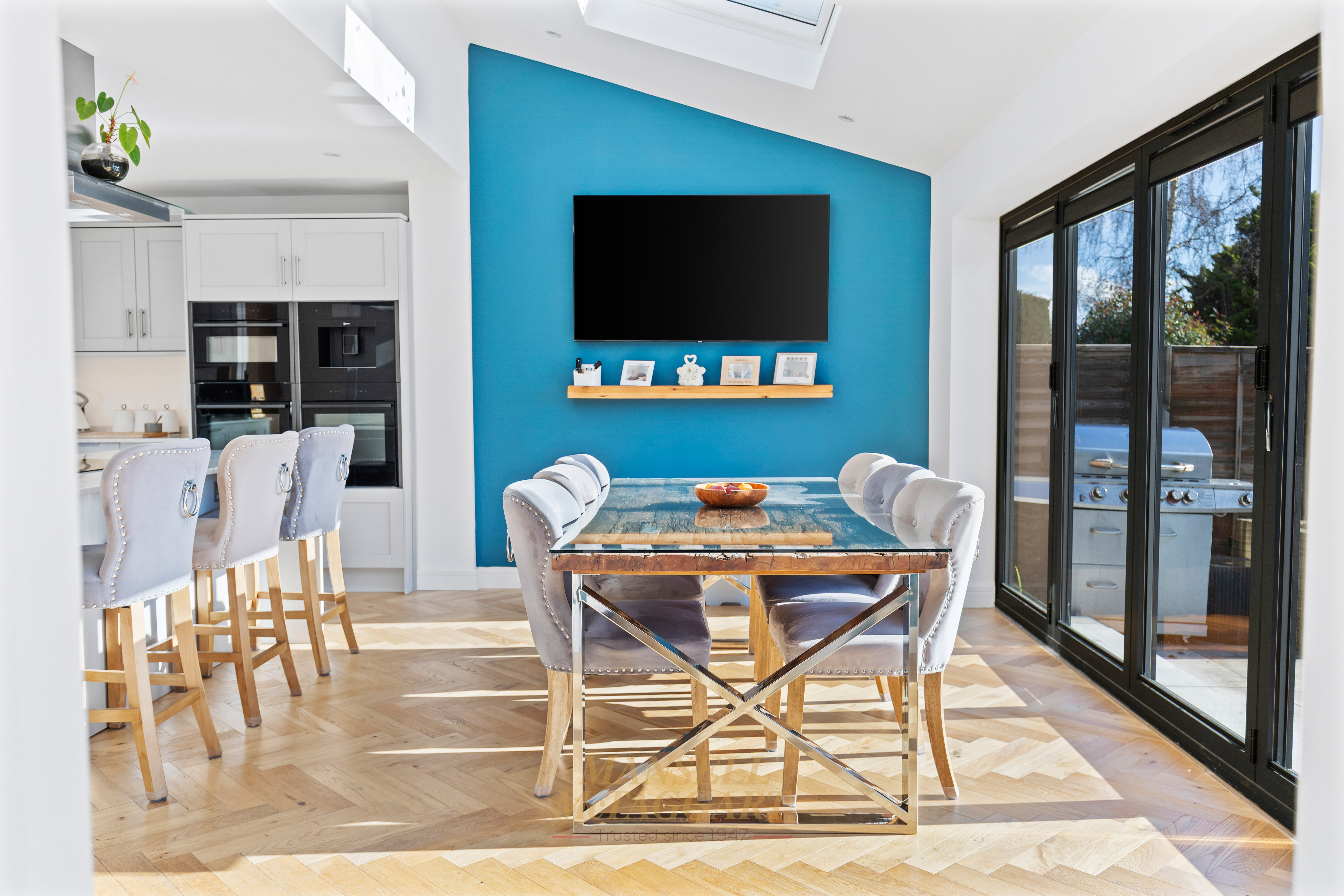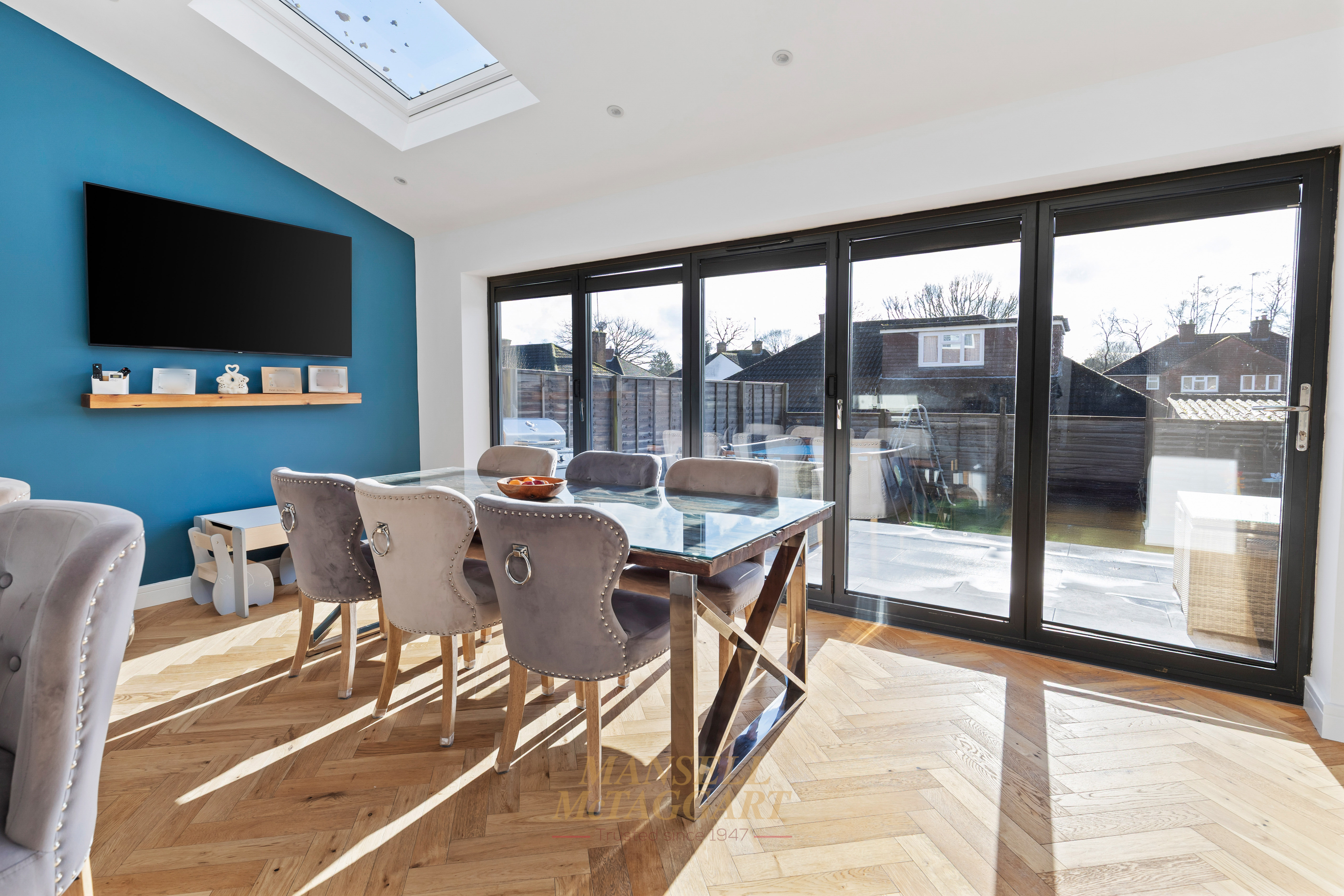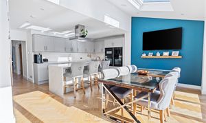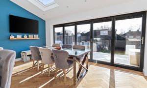 Bi-fold doors open directly onto the rear garden, seamlessly blending indoor and outdoor living, while Velux windows flood the space with natural light throughout the day — creating a bright, airy, and welcoming environment that works perfectly for family meals, celebrations, and entertaining.