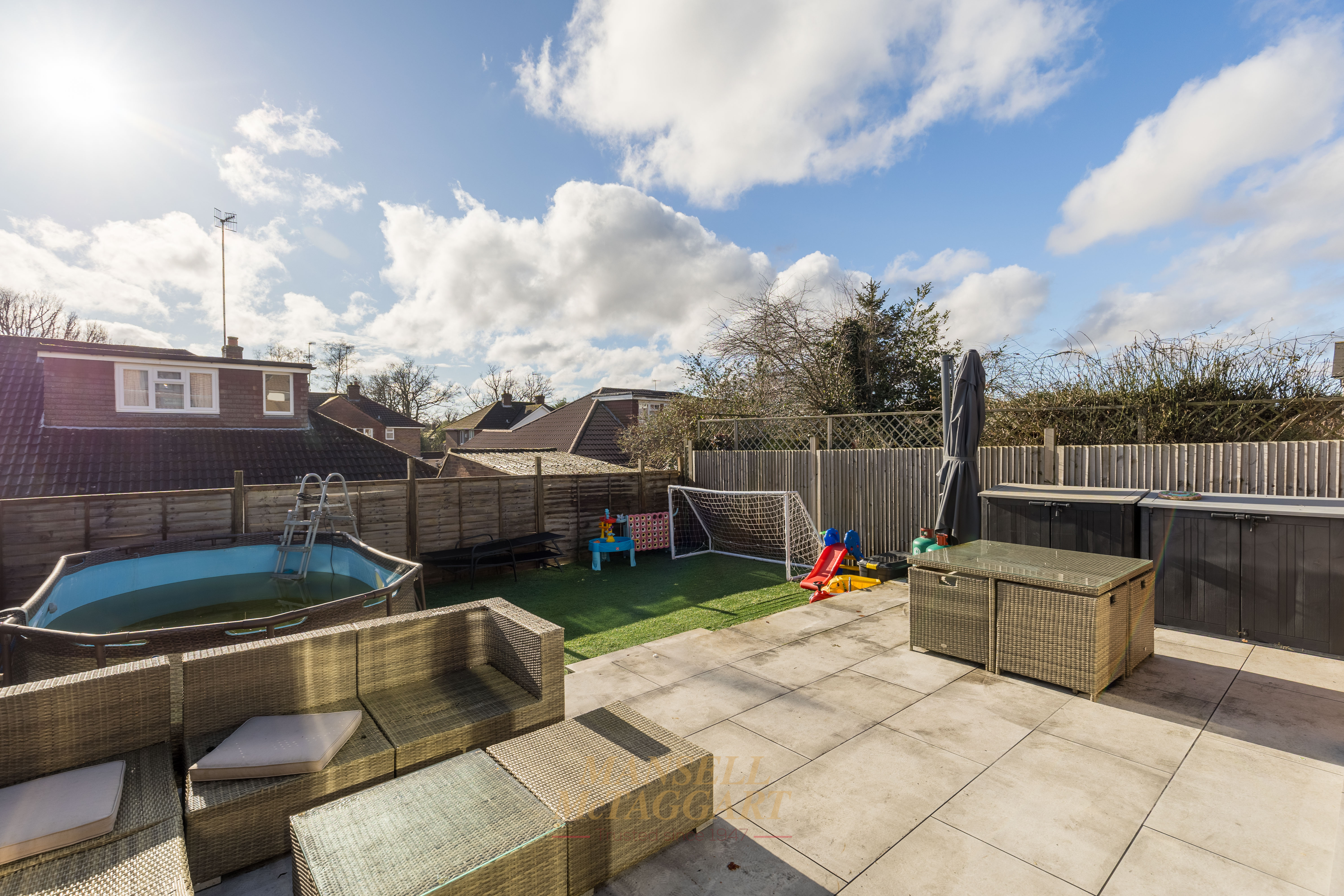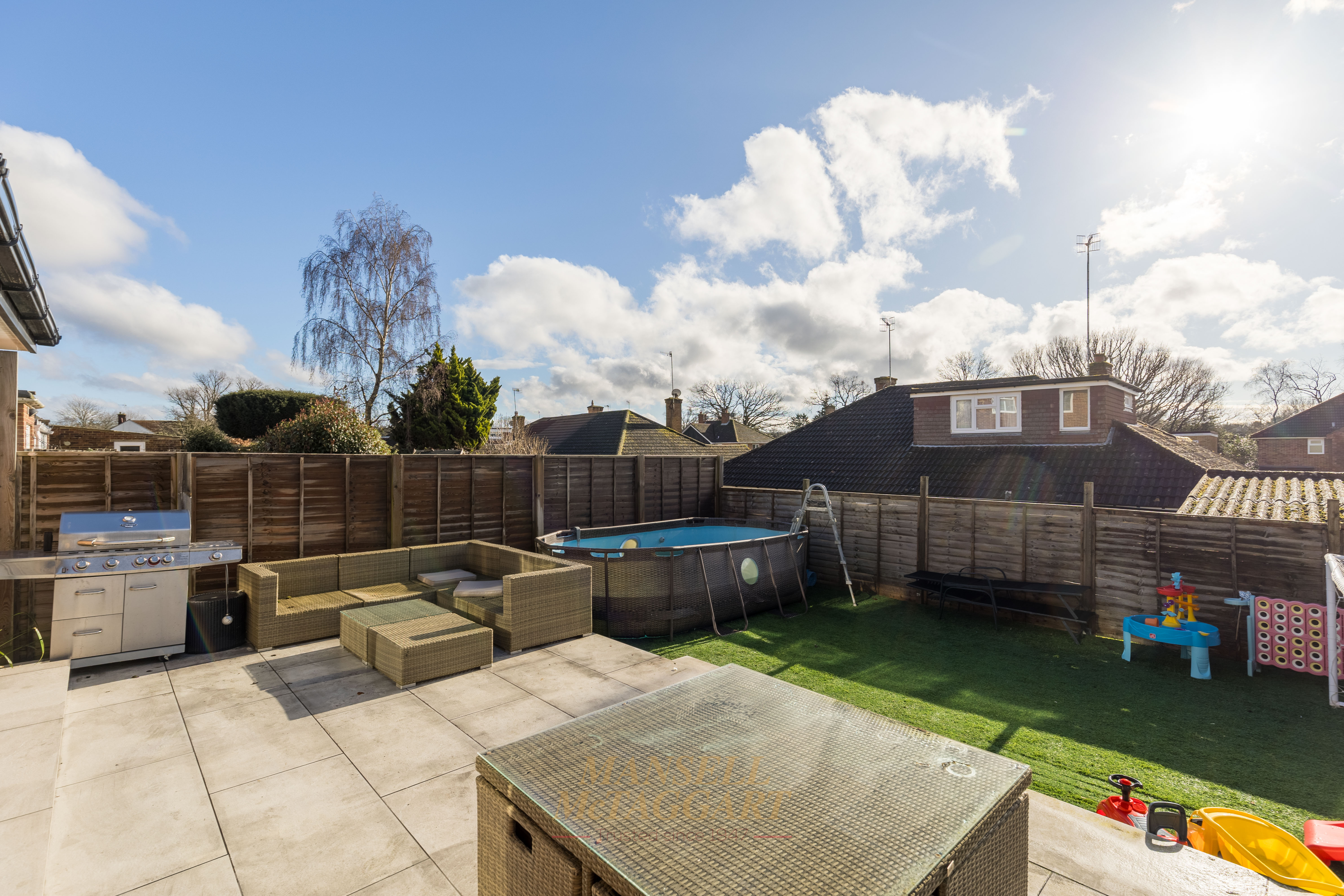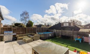 To the rear, the south-facing garden offers a wonderful outdoor space for families to enjoy year-round. A porcelain-tiled patio provides the perfect spot for outdoor dining and entertaining, while the remainder of the garden is laid to low-maintenance Astroturf — ideal for children to play safely with minimal upkeep all year round. The garden is fully enclosed by wooden panel fencing, offering both privacy and peace of mind.