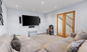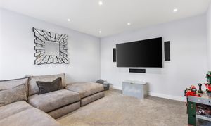 The living room itself is a beautifully presented and generously sized space, complete with inset ceiling speakers and ample room for freestanding furniture, including a large L-shaped sofa. This is an ideal family retreat — perfect for relaxing together, movie nights, or hosting guests in comfort.