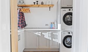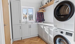 Adjacent to the kitchen is a practical utility room, featuring a rear-facing window, matching wall and base units, marble composite work surfaces, and plumbing and space for both a washing machine and tumble dryer — keeping laundry and household tasks neatly tucked away. The downstairs cloakroom is thoughtfully designed, with an oval hand basin set on a timber-crafted surface, a storage cabinet beneath, and a WC, ideal for guests and busy family life. There is also internal access to the garage, which benefits from light, power, and an electric roller door.