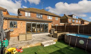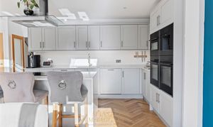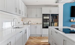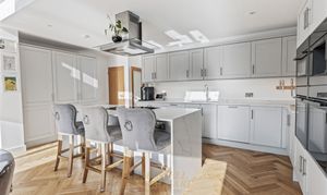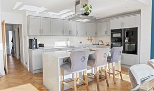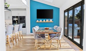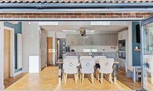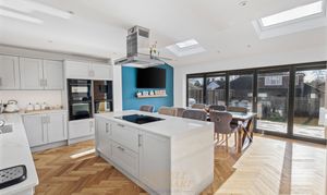 - Large living room- Open plan kitchen/dining room, incorporating an island, and seating for an eight-person table with bifold doors overlooking a south-facing garden